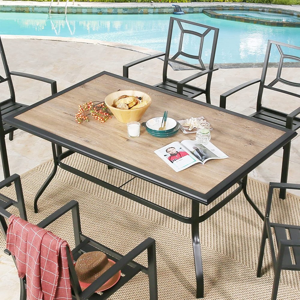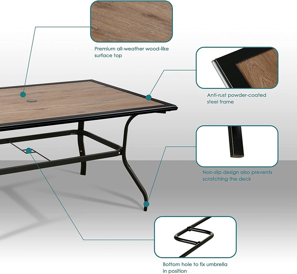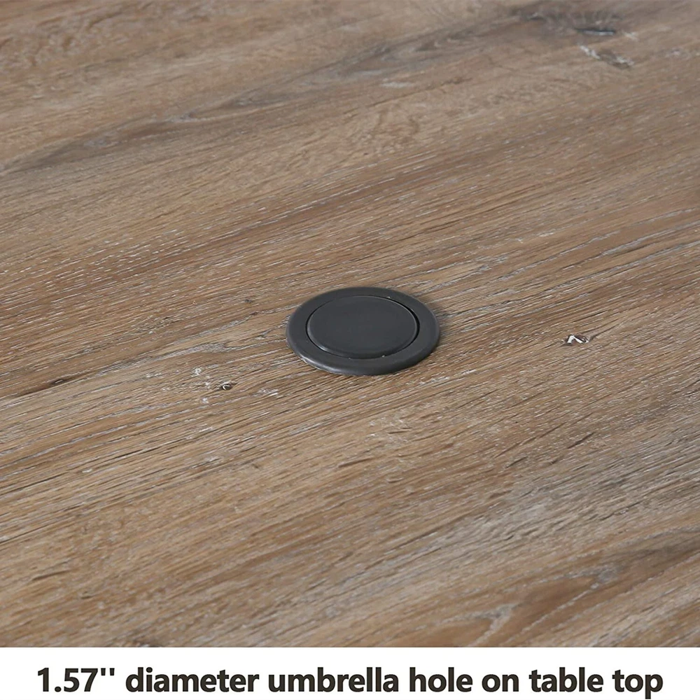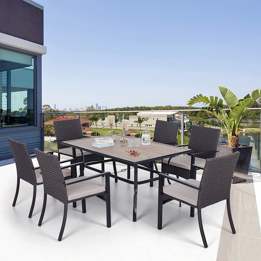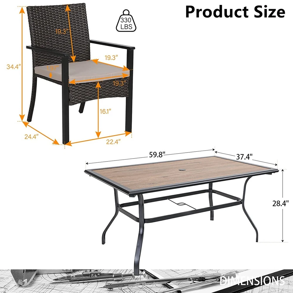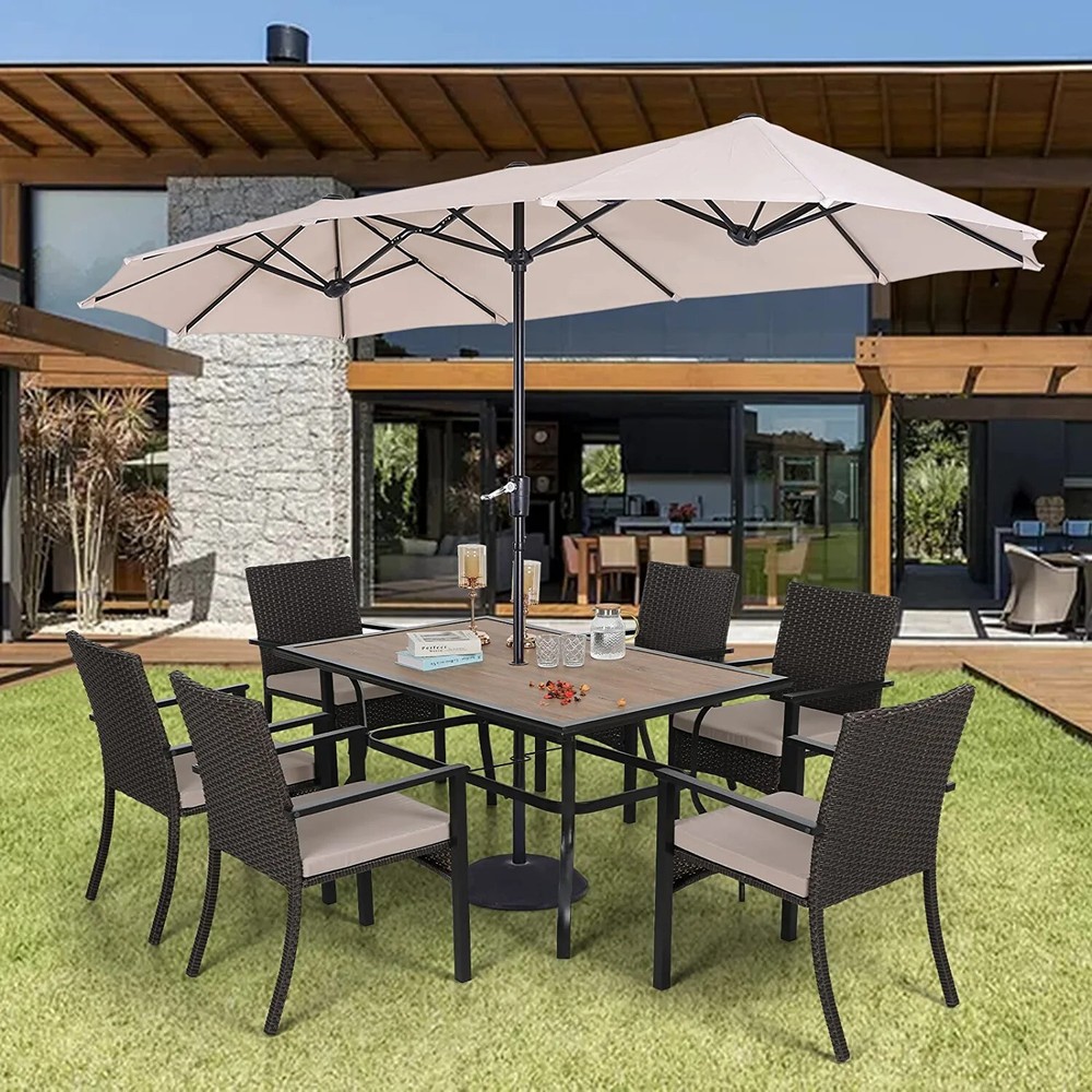 Finish: Metallic Seat Height: 16 in Table Shape: Rectangle For 1: Outdoor Dining Sets Number of Items in Set: Eight-Piece Chair Height: 34.5 in gtin13: Does Not Apply Set Includes: Chairs, Seat Cushion/Pad, Table Model: Patio Dining Sets Style: Outdoor Dining Sets Umbrella Size: 13 ft Assembly Required: Yes Type: Dining Set UPC: Does Not Apply FSC Certified: Yes Chair Color: Dark Brown Material: Metal, Rattan, Wicker Table Height: 28 in Department: Adults Features: Umbrella Hole, UV Protected, Waterproof, With Armrest, With Backrest Tabletop Material: MDF Year Manufactured: 2024 Required Tools: Screwdriver Chair Depth: 19.3 in Chair Back Material: Rattan Chair Width: 22.4 in Table Length: 60 in For: Patio Umbrella Cushions Included: Yes Tabletop Color: Brown Cushion Color: Beige MPN: Does Not Apply Assembly Status: Part Assembled Manufacturer Warranty: 1 Year Umbrella Color: Beige Seat Depth: 19.3 in Color: Dark Brown Umbrella Included: Yes Brand: PHI VILLA Table Width: 37 in Seating Capacity: Up to 6