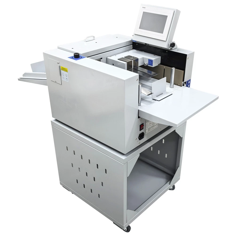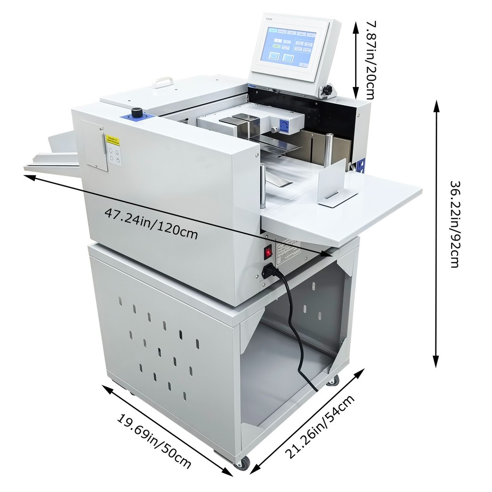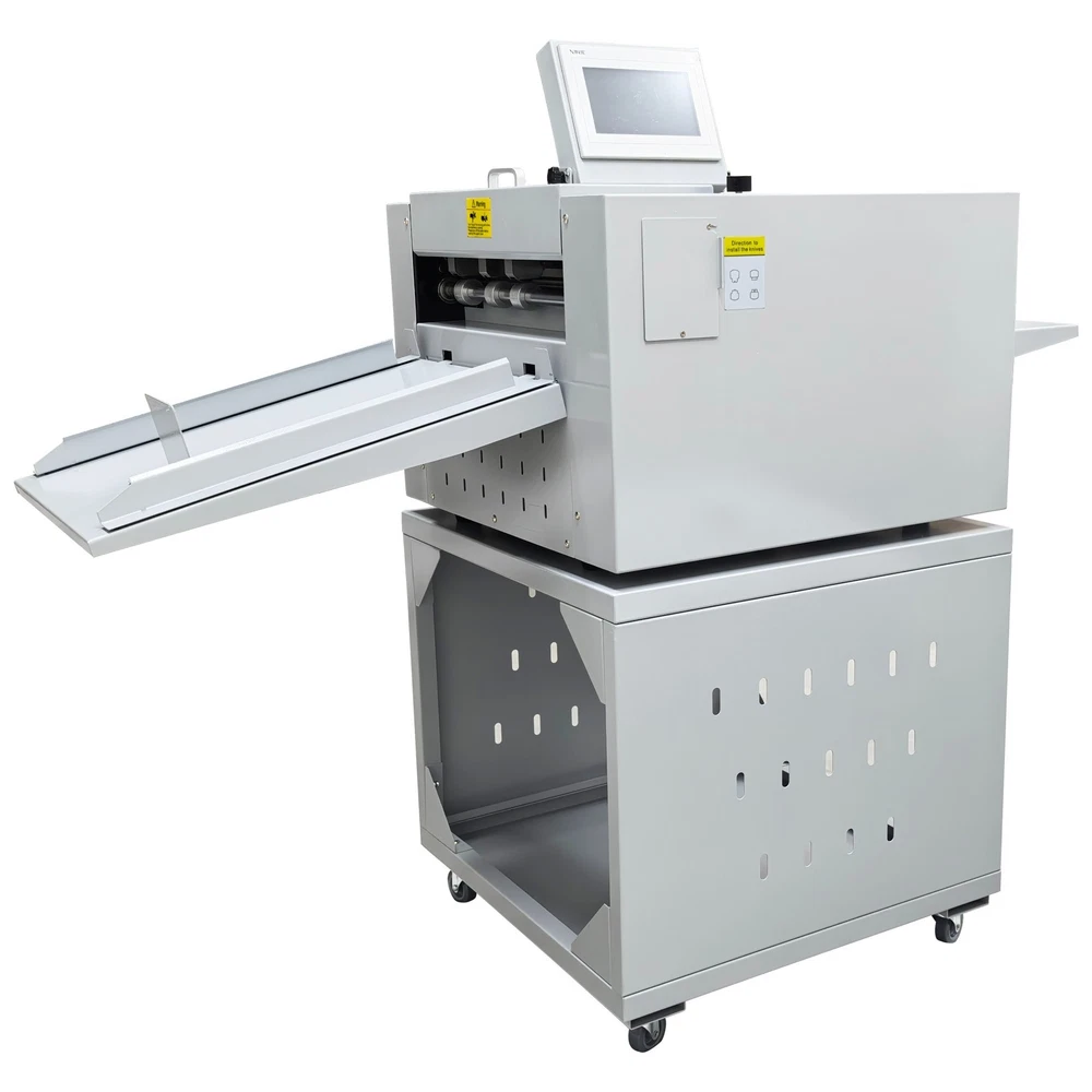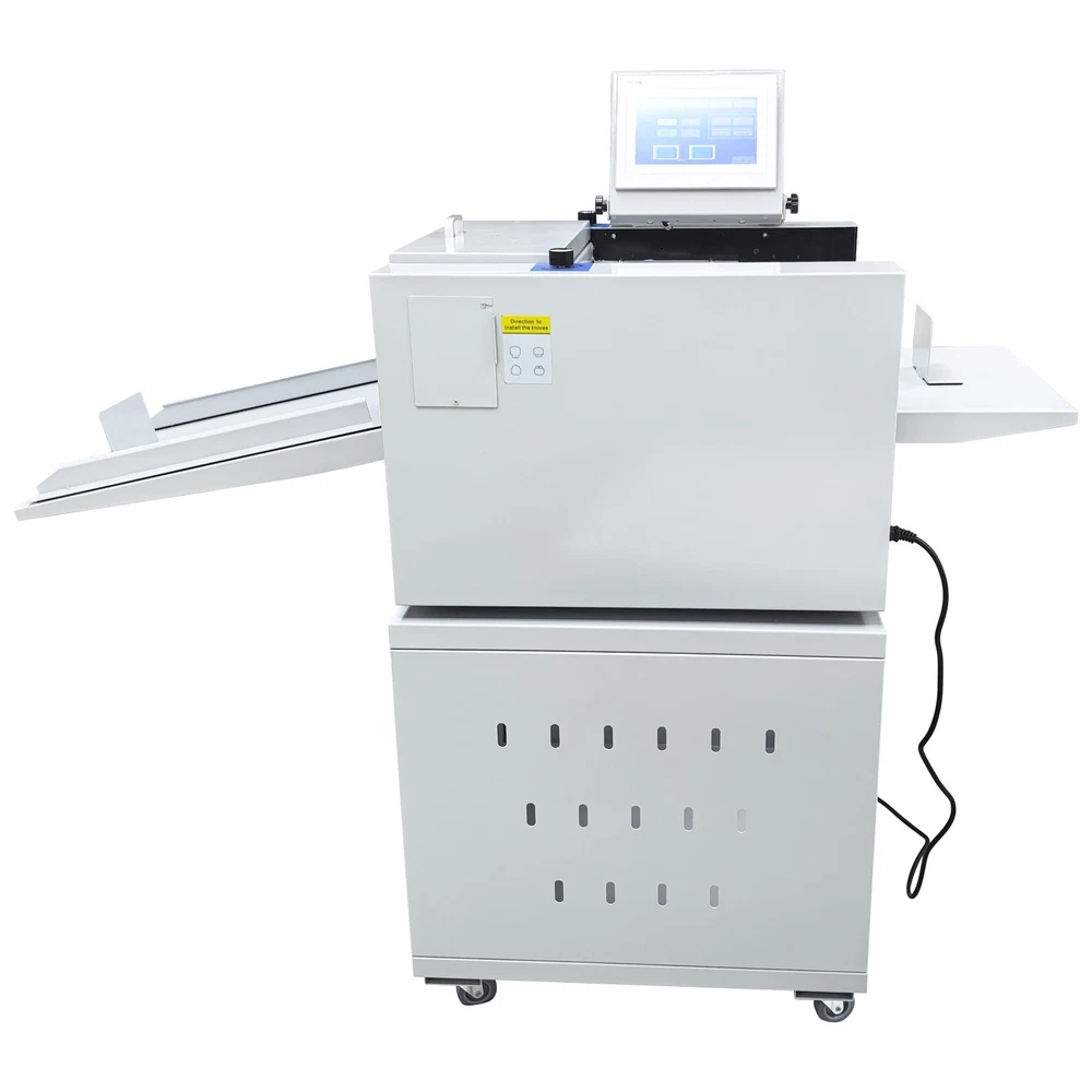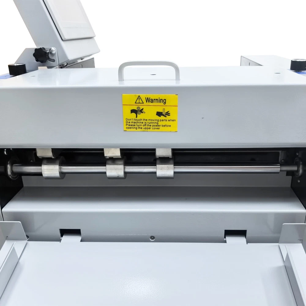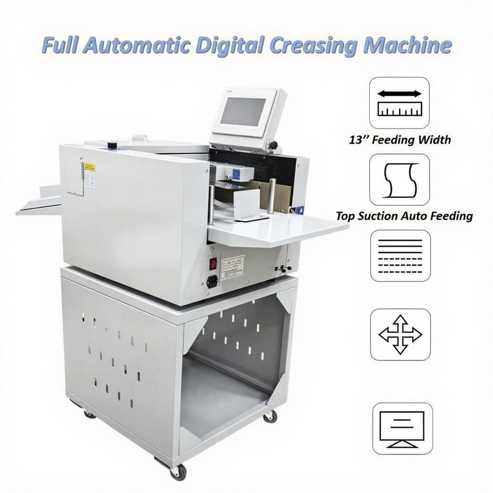 Upgraded 110V 13in Full Automatic Electric Digital Touch Control Creasing and Perforating Machine Top Air Suction Automatic Paper Feeding 2600 Sheets/h Split Structural Design The full automatic digital creasing machine is a professional device for forming creases and dotted lines on different paper sheets such as coated paper, laminated paper and varnish paper. The machine has the advantages of achieving automatic feeding of paper sheets, perfectly integrating the transverse creasing and perforating function and the longitudinal perforating function, saving time and labor, reducing the energy consumption and improving the working efficiency. The electric creasing machine can be widely used in various places such as the printing houses, packing houses and office buildings, and is an ideal product for customers. Parameters Power supply AC110V 60Hz 200W Paper size 210*297mm-330*900mm (8.27''*11.69''-12.99''*35.43'') Paper type Coated paper, laminated paper, varnish paper, etc. Paper loading capacity 60mm (2.36'') Creasing width 1.0mm standard configuration Working precision ± 0.3mm Working speed 2600 sheets/h (A4/one crease) Creasing/perforating times 0-32 times Paper thickness 0.1-0.35mm (creasing), 0.1-0.2mm (transverse perforating) Operation interface Touch screen Paper feeding mode Top air suction automatic paper feeding Net weight 74KG (163.14LB) Tool 3 tool sets (Transverse creasing tool set*1, transverse perforating tool set*1, longitudinal perforating tool set*1) Attention 1. The power supply must be grounded safely and securely. 2. The operator must read the operation manual carefully and be trained before using the machine. 3. Only professionals are allowed to disassemble and repair the machine. 4. Keep the machine away from the inflammable and explosive substances. 5. Ensure that the machine stops before the tool sets are replaced. 6. Do not stop the machine during operation. Do not touch the running parts during operation. Do not put the hands into the machine. Do not allow people or objects to be located next to the running parts of the machine. Product Features Convenient Touch Control The 5'' intelligent touch screen is designed for setting and adjusting the multiple technical parameters, so the color screen touch control and display are well achieved, and different parameters can be tested and adjusted according to the actual condition. The inclination angle of the touch screen can be easily adjusted by the black screws as required, operation is easy and effortless, and the good adaptability is achieved. Automatic Paper Feeding The top air suction automatic paper feeding system is used for automatically feeding paper instead of manual feeding, thereby greatly reducing the manual labor, and improving the working efficiency. The wind blowing port can be controlled to be opened and closed, and the air volume can be freely adjusted through the touch screen to ensure that various paper sheets with different thicknesses can be smoothly fed. Precision Creasing & Perforating The automatic creasing machine is equipped with 3 tools for transverse creasing and perforating and longitudinal perforating operation, thereby achieving the purpose of accurately completing the transverse and longitudinal dotted lines at a time and simplifying the complex operating procedure. The creasing and perforating tools are conveniently installed and stored in a hidden mode, so the safety protection is enhanced, and the service life of each tool is well prolonged. Accurate Skewing Adjustment The knurled rolling wheel is used for adjusting the skewed paper fed by the feeding platform in the working process. When the paper sheets deviate, the operator can rotate the rolling wheel to correct the paper feeding deviation according to the specific skewing direction, so the feeding deviation can be effectively eliminated, and the normal feeding of paper is guaranteed. Effective Paper Separation Control By the use of the paper separation adjusting knob, the paper feeding baffle piece can be accurately adjusted to control the paper feeding number, thereby effectively avoiding simultaneous feeding of multiple paper sheets and ensuring that the paper sheets are fed one by one. The paper separation adjusting effect is better, and precision feeding of paper is greatly facilitated. Stable Paper Pressing & Limiting The automatic creasing machine is equipped with a long paper pressing parts for A3 paper and two short paper pressing parts for A4 paper, so the paper sheets of different specifications can be stably pressed and prevented from moving after being lifted, and the adaptability is enhanced. The paper baffle parts are also designed for limiting the position of paper, thereby facilitating the paper suction and feeding operation. Orderly Paper Collection A large paper receiving tray is detachably hung below the paper outlet and used for receiving and collecting the finished products neatly and orderly. The baffles on the three sides can effectively limit the paper and prevent the paper from scattering after the creasing or perforating operation is accomplished. Independent & Combined Use The automatic creasing machine is composed of a machine body and a cabinet which can be used independently or cooperatively according to the working environments. The stable supporting legs are designed for the machine body so that the machine body can be stably supported and placed on the cabinet. Operation Method 1. Unpack the box, check whether all accessories are intact, and assemble all the accessories. 2. Select the appropriate creasing/perforating tool set as required and install the tool set at the tool chamber. 3. Connect the power cord to the 110V power socket with reliable grounding, and turn on the power switch. 4. Set the technical parameters on the touch screen as needed, and test the creasing/perforating effect. Conduct normal operation if the creasing/perforating effect meets the demand. Adjust the parameters and 