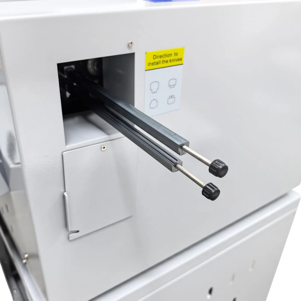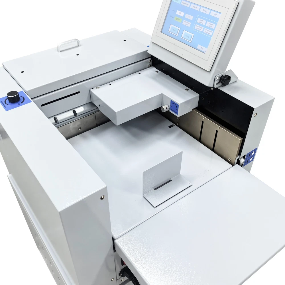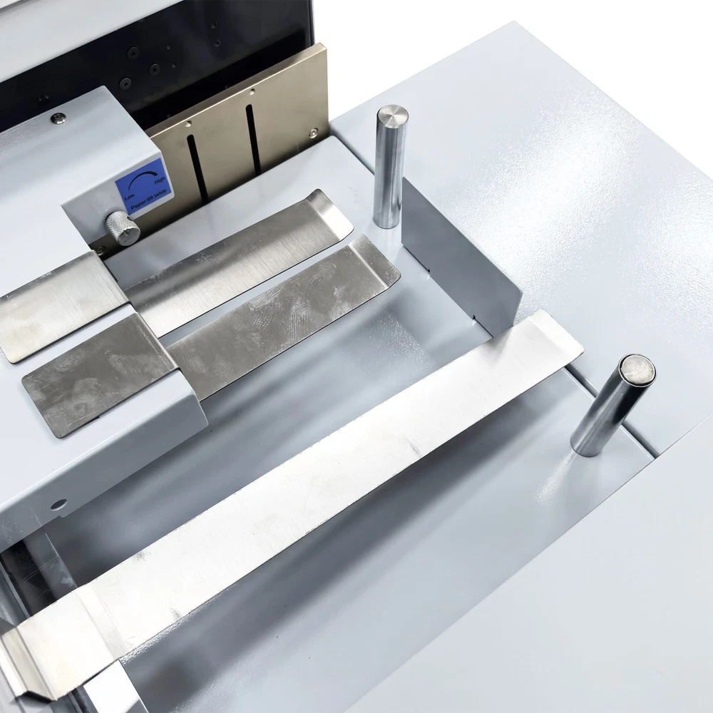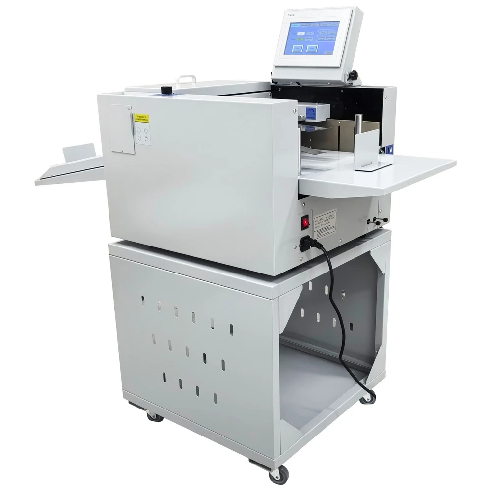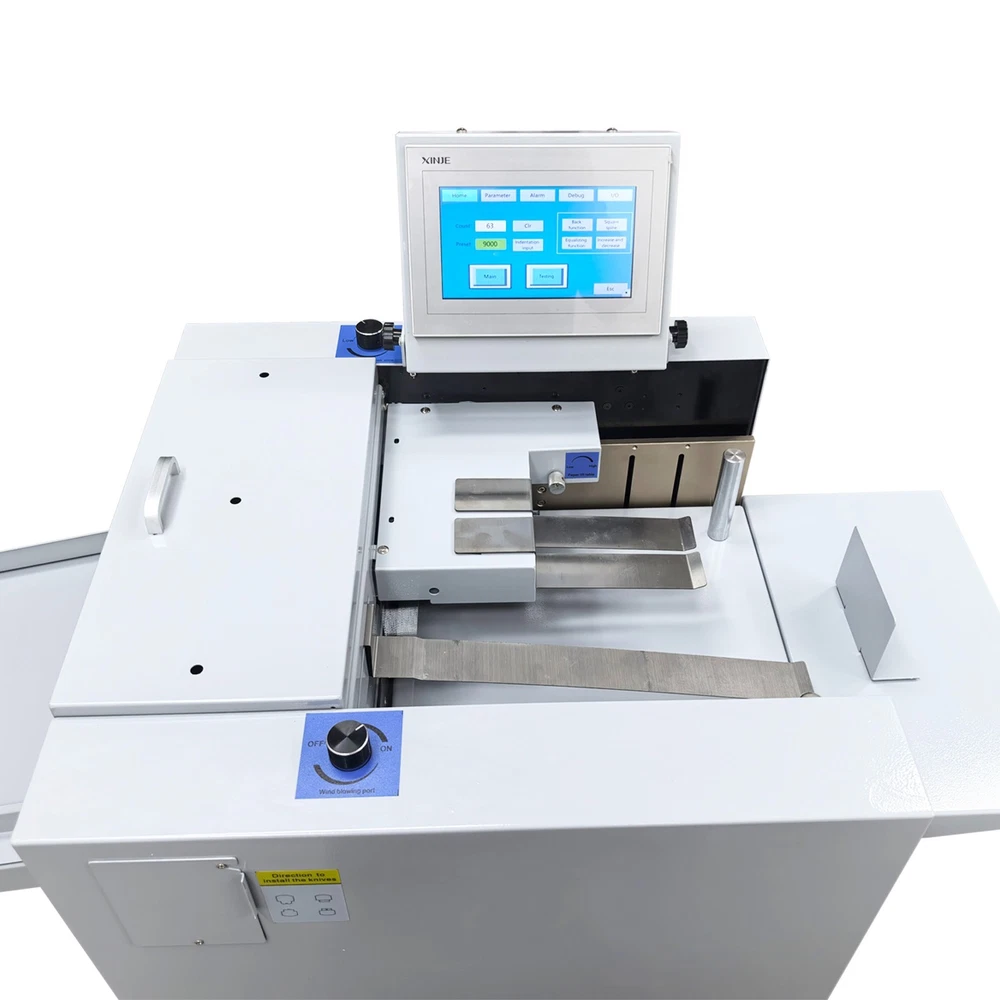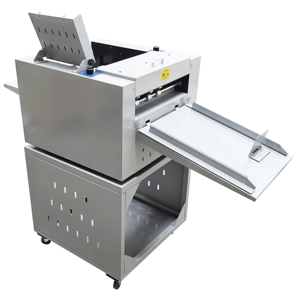 Upgraded 110V 13in Full Automatic Electric Digital Touch Control Creasing and Perforating Machine Top Air Suction Automatic Paper Feeding 2600 Sheets/h Split Structural Design The full automatic digital creasing machine is a professional device for forming creases and dotted lines on different paper sheets such as coated paper, laminated paper and varnish paper. The machine has the advantages of achieving automatic feeding of paper sheets, perfectly integrating the transverse creasing and perforating function and the longitudinal perforating function, saving time and labor, reducing the energy consumption and improving the working efficiency. The electric creasing machine can be widely used in various places such as the printing houses, packing houses and office buildings, and is an ideal product for customers. Parameters Power supply AC110V 60Hz 200W Paper size 210*297mm-330*900mm (8.27''*11.69''-12.99''*35.43'') Paper type Coated paper, laminated paper, varnish paper, etc. Paper loading capacity 60mm (2.36'') Creasing width 1.0mm standard configuration Working precision ± 0.3mm Working speed 2600 sheets/h (A4/one crease) Creasing/perforating times 0-32 times Paper thickness 0.1-0.35mm (creasing), 0.1-0.2mm (transverse perforating) Operation interface Touch screen Paper feeding mode Top air suction automatic paper feeding Net weight 74KG (163.14LB) Tool 3 tool sets (Transverse creasing tool set*1, transverse perforating tool set*1, longitudinal perforating tool set*1) Attention 1. The power supply must be grounded safely and securely. 2. The operator must read the operation manual carefully and be trained before using the machine. 3. Only professionals are allowed to disassemble and repair the machine. 4. Keep the machine away from the inflammable and explosive substances. 5. Ensure that the machine stops before the tool sets are replaced. 6. Do not stop the machine during operation. Do not touch the running parts during operation. Do not put the hands into the machine. Do not allow people or objects to be located next to the running parts of the machine. Product Features Convenient Touch Control The 5'' intelligent touch screen is designed for setting and adjusting the multiple technical parameters, so the color screen touch control and display are well achieved, and different parameters can be tested and adjusted according to the actual condition. The inclination angle of the touch screen can be easily adjusted by the black screws as required, operation is easy and effortless, and the good adaptability is achieved. Automatic Paper Feeding The top air suction automatic paper feeding system is used for automatically feeding paper instead of manual feeding, thereby greatly reducing the manual labor, and improving the working efficiency. The wind blowing port can be controlled to be opened and closed, and the air volume can be freely adjusted through the touch screen to ensure that various paper sheets with different thicknesses can be smoothly fed. Precision Creasing & Perforating The automatic creasing machine is equipped with 3 tools for transverse creasing and perforating and longitudinal perforating operation, thereby achieving the purpose of accurately completing the transverse and longitudinal dotted lines at a time and simplifying the complex operating procedure. The creasing and perforating tools are conveniently installed and stored in a hidden mode, so the safety protection is enhanced, and the service life of each tool is well prolonged. Accurate Skewing Adjustment The knurled rolling wheel is used for adjusting the skewed paper fed by the feeding platform in the working process. When the paper sheets deviate, the operator can rotate the rolling wheel to correct the paper feeding deviation according to the specific skewing direction, so the feeding deviation can be effectively eliminated, and the normal feeding of paper is guaranteed. Effective Paper Separation Control By the use of the paper separation adjusting knob, the paper feeding baffle piece can be accurately adjusted to control the paper feeding number, thereby effectively avoiding simultaneous feeding of multiple paper sheets and ensuring that the paper sheets are fed one by one. The paper separation adjusting effect is better, and precision feeding of paper is greatly facilitated. Stable Paper Pressing & Limiting The automatic creasing machine is equipped with a long paper pressing parts for A3 paper and two short paper pressing parts for A4 paper, so the paper sheets of different specifications can be stably pressed and prevented from moving after being lifted, and the adaptability is enhanced. The paper baffle parts are also designed for limiting the position of paper, thereby facilitating the paper suction and feeding operation. Orderly Paper Collection A large paper receiving tray is detachably hung below the paper outlet and used for receiving and collecting the finished products neatly and orderly. The baffles on the three sides can effectively limit the paper and prevent the paper from scattering after the creasing or perforating operation is accomplished. Independent & Combined Use The automatic creasing machine is composed of a machine body and a cabinet which can be used independently or cooperatively according to the working environments. The stable supporting legs are designed for the machine body so that the machine body can be stably supported and placed on the cabinet. Operation Method 1. Unpack the box, check whether all accessories are intact, and assemble all the accessories. 2. Select the appropriate creasing/perforating tool set as required and install the tool set at the tool chamber. 3. Connect the power cord to the 110V power socket with reliable grounding, and turn on the power switch. 4. Set the technical parameters on the touch screen as needed, and test the creasing/perforating effect. Conduct normal operation if the creasing/perforating effect meets the demand. Adjust the parameters and 