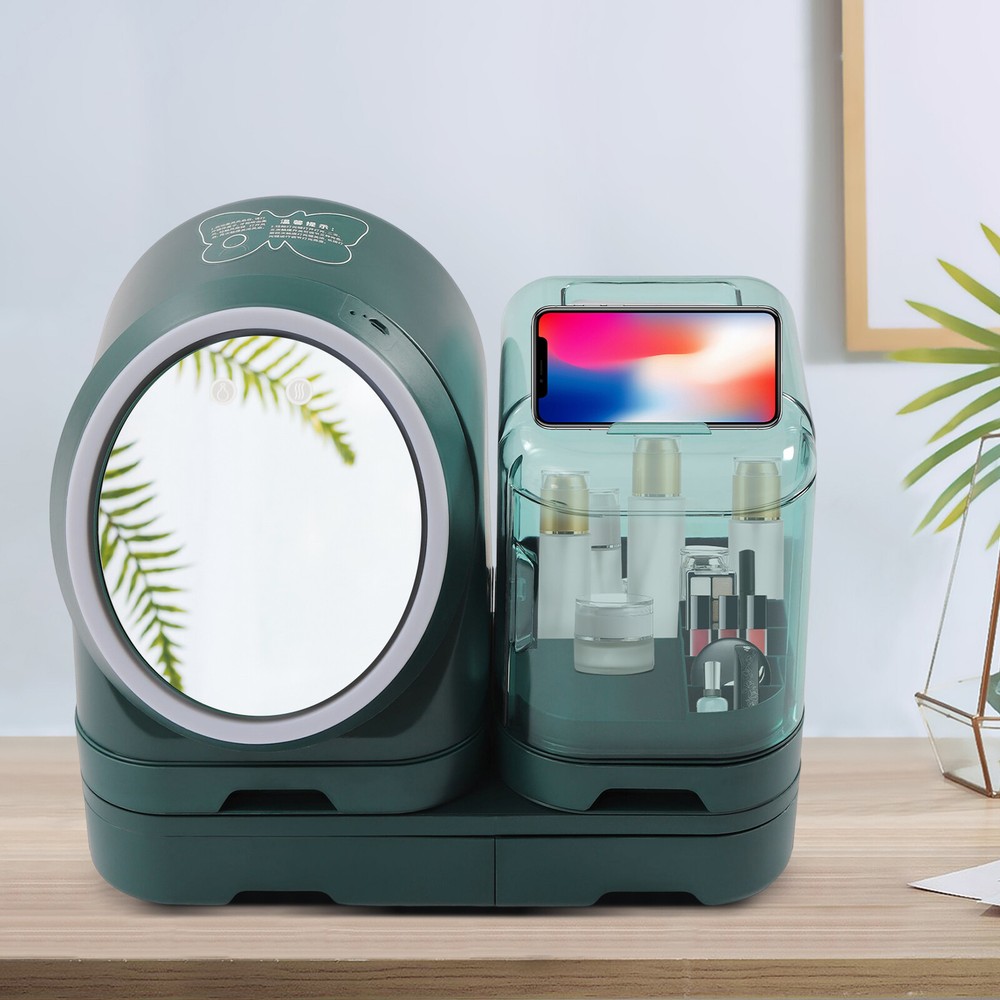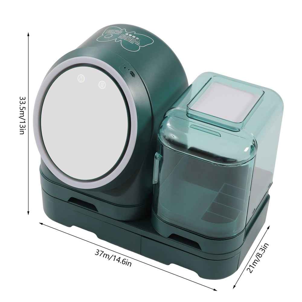 Specifications Material: HIPS and PS Color: Green Style: Modern Light Source Type: 2835 LED Number of Lamp Beads: 120 InternalLength: 23cm/9.06inch 3 Level Led Light: 3200K Warm Yellow Light, 4200K Cool White Light, and 6500K Natural Light Mounting Type: Tabletop Battery Cell Type: Lithium Battery Battery Capacity: 1200mAh Number of Compartments: 4 Service Time: Continuous Use for 1-3 hours, Interrupted Use for about 12 hours Net Weight: 2.7kg/5.95lbs Gross Weight: 2.9kg/6.39lbs Product Size: 37*21*33.5cm/14.6*8.3*13inch Package Size: 40.5*22.5*37cm/15.94*8.86*14.57inch Package Included 1*Makeup Organizer 1* Chinese Instructions 13inch LED light Makeup Organizer 360??Rotating Mirror 1200mAh Battery Capacity Description The exquisite makeup shows our attitude towards life, and the makeup process can let us enjoy ourselves. This makeup organizer can let more people see your beauty. Three different and adjustable light sources can create different styles of makeup for you. The 360-degree rotating mirror also can fully meet your needs. Large capacity provides enough space for you to store skin care products and cosmetics. With this product, your beauty will be further illuminated. Key Features Premium Material: This makeup organizer made of HIPS and PS with good tenacity and rich luster is not easy to split, so you can use it for a long time without frequent replacement. Excellent Light Source: This makeup organizer mainly uses LED light which can achieve 3D three-dimensional light supplements. The 120 light beads are evenly distributed, which can illuminate every inch of the skin and create a more complete makeup. Adjustable Design: Three different lights(warm yellow light, cool white light, and natural light)easily solve the problem of makeup light and create different styles of makeup. In addition, the mirror equipped with a light adjustment button can also rotate 360 ° left and right for optimum angle viewing. You can sit and stand to make up, fully meeting your needs. High Cost-performance: When you receive the product, you can have a make-up mirror, a dimming lamp, a storage box, and a mobile phone holder at the same time, so you don't need to buy them separately, which saves your costs. Split Storage: The makeup organizer is composed of four parts, providing enough space for you to store lipstick, foundation, makeup blush, eye shadow, eyebrow pencil, mask, perfume, jewelry, and other cosmetics. The top of the product can also be used for temporary storage. It is also convenient for you to classify and access items. Built-in Fan: This makeup organizer is equipped with a small fan, and its gentle wind can promote the absorption of water and lotion, save waiting time, make your makeup more comfortable, and reduce makeup loss caused by sweating. You can control it through the buttons on the mirror surface. Beautiful Appearance: The makeup organizer is green, which is a color that will never go out of style, and can match a variety of styles and colors on the makeup table. With smooth lines, the whole product has a sense of modernity and fashion. Ideal Gift: With its beautiful appearance and large storage space, you can give it to your lovers, friends, and family to express your love for them, and it can also be regarded as a holiday gift, such as Valentine's Day and Christmas. Easy to Clean: The makeup organizer has a smooth surface and a proper size of 14.6*8.3*13inch, so you can clean it directly with a towel after a period of use. Ready to Use: The makeup organizer does not need to be assembled. You can use it directly after receiving the goods, which saves you time. Life Assistant: With this product, you can say goodbye to messy and unordered storage, creating a clean environment and a better makeup experience for you. Sufficient Energy: The battery capacity is 1200mAh, so it can be continuously used for 1-3 hours, and interruptedly used for about 12 hours after being fully charged, making it especially suitable for use on the go. Details Grooves: The back of the makeup organizer and the smooth drawer are both provided with grooves, through which you can easily move the makeup organizer, and store and take cosmetics. Mobile Phone Holder: This design allows you to make full use of your time. You can also watch your favorite TV play when making up, making the makeup process more pleasant. Round Corners: This makeup organizer is designed with rounded corners. Compared with the traditional square corners, it can better protect your safety and prevent skin from being scratched. Interior Heightening Area: The height of 23cm/9.06inch allows the makeup organizer to hold most bottled skin care products and is convenient for you to take items. Transparent Dust Cover: This transparent dust cover protects your skin care products and cosmetics from dust. In addition, you can easily see the items inside. HD Mirror: This mirror with multiple functions is not only conducive to controlling the brightness and fan but also can provide you with a more delicate and even makeup. Application This product is suitable for storing cosmetics and skin care products.it can be widely used in desktops, countertops, bathrooms, offices, dormitories, living rooms, bedrooms, dressing rooms, vanity organizers, travel, etc. Notes 1. Please use it on the table with an inclination of no more than 6 degrees to prevent it from toppling. 2. Please do not disassemble or bump the battery. Do not squeeze or put it into the fire. In case of mass production expansion, please do not continue to use it. Do not expose the battery to high temperatures. When the battery energy is low or there is no power, the switch button will not light up and close normally. Please charge it in time. 3. After starting the soft air fan, please open the mirror cover to blow out the soft air. Touch the fan key to turn on the fan, and touch it again to turn off the fan. 4. Touch the light key to turn on the light. Touch the switch twice or three times t