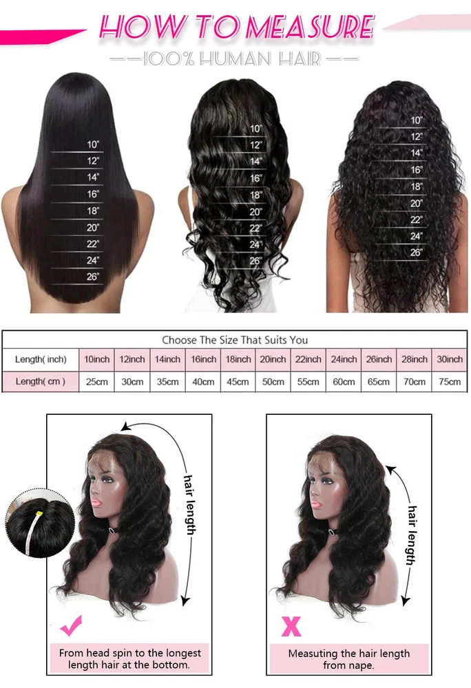Product Information Hair Sytle: Curly Wig Density: 150% 180% 250% With Pre plucked Hairline Hair Color: Natural Color / 1B# Lace Color:Medium Brown Hair Weight:150-250G/Pieces Material:100% Human Hair Without Chemical Processed,Can be Dyed/Ironed by your favor, Bleach/Dye Friend Life Time:Last more than 12 months Delivery Time:DHL/Fedex/UPS/ePacket Available,Normally 2-7 Working Days Cap Size:Average Size Suitable For Most People(Can provide bigger/smaller cap or other special customization) Product Details The Correct Measure Method Please stretch the hair and measure it from the hair weft to the hair ends. The correct method: Choose a wisp of hair and stretch it to straight, then measure it from the weft to the ends to get the correct length.