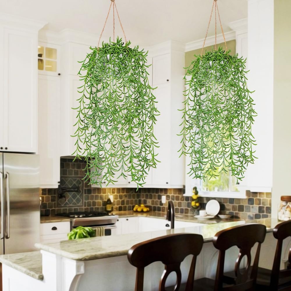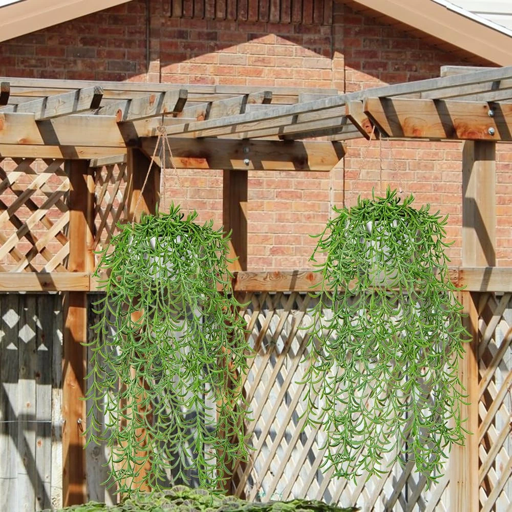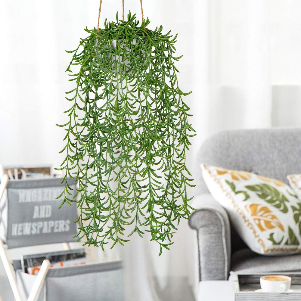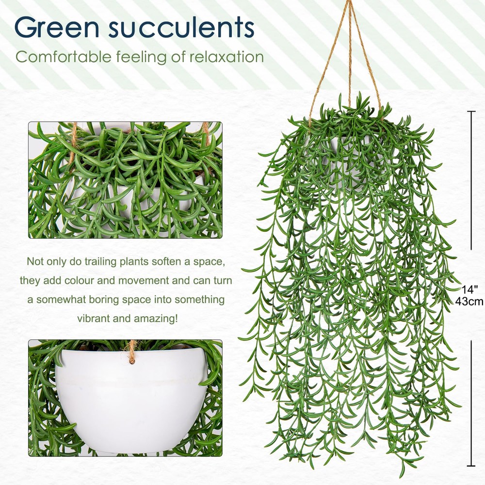 Othonna Capensis Fake Hanging Plants Artificial Decor Plants Dize: 14 in (L) Pot Size: 4.3 in (L) x 4.3 in (W) x 3 in (H) Design: Artificial Hanging Greenery + White Pot Material: Plastic/Hemp Rope/Natural Stone Package includes: 1 x Faux Hanging Plant with Pot -Made from high-quality materials that look and feel like the real thing, these hanging faux plants indoor are designed to provide a lifelike look without any of the maintenance. -Use these artificial hanging succulents plants to decorate your living room, bedroom, bathroom, or office, or add them to your porches, outdoor patio for a splash of green. Enjoy the beauty of trailing greenery without any hassle. Require much less care. You won’t have to remember to water. Survive any type of weather. Perfect compromise for pet owners. Idea for your home office hotel decor, housewarming/promotion gift. [Artificial Hanging Plants] -The hanging plant pot is 4.3"L x 4.3"W x 3"H. The hanging artificial plant measures approximately 14" tall from the bottom to the top of the pot. Vibrant green vines of varying lengths can form dense cascades, turning your space into a lush, green oasis! [Realistic Indoor Hanging Plants] -Hanging fake plant are made with high quality PE material, providing a high degree of realism that is better than other PVC material. From a distance or up close, these hanging succulents plants artificial are similar to real plants. [Stunning Home Decor] -Our hanging faux plants are suitable for indoor wall decoration, bathroom aesthetic, bedroom, party and wedding. The faux hanging plant can be hung in the living room, corridors, porches, cafes, stairs, outdoor garden house decoration. [Easy to Clean and Maintain]-Enjoy the beauty of plants life without the need for watering, fertilization, or sunlight. Fake succulents hanging plants require minimal maintenance, just wipe with a damp cloth to remove dust, and the will remain fresh and beautiful year after year. [Satisfaction Guaranteed]-Treat your home and brighten up each corner with these unique and beautiful artificial string of pearls plant with our risk-free purchase! Should you need any assistance, our helpful after-sales service center is always here for you!