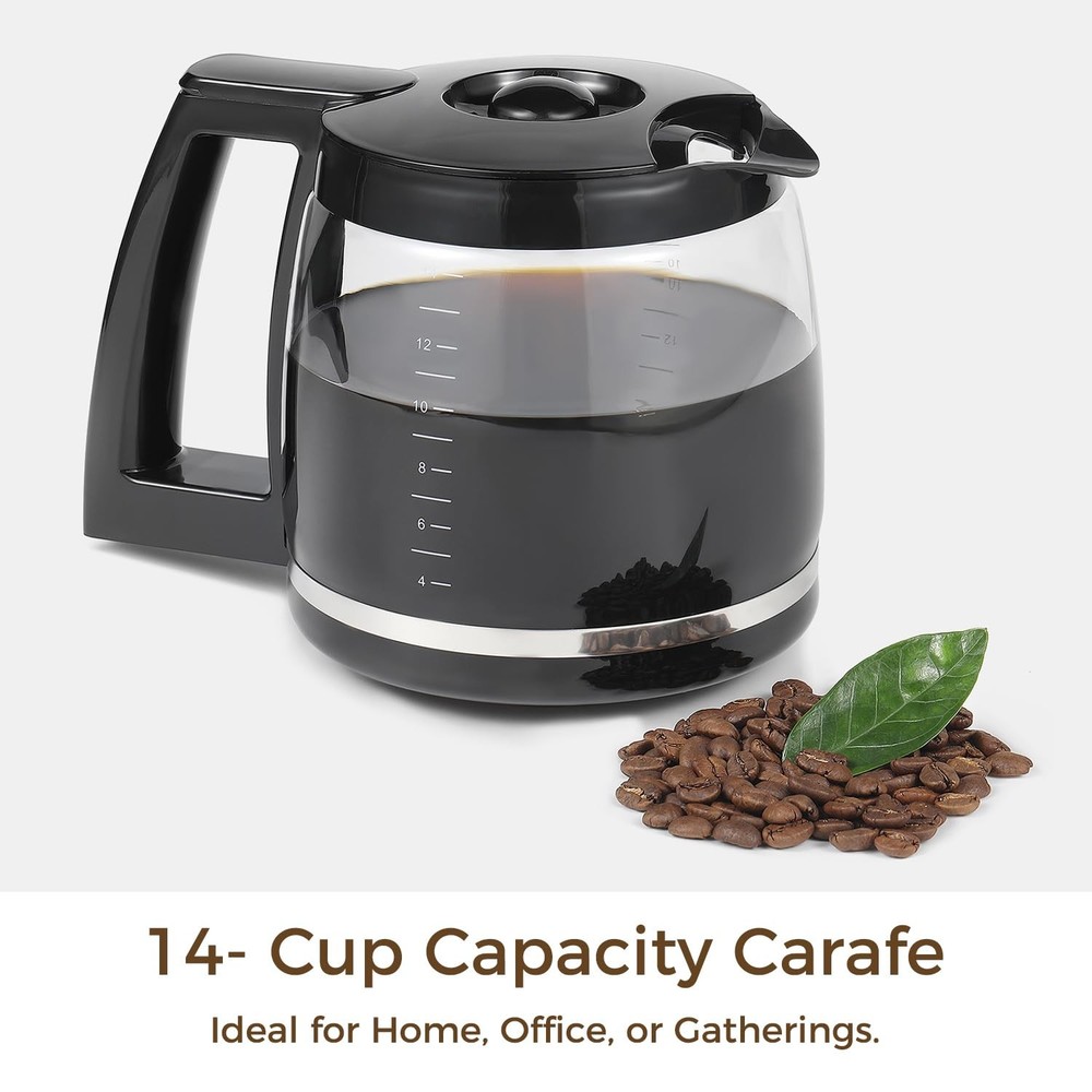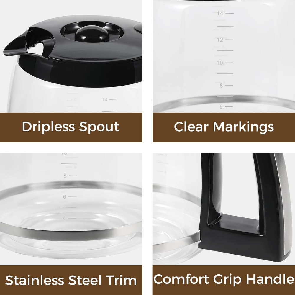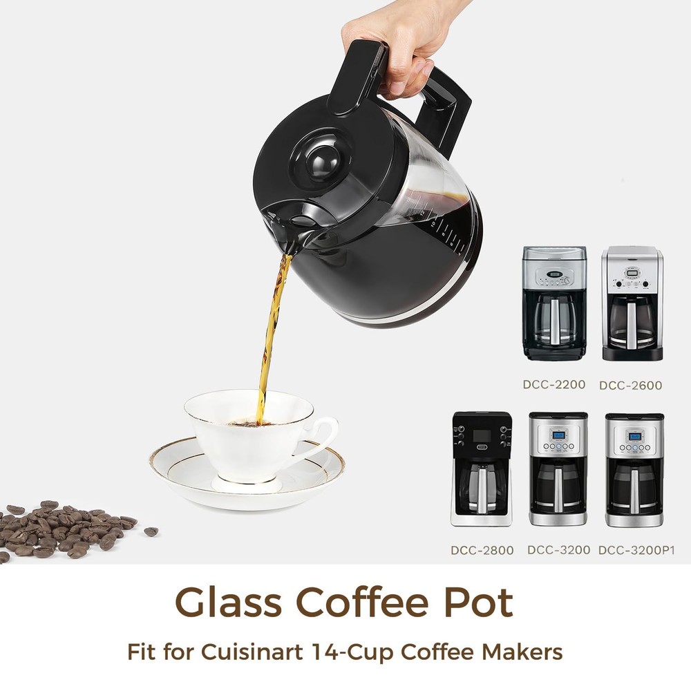 Product Description: Our 14-Cup replacement glass coffee carafe is the ideal solution when you need a new or spare carafe. Made from heat-resistant glass, it keeps your coffee hot while preserving its rich flavor. The ergonomic handle and easy-pour spout ensure smooth and drip-free pouring. With a 14-cup capacity, it’s perfect for gatherings, meetings, or daily coffee enjoyment. This glass coffee carafe replacement is compatible with models like DCC-3200, DCC-3200P1, DCC-2200, DCC-2600, and DCC-2800, and more. Enhance your coffee experience with this durable and practical 14-cup coffee carafe replacement. Why Choose Our 14 Cup Replacement Glass Coffee Carafe? Whether your original carafe is broken or you're simply preparing a backup, our replacement carafe offers the same high-quality experience as the original. Its durable construction ensures long-lasting, reliable use, while the transparent glass design allows you to easily monitor the brewing process, ensuring a perfect cup of coffee every time. Glass Coffee Pot Fit for Cuisinart 14-Cup Coffee Makers – Specifically designed to be compatible with Cuisinart models like DCC-3200, DCC-3200P1, DCC-2200, DCC-2600, and DCC-2800. Ensures a seamless fit for hassle-free brewing. Premium Heat-Resistant Glass – 14 cup coffee pot replacement made from high-quality, BPA-free glass, this carafe withstands high temperatures while maintaining coffee’s optimal flavor and aroma. Ergonomic & Drip-Free Design – Coffee maker carafe replacement features an easy-pour spout and a sturdy, comfortable handle for smooth, spill-free serving. Ideal for home, office, or gatherings. Clear Measurement Markings – DCC-3200/DCC-3200P1 replacement carafe 14 cup coffee maker pot conveniently marked measurements help you brew the perfect amount of coffee every time, reducing waste and ensuring precise servings. Easy to Clean & Dishwasher Safe – Designed for effortless maintenance, this 14-cups replacement carafe is dishwasher-safe and easy to hand wash, making cleanup a breeze.