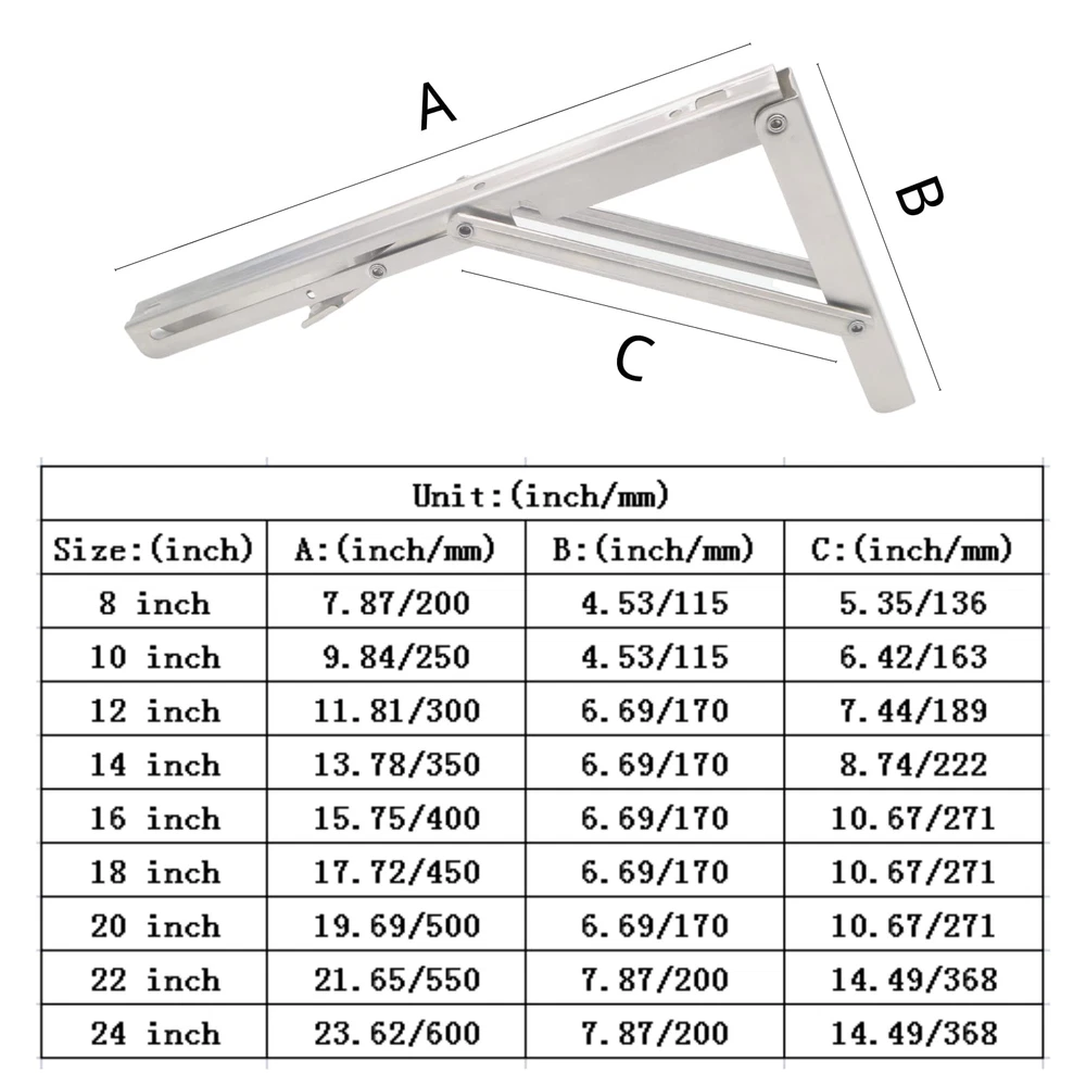 More Sturdy:The folding shelf bracket slide reinforced and widened,stronger than ordinary slide to prevent deformation,rivets using strong performance chain nails to prevent rivets from falling off. More Durable:The folding shelf brackets heavy duty is made of high quality stainless steel,with good corrosion resistance and rustproof performance.High-quality brushed stainless steel, no need to paint,more durable and healthier. Good Quality:The folding table bracket is 90 degrees,the surface is flat;the edge of the collapsible shelf bracket is smooth to prevent scratching;the folding switch is extended to avoid wall wear. More Size & Widely Used:Dimensions of the foldable shelf bracket:8 inch-24 inch,Sturdy triangular construction,Max load: 550 lb,These shelf bracket are perfect for many home DIY jobs.Could be used to make a folding workstation in your garage,stores,workshops,boats,motorhome,backyard,trailer,room, kitchen,balcony,bathroom. Quality Assurance:Free lifetime technical support.If you have any problem with the goods you received,please contact us by email as soon as possible,and then we can solve your problem quickly.So,please just enjoy this absolutely risk-free purchase.