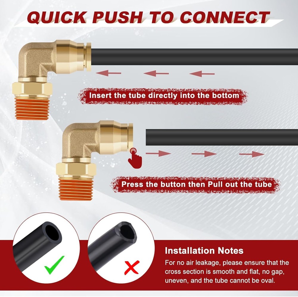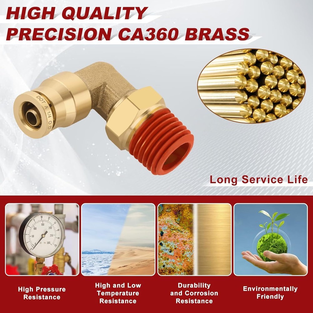 1/4" Quick Push to Connect Fittings Brass 90 Degree Union Swivel Elbow Joint DOT 【High Quality Precision Brass】LONG SERVICE LIFE - 1/4" Tube OD x 1/4" NPT Thread 90 Degree Elbow DOT approved fittings are made of high quality solid CA360 brass with red sealent coated, durability and corrosion resistance. Withstands pressures up to 250psi, and wide temperature range from -40℉ to 160℉(-53℃ to 121℃) 【Quick Push to Connect】PTC (Push-to-Connect) design for quick and easy connection and disassembly to air lines, just insert the tube directly into the air tube bottom for connection, and press the button then Pull out the tube for disassembly 【DOT Approved】Meets D.O.T. FMVSS 571.106 approved, SAE J1131 air brake system requirements. For no air leakage, when installing our air suspension kit, please ensure that the cross section of the air line is smooth and flat, no gap, uneven, and the tube cannot be oval 【360° Free Rotation】The connecting part can be rotated 360 degrees, allows you easier to install and use. Even after installation, just rotate the joint body to adjust the direction Shipping We offer FREE shipping on all orders! We ship within Three business days of payment, usually sooner. We use a selection of shipping services such as UPS, FedEx, USPS etc. We only ship to the lower 48 states, no APO/FPO addresses or PO Boxes allowed. Local pickups and combined shipping options are not provided at this time. Return You can return a product for up to 30 days from the date you purchased it. Any product you return must be in the same condition you received it and in the original packaging. Please keep the receipt. Customer satisfaction is very important to us. If you have any problem with your order, please contact us and we will do our best to make you satisfied. Contact Us If you have any queries, please contact us via ebay. We usually respond within 24 hours on weekdays. Please visit our eBay store to check out other items for sale! Thank you for shopping at our store.
