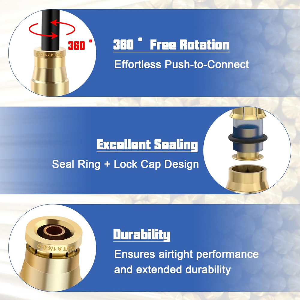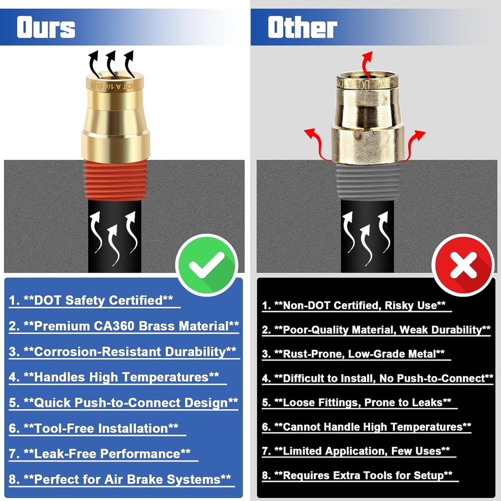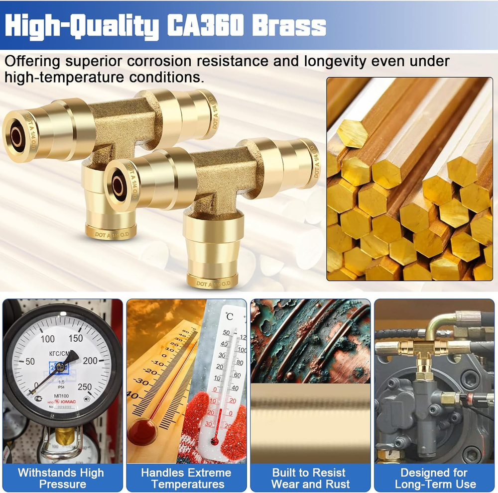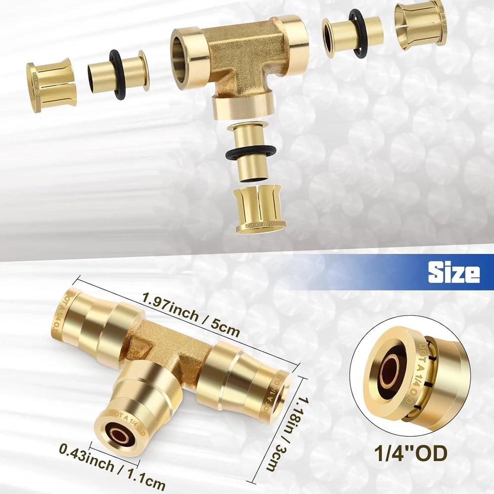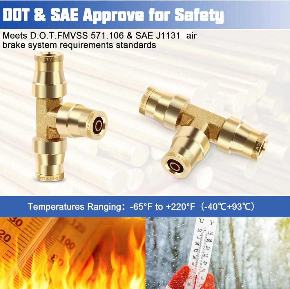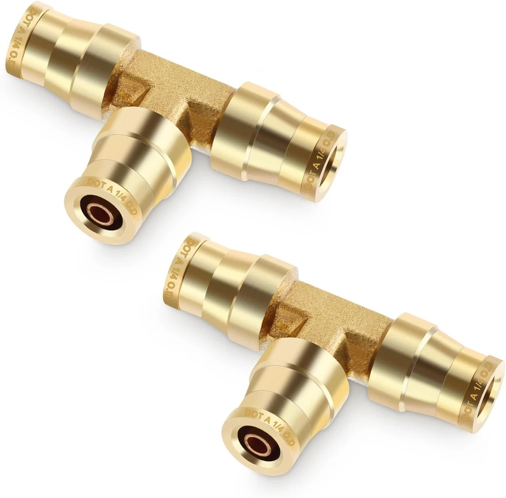 Store New Arrivals Add to Favorite View Feedback 1/4" OD DOT Tee Union Push to Connect Fittings, 1/4" DOT Brass Air Brake Line Fittings Tee Union Air Fittings Tube Adapter for Car Truck Trailers Air Brake System and Industrial Use, 2PCS Description Item model number 2pcs 1/4" Tee Part Number 2pcs 1/4" Tee Item dimensions L x W x H 3 x 3 x 1 inches Size 2pcs 1/4"OD Tee Number of Pieces 2 Color 2pcs 1/4"OD Tee Brand Lumanious Material CA360 Brass Country of Origin China Connector Type Union Style Air Line Fitting Item Weight 2.39 ounces Thread Type NPT Batteries Required? No Batteries Included? No Manufacturer Lumanious Exterior Finish Brass Product Dimensions 3 x 3 x 1 inches Included Components 2pcs 1/4" OD Tee 【2PCS Premium Brass Tee Unions for Air Brake Repairs】Includes two top-grade 1/4" tee union fittings designed for secure, leak-free connections, making air brake repairs faster and more reliable. 【DOT & SAE Certified for Maximum Safety】Engineered to meet D.O.T. FMVSS 571.106 and SAE J1131 standards, ensuring dependable performance in air brake and suspension systems for vehicles and industrial use. 【Durable CA360 Brass for Longevity】 Made from high-quality CA360 brass, these fittings provide excellent corrosion resistance and withstand high temperatures for extended service life. 【Effortless Push-to-Connect with 360° Full Adjustability】Features tool-free push-to-connect installation and 360° rotation for easy adjustments, even in confined or hard-to-reach areas. 【Reliable Performance Across Extreme Conditions】Handles vacuum to 300 PSI and operates in temperatures from -65°F to +220°F, delivering consistent performance in demanding environments. 【Applications for Various Needs】Perfect for air brake systems, RVs, industrial pneumatic setups, and air suspension repairs, offering flexibility and reliability for multiple uses. Product Description The video showcases the product in use. The video guides you through product setup. The video compares multiple products. The video shows the product being unpacked. Brass DOT Tee Union Brass DOT Straight Union 360° Free Rotation The push-to-connect design allows for effortless, tool-free installation with 360° adjustability in tight spaces. Premium CA360 Brass Made from high-quality CA360 brass, these fittings provide excellent corrosion resistance and withstand high temperatures for extended service life. Reliable Performance Handles vacuum to 300 PSI and operates in temperatures from -65°F to +220°F, delivering consistent performance in demanding environments. DOT PUSH-IN Engineered to meet D.O.T. FMVSS 571.106 and SAE J1131 standards, keeping your brake system safe and dependable. ABOUT US We offer the best prices around on high quality products. Our E-store includes media such as books, movies, music and games while offering electronics, toys, sporting apparel, clothing, tools, general home, garden items and more. SHIPPING We are always working hard to ensure your package arrives as soon as possible. Please understand that some factors like weather, high postal traffic, and the performance of shipping companies are outside of our control. We offer free shipping to the lower 48 states and ship within 2 business days of payment, usually sooner. We do not accept P.O. Boxes. Please provide a physical address. RETURNS We offer a 30-Day Return Policy on items which you are not completely satisfied with. You have the option for a full-refund or an exchange of the item. No returns are available on items shipped outside of the USA. PAYMENT We accept PayPal. CONTACT US This page content is yet to come Please ad us to your favorite seller and visit again later Thank You