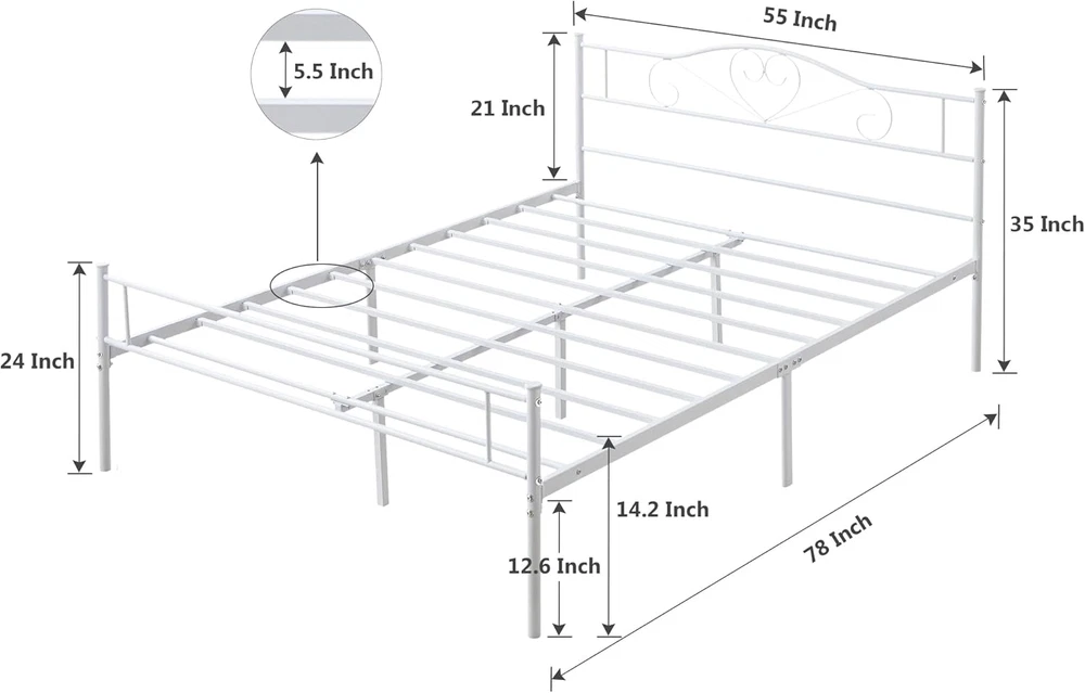 Store New Arrivals Add to Favorite View Feedback Contact 14 Inch Full Size Metal Platform Bed Frame with Headboard and Footboard, Heavy Duty Mattress Foundation with Steel Slats Support, No Box Spring Needed, White Description Finish Type Powder Coated Style Basic Bed Frame Assembly Required Yes Color White Material Metal Style Basic Bed Frame Product Dimensions 78"L x 55"W x 35"H Furniture Finish White Material Type Metal Item Dimensions L x W x H 78"L x 55"W x 35"H Item Weight 37 Pounds Weight Supported 400 Pounds Maximum Weight Recommendation 400 Pounds Item Weight 37 Pounds Ground To Item Distance 12.6 Inches Included Components 1*Full Bed Frame & 1*Hardware Kit & 1*Instruction Special Feature No Box Spring Needed, Free Shipping, Squeak Resistant, Full size bed frame under $100 Compatible With Mattress Size Full Style Name Basic Bed Frame Size Full Size Metal STURDY & DURABLE - This sturdy Full/Queen bed frame consists of 11 metal slats and 9 support legs. The side rails use 1.57" wide steel tubing to keep the bed frame strong and stable in use. Maximum weight capacity up to 400-450 lbs. HEADBOARD AND FOOTBOARD - The bed frame is designed with a headboard and footboard to both better position your mattress and comforter and prevent slippage. It can also protect your head or feet from injury. The tops of the four legs have smooth plugs to prevent you from getting scratched as you pass by. There are also non-slip foot pads to protect the floor. AMPLE UNDER BED STORAGE - This bed frame offers 14.2 inch comfortable crawl-into-bed height, and it doesn't require a box spring, which means a height clearance of about 12.6 inches underneath, provides enough space to store seasonal clothes, sheets in the storage bins. Quiet & Anti-scratch - The welded platform structure and fixed screw design can reduce the noise generated by friction. At the same time, the slotted structure of the bed row reduces the use of screws and protects your mattress from scratches. Quick Assemble - We provide clear instructions and complete accessories, and every accessory is labeled. You only need to follow the instructions step by step, and then will get the bed frame in a short time. Introducing the VECELO Metal Full Bed Frame with Headboard and Footboard—a Perfect Blend of Style and Functionality Quality sleep starts with a proper bed! Robust and Long-Lasting : Crafted from premium-quality metal, this full bed frame boasts stability and durability. Its dependable structure incorporates 13 sturdy metal slats, ensuring robust support and an undisturbed night's sleep. With a maximum weight capacity of 400 lbs, it offers both strength and comfort. Full Bed Frame with Headboard: Enjoy hassle-free assembly and a clean look without the need for a box spring. Full Bed in One Box: Experience the convenience of receiving our full bed frame in a single package, eliminating any extra waiting time. FREE Shipping and Supportive Service: Our full size bed frame is directly sold and shipped by Amazon, logistics timeliness is secured. Furthermore, we offer a hassle-free 30-day return window with no associated costs. Seamless Assembly: Simplifying the setup process, this metal full bed frame is designed with slide-in slots and a folding construction, allowing for a swift and trouble-free assembly experience. Under-Bed Storage Solution: Elevate your storage possibilities with this 14-inch high platform full bed frame, offering a generous 12.6 inches of clearance underneath. This ample space allows for the placement of storage boxes, effectively organizing your clothing or quilts. Specification: Full Bed Material: Powder-Coated Metal Available Color: Black / White / Pink Max. Loaded Capacity: 400 lb Package Dimension: 55 x 11 x 5 inch Bed Height: 14 inch Under Bed Clearance: 12.6 inch Recommended Mattress Thickness: 6-12 inch VECELO Notes: Please read the instruction carefully before assembly. If there's any problem with the products you received, please feel free to contact us to get free replacement parts. ABOUT US We offer the best prices around on high quality products. Our E-store includes media such as books, movies, music and games while offering electronics, toys, sporting apparel, clothing, tools, general home, garden items and more. SHIPPING We are always working hard to ensure your package arrives as soon as possible. Please understand that some factors like weather, high postal traffic, and the performance of shipping companies are outside of our control. We offer free shipping to the lower 48 states and ship within 2 business days of payment, usually sooner. We do not accept P.O. Boxes. Please provide a physical address. For shipping outside of the continental USA, we only use eBay's Global Shipping Program.The item is shipped to KY and then sent to the rest of the world. International customers are responsible for all duties and taxes. Continue to check out in order to calculate costs for shipping the item to your country. Messages regarding eBay's Global Shipping Program MUST be directed at eBay EXCLUSIVELY. RETURNS We offer a 30-Day Return Policy on items which you are not completely satisfied with. You have the option for a full-refund or an exchange of the item. No returns are available on items shipped outside of the USA. PAYMENT We accept PayPal. CONTACT US This page content is yet to come Please ad us to your favorite seller and visit again later Thank You CUSTOMER SATISFACTION We try our very best to make sure every customer is completely satisfied. If there's a problem, message us! We're happy to help.