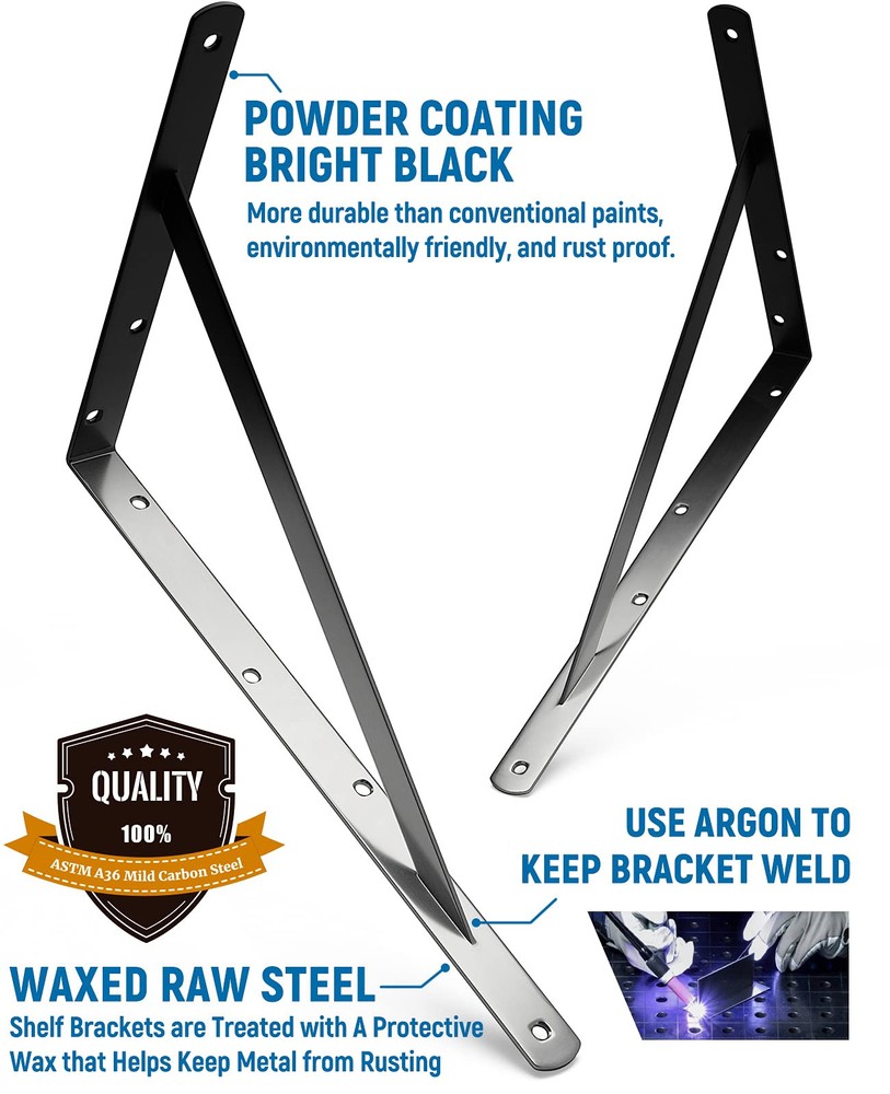 PERFECT FIT: This L shelf brackets fit the nominal 14” - 18” deep lumber board, measure 14” x 9-3/4” x 1” HIGH QUALITY: Unlike the normal painting material, power frosted black coating ensure its rust-resistance and anti-coating off HEAVY DUTY: Each heavy duty steel shelf bracket with upgrade quality screws carry up to 130lb, enough for daily use (260lb per pair) ALL-MATCH STYLE: Maximize space with with style. Fit for the kitchen, bathroom, bedroom, office & more. MAKE IT EASY: We provide installation manual and offer 90 days no reason or offer new free guaranteed