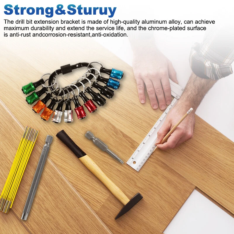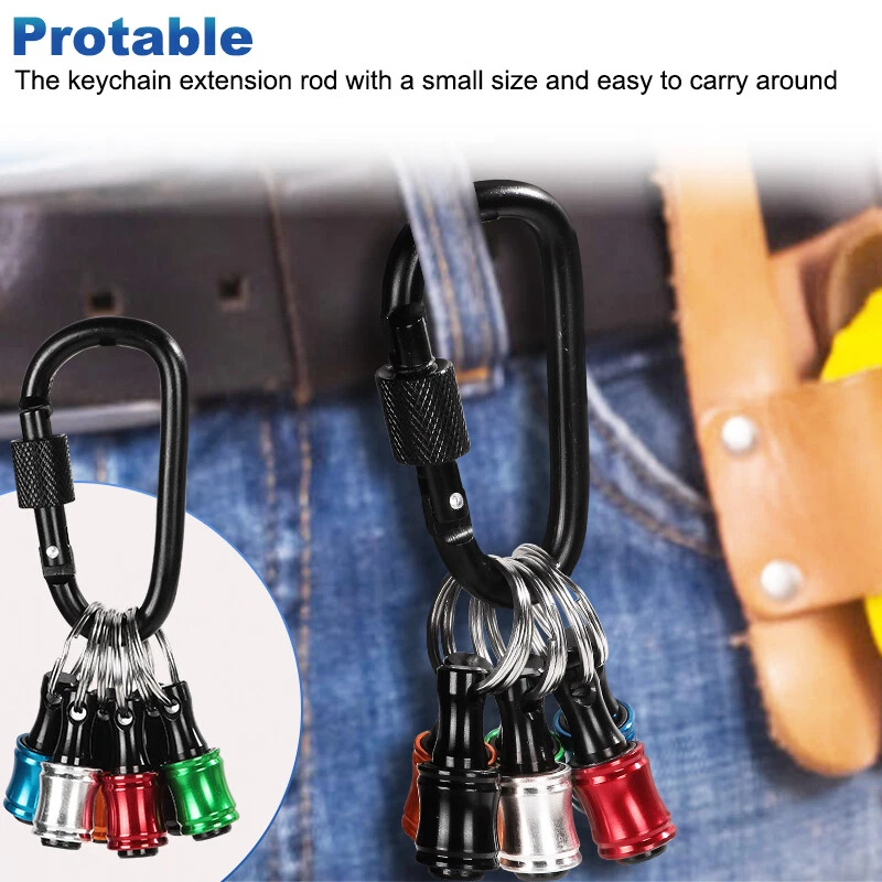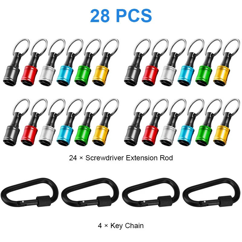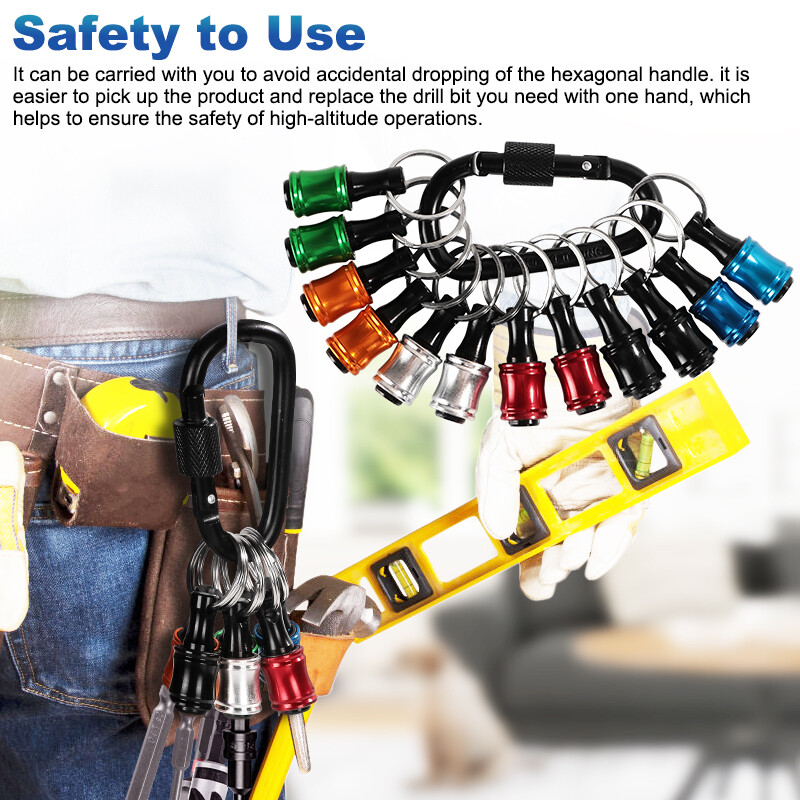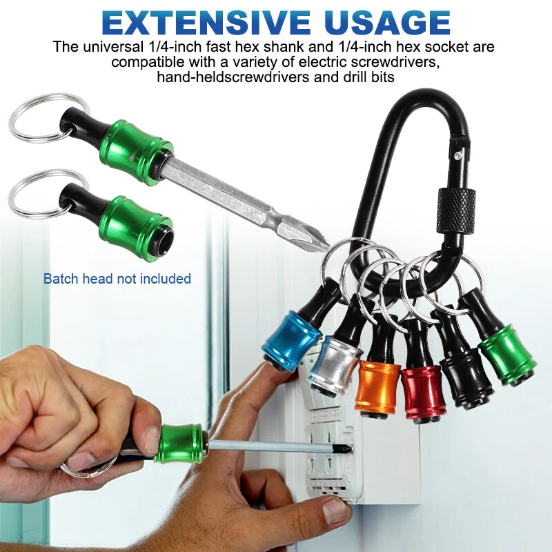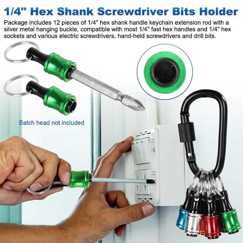 Product D escription 28 PCS 1/4" H ex H andle Q uick R elease K eychain S crewdriver D rill H older S et Product Characteristics High Q uality I ndustrial G rade M aterials: This extension rod is made of high quality aluminum alloy and is durable. Easy T o U se: The keychain features a flat, thick, rounded design that makes it easy to pick up and replace screwdriver bits with one hand. Smooth surface processing and key chain can avoid the accidental drop of tools, easy to work at altitude. The powerful ball lock can carry tools weighing around 500G. Easy T o C arry: Small and portable, easy to carry. The product comes with a chain link, which can be hung on the belt. The large diameter flat ring is easy to install on the chain link. You can use your favorite chain keychain according to your needs. Strong C ompatibility: Expand a variety of screwdriver bits, screwdriver bit conversion purpose universal 1/4" hex shank head, suitable for most electric drives, hand-held drives and screwdriver bits. It is suitable for the connection of screwdriver drill, screwdriver, batch and so on. Product Specification Status: 100% Brand New Material: Aluminum A lloy Aperture: 1/4" (6.35mm) Number O f S tent: 24 PCS Number O f K eychain: 4 PCS Package Included 24 PCS S crewdriver E xtension R od 4 PCS K ey C hain Attention P lease 1. Please allow manual measurement error of 1-5mm. Make sure you don't mind before you buy. 2. Due to lighting effects, brightness contrast Settings of the display, etc., there may be some slight differences in the hue of the picture and the actual item, please make sure you don't mind.