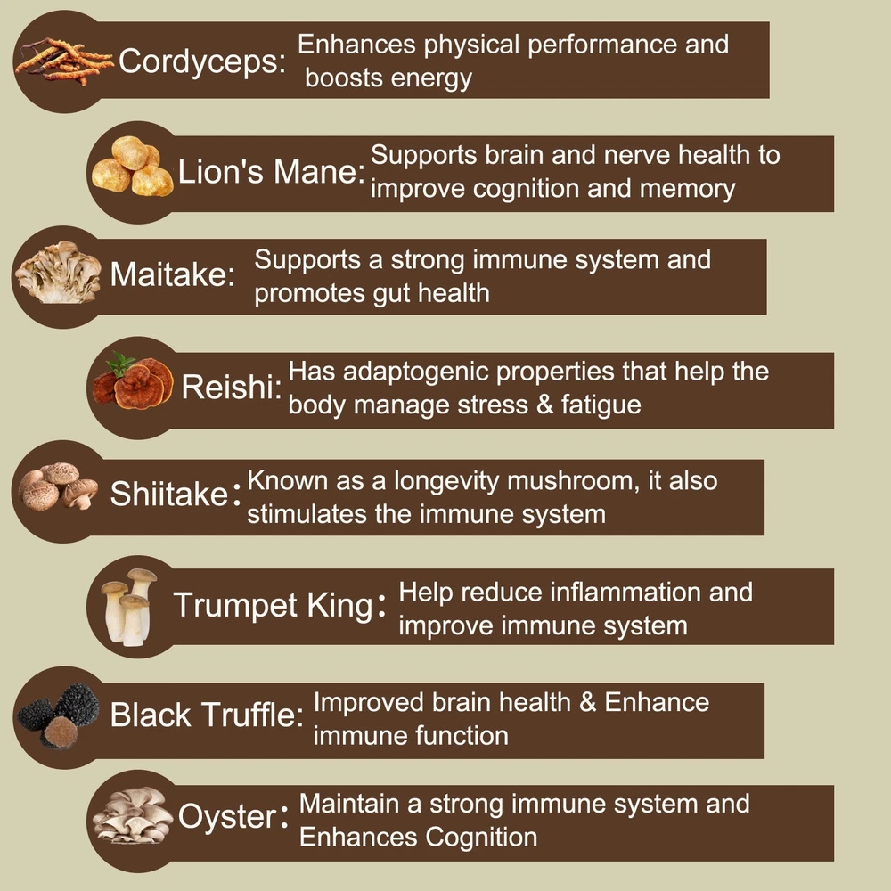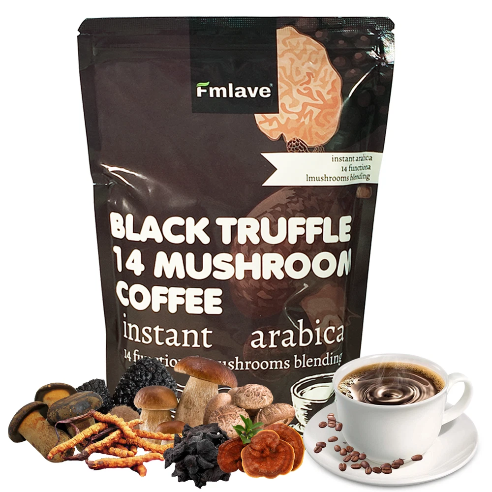Product Description: Fmlave Black Truffle 14 Mushroom Coffee combines the richness of black truffle latte flavor with the benefits of 14 premium mushroom extracts. Crafted with a medium roast, this coffee provides a smooth and satisfying experience, promoting wellness, energy, and a healthier lifestyle. Perfect for hot or cold brew options, this coffee is designed to elevate your daily routine. Ingredients: Black Truffle Extract: 300mg Cordyceps Extract: 300mg Maitake Extract: 200mg Himematsutake Extract: 200mg Ganoderma Lucidum ( reishi ) Extract: 200mg Lion’s Mane Extract: 200mg Shiitake Mushroom Extract: 150mg Black Fungus Extract: 100mg Boletes Extract: 100mg Dictiyophora Indusiata Extract: 100mg Poria Cocos Extract: 100mg Oyster Mushroom Extract: 50mg Trumpet King Mushroom Extract: 50mg Instant Coffee Powder Key Features: Wellness Blend: Contains 14 natural fungal extracts for holistic health benefits. Flavor Profile: Black truffle latte flavor with a medium roast for a rich and creamy taste. Versatile Use: Enjoy hot or cold for a nourishing coffee experience. GMP & ISO & NSF Certified: Manufactured in a GMP-compliant facility, rigorously tested by trusted Third-Party Validation. Non-GMO, gluten-free, sugar-free, and free from artificial additives. Main Benefits: Energy & Focus: Provides sustained energy and mental clarity. Immune Support: Enhances immunity with mushroom extracts. Convenience: Perfect for on-the-go lifestyles and travel. Digestive Health: Promotes gut health with natural ingredients. Directions for Use: For Hot Brew: Add 1 sachet of coffee into a cup. Pour 200-250ml of hot water. Stir well and enjoy. For Iced Coffee: Add 1 sachet of coffee into a cup. Pour 200-250ml of cold water, stir, and add ice cubes. Storage: Store in a cool, dry place away from sunlight. What you would receive? 1 pack 14 oz / 396g Mushroom Coffee Powder (With a spoon inside ).