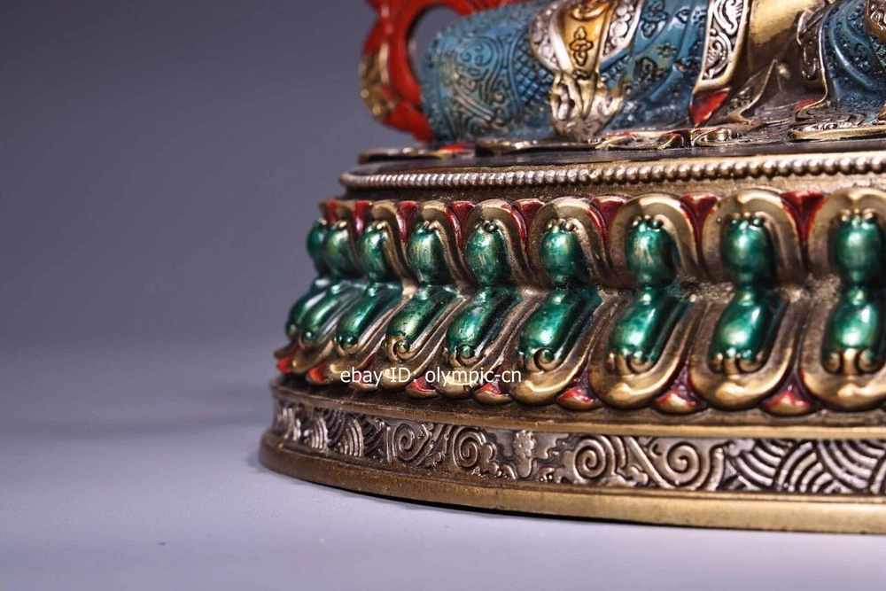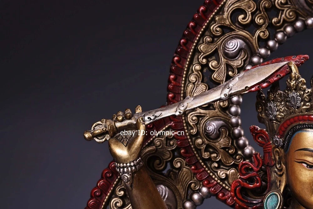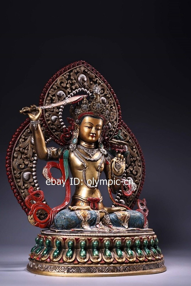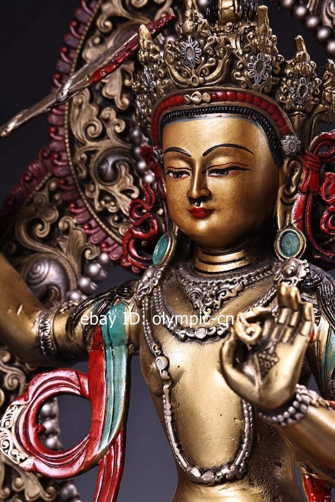 14'' Nepal bronze colored drawing handicraft buddhism Manjusri Bodhisattva product size: Height 36 c m. Long 25 cm . Breadt 15 c m 1 inch=2.54cm 1pound=0.4536kg Weight: Abo ut 4 kg ---without included the weight of packing materials Condition:Very Good.