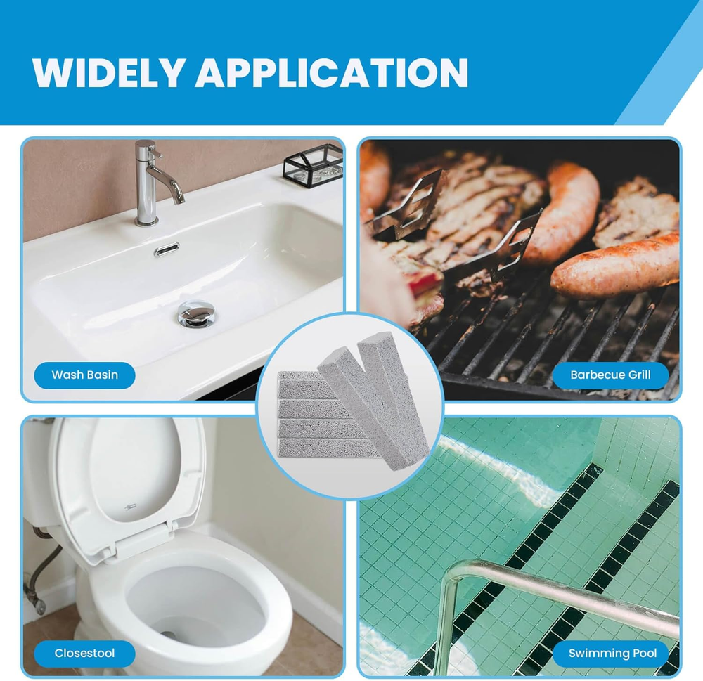 【Versatile Cleaning Tool】:Our pumice stone is suitable for cleaning toilets, bbq grill, pools, bath tubs and ceramic surfaces, powerfully cleans away limescale stain, hard water rings, rust. 【High Quality Material】:Made of natural pumice, delicate and strong, with high density. It will not scratch your tiles, It is preferred over ordinary toilet brush and cleansers as the most effective lean toilet. 【Perfect Size】:Each pumice is about 5.9 x 1.4 x 0.9 Inches, perfect for your palm, easy handling, transforming the strenuous toilet cleaning task into a breeze. 【Effectively Clean】:Each pumice stone can be sharpened into different shapes to clean the narrow edges and corners that other cleaning tools aren't able to reacheffortlessly removing stubborn marks, and the cleaning process is simple, convenient and effective. 【Easy To Use】:Wet the pumice stone first for 15 to 20 seconds and gently press it on the toilet in a straight motion, and your toilet will be as clean as new. Product Description