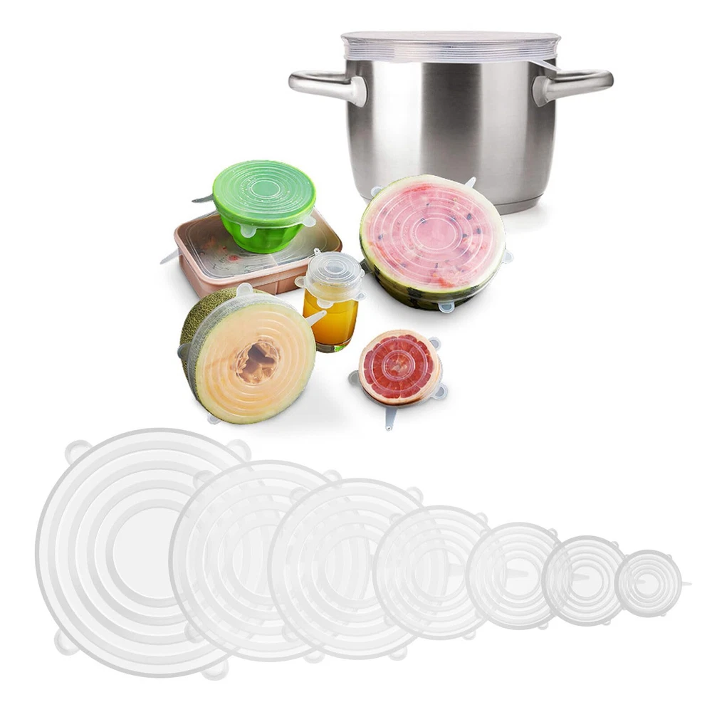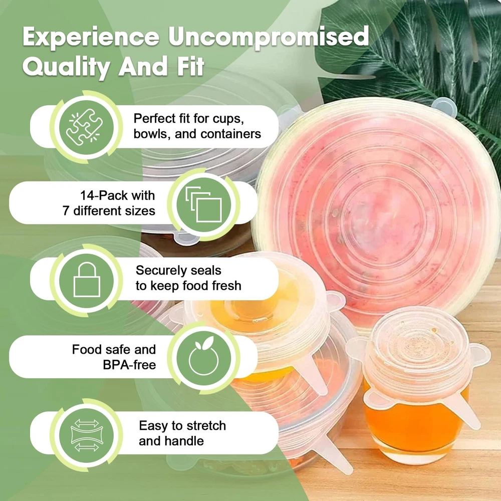 FLEXIBLE and STRETCHABLE: We offer you 14 pcs premium reusable silicone food covers with 7 different diameter sizes: 2.4inch/6cm, 3.5inch/9cm, 4.3inch/11cm, 5.5inch/14cm, 6.3inch/16cm, 7.5inch/19cm and 9.1inch/23cm. The silicone lid can double-stretch for easy food storage. Make sure the lid and container are completely dry before use so that they fit tightly to the container. Choose a lid 1-2 inches smaller than your container for the best seal SAFETY& HEALTH: These silicone bowl covers for food storage are made of food-grade silicone and are free from harmful chemicals, ensure your food stays safe and the health of the family. The stretch lids have a soft texture and will not tear or warp, you can use them to cover most foods and put them in the refrigerator, microwave, and dishwasher SAVE SPACES & EASY to CLEAN: Our stackable silicone food covers keep food fresh, prevent spilling and spattering, as well as help you easily organize your kitchen to store more food. The unique silicone material makes the lids easy to clean, such as rinse them with warm, soapy water or throw them into the dishwasher GOOD SEALING, NOT LEAKAGE: The silicone bowl cover can form a sealing vacuum environment on glass, plastic, or metal containers. It keeps fruits, vegetables, beverages, and other foods fresh and prevents them from overflowing and adoring. The silicone stretch lids have good air tightness, when you use them in a microwave oven, please open the lid partially so that steam can escape HIGH TEMPERATURE and REUSABLE: Silicone lids for food storage can accept low-temperature storage and high-temperature disinfection (-140 °F up to 464 °F). Suitable for refrigerators, microwave ovens, dishwashers, and picnics. Using this reusable silicone food cover replaces expensive plastic wrap, reducing plastic waste and helping you save money