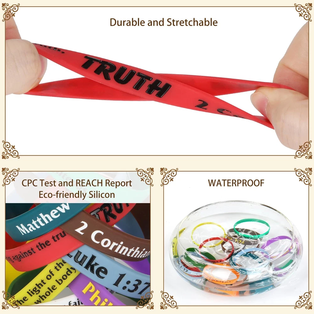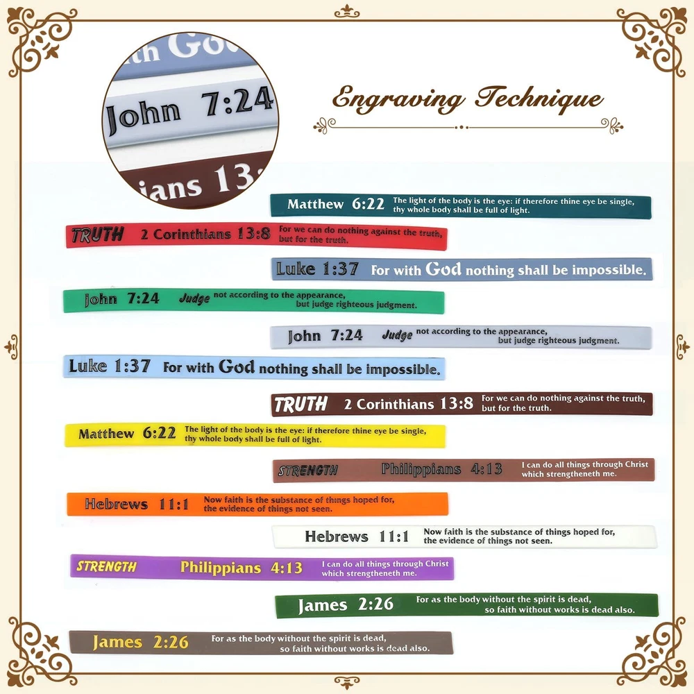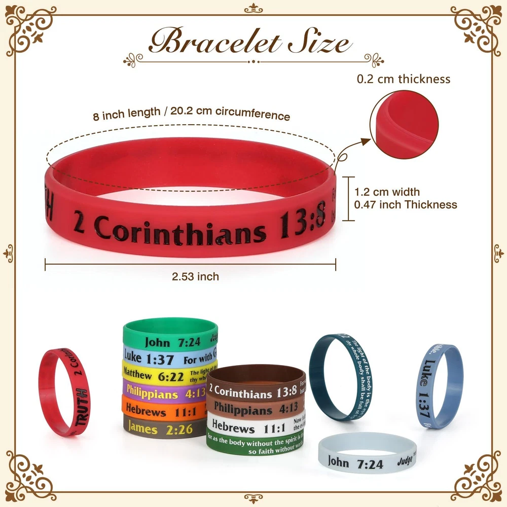 Silicone Wristbands 14 pieces Bible Bracelets: Include 14 colors. You can give them to your family, to inspire you and others to have a strong faith in God. It can be as religious gifts for men and women. Inspirational Christian Bracelet: Designed bible verse bracelets with powerful bible verses to keep the word of God close to your heart. The scriptures written are from Matthew 6:22, Luke 1:37, John 7:24, 2 Corinthians 13:8, Philippians 4:13, Hebrews 11:1, James 2:26. Bracelets Bulk Size: 8 inch length (20.2 cm circumference x 1.2 cm width x 0.22 cm thickness), measured 2.53 inch in diameter, 0.47 inch in width, can be stretched, the size fits most men, women and teenagers. Religious Bracelets Quality: CPC test report and REACH report. Made of 100% high quality silicone, eco-friendly and soft. Waterproof, durable and comfortable stretch. Ideal Gift: These religious silicone wristbands with inspirational words for motivation and positive thinking, the Lord direct your hearts into the love of God. The Bible Verse bracelets pack can be as a gift for church gatherings and retreats or outreach events, such as bible study, religious fundraisers, Christmas, Easter, and baptism celebrations.