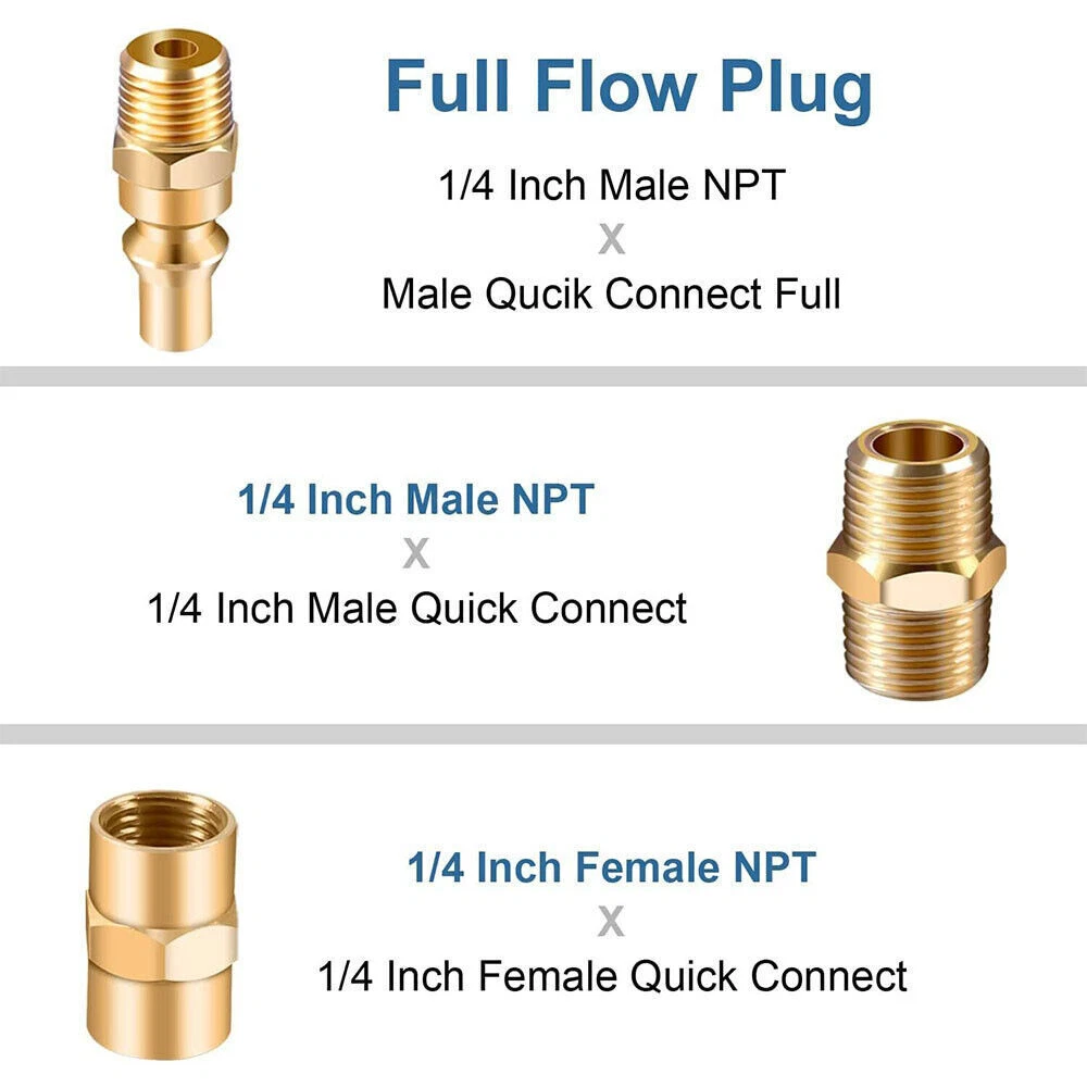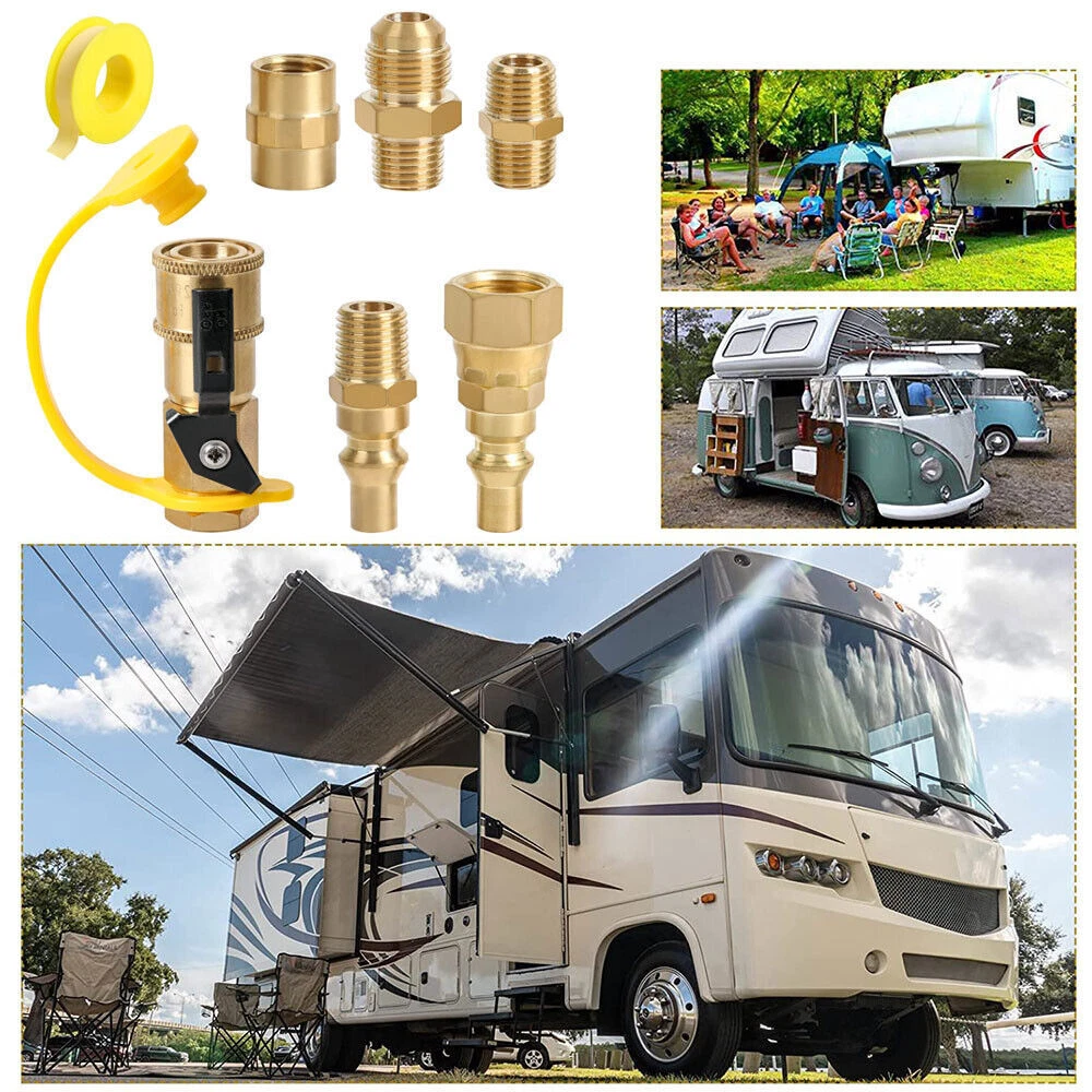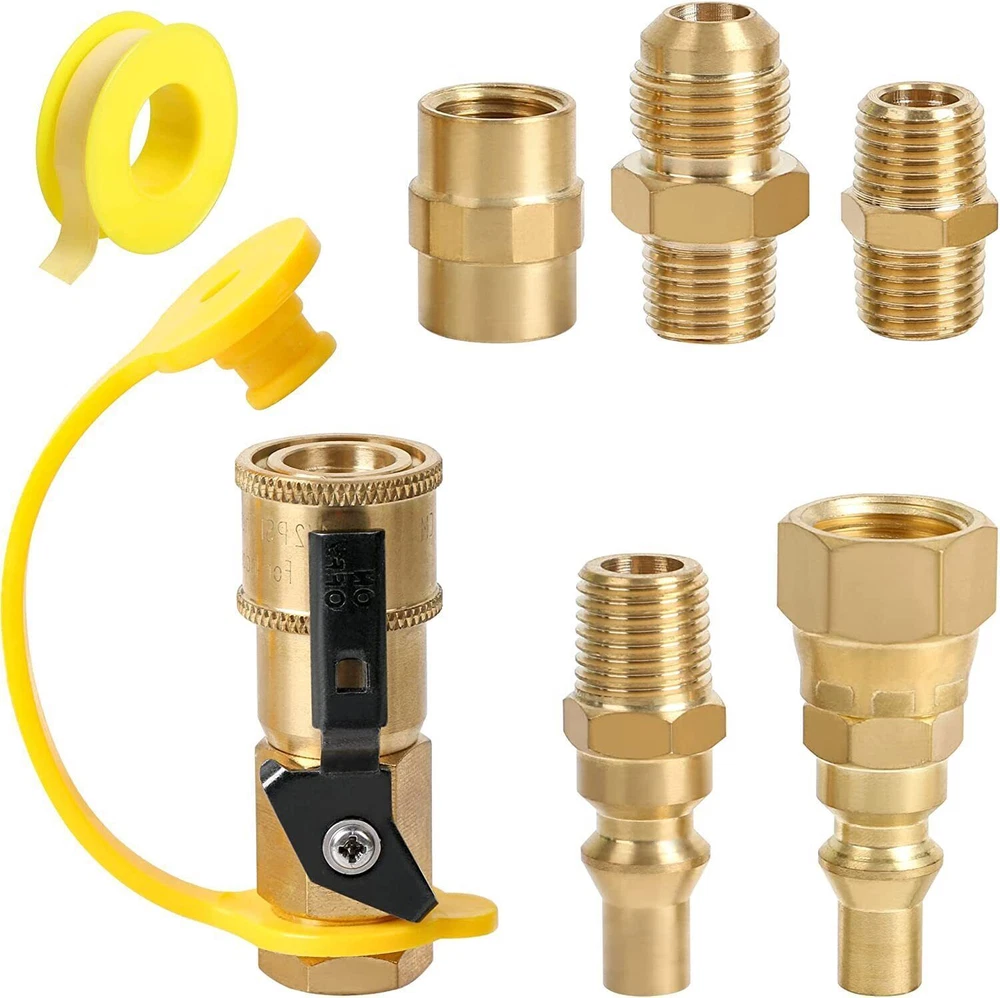 7Pcs RV Quick-connect Fittings BBQ Grill Adapter 1/4" NPT Propane Hose Adapter RV Propane Quick Connect Fitting Adapter Kit. This assembly kit includes a 1/4" Female NPT x Female Quick Connect with shutoff valve, full flow plug 1/4" Quick Key Connect Plug x 3/8" Female Flare adapter, 1/4" Male NPT x 1/4’’ Male Quick Connect, 1/4" Female NPT x 1/4’’ Female Quick Connect, 1/4" Male NPT x 3/8" Male Flare Fitting, 3/8" Flare x 1/4" NPT Male Pipe Half-Union Fitting,1 Teflon Seal Tape. PLEASE NOTE: THE KIT WORKS WITH LOW PRESSURE SYSTEM ONLY! Shut-off Valve for Convenient Use. Save time by turning your gas flow ON or OFF for a single quick connect appliance without having to open or close your whole RV propane source. Quickly and easily add a convenient connect/disconnect method. Let you use a propane supply on a RV camper or trailer that has built-in quick connect propane connection. Easy to Install & Enjoy the DIY. You can use them separately or in combination. Just connect the quick coupler to your RV gas source and quick connect propane appliance, and the pipe fitting connect two pipes going in the same direction to extend pipe length. The Teflon thread sealing tape provided to wrap on the thread, tighten by adjustable wrench. PREMIUM QUALITY. These propane quick connect fittings are made of solid brass, which are weather resistant, high temperature resistant, anti- corrosion and not easy to break. Thick solid brass construction fittings provides secure, airtight connection. Wide range of applications: Gas Grill Hooks for BBQ, Portable Heater Hooks, Camping, Hunting, Fishing Hooks, Vehicles, Fish Stoves, Smokers, Torch Hooks. Connected to gas tank and electrical appliances. Specification: Set quantity: 7 pieces Size: 1/4" RV Propane Quick Connect Material: Made of 100% brass, especially durable and strong for long-term use Type: Low Voltage Adapter, High Voltage Quick Connect Applicable to: gas appliances Gas Type: LPG, Natural Gas, Propane, Butane Working Temperature: 50 to120℃ (-60 to 250F) Flow Capacity: 80000 BTU/HR Item Type: RV Propane quick connect fittings With Shut Off: Yes For use with low-pressure propane system Package List: 1pcs 1/4" female NPT x female quick connect with shutoff valve 1pcs 1/4" quick key connect plug x 3/8" female flare adapter 1pcs 1/4" male NPT x male quick connect full flow plug 1pcs 1/4’’ x 1/4" NPT hex nipple coupling 1pcs 1/4’’ x 1/4" brass pipe coupler 1pcs 3/8 Inch Male Flare x 1/4 Inch NPT Male Pipe 1pcs Teflon seal tapes NOTE: Low Pressure Use Only! It is NOT intended to be connected directly to a high pressure propane tank and will leak if this is how you try to use it.