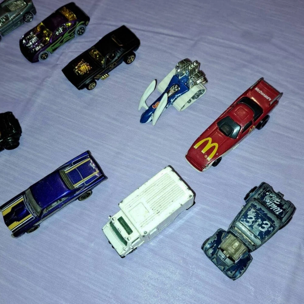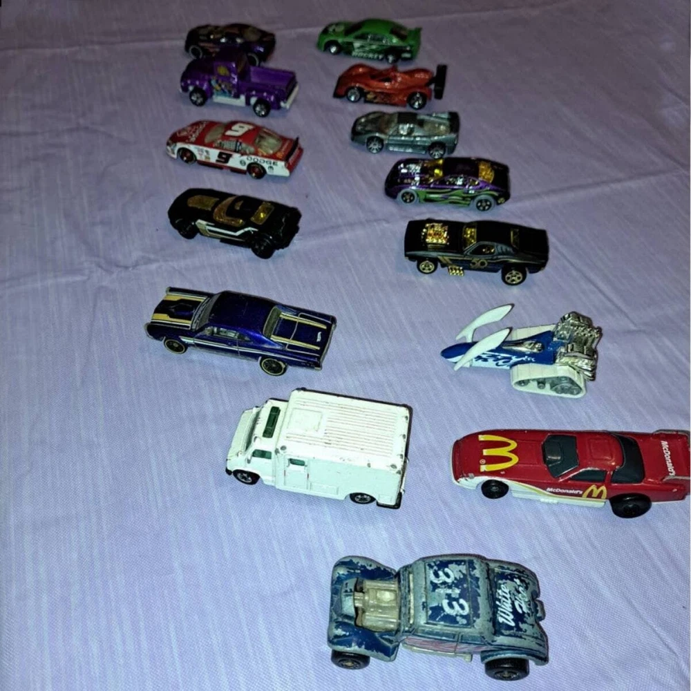 (14) Vintage Hot Wheels & Matchbox Die-Cast Cars & Trucks Bundle Includes -2000 Hot Wheels SS Commodore VT Hockey Green Mask car. -2006 Ferrari 333 SP with Flame. -2016 Hot Wheels FAST FISH Metallic Green car. -2015 Rodger Dodger Hot Wheels 50th anniversary Car. -1995 Hot Wheels Big Chill Snowmobile Car. -1996 Hot Wheels pontiac GTO. -1982 Matchbox Willys Street Hotrod '33 Blue. -2015 Purple Hot Wheels All Stars Torque Twister. -2001 Hot wheels Purple Overboard 454. -2006 Nascar Winner's Circle Kasey Khan #9 Dodge Charger. -1999 Hot Wheels Ferrari F50 Grey and Silver Car. -1996 Matchbox 56 Ford Pickup Huckleberry Hound Hanna Barbera Truck. -1988 Hot Wheels White Ambulance. -1993 Hot Wheels Mcdonalds Raccing Car. Conditions Vary per car. Please see all photos and judge condition for your self. Will Ship Fast and With Care!