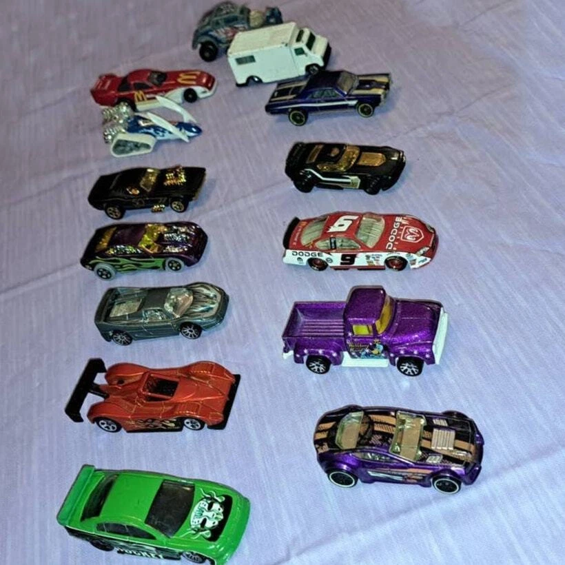 (14) Vintage Hot Wheels & Matchbox Die-Cast Cars & Trucks Bundle Includes -2000 Hot Wheels SS Commodore VT Hockey Green Mask car. -2006 Ferrari 333 SP with Flame. -2016 Hot Wheels FAST FISH Metallic Green car. -2015 Rodger Dodger Hot Wheels 50th anniversary Car. -1995 Hot Wheels Big Chill Snowmobile Car. -1996 Hot Wheels pontiac GTO. -1982 Matchbox Willys Street Hotrod '33 Blue. -2015 Purple Hot Wheels All Stars Torque Twister. -2001 Hot wheels Purple Overboard 454. -2006 Nascar Winner's Circle Kasey Khan #9 Dodge Charger. -1999 Hot Wheels Ferrari F50 Grey and Silver Car. -1996 Matchbox 56 Ford Pickup Huckleberry Hound Hanna Barbera Truck. -1988 Hot Wheels White Ambulance. -1993 Hot Wheels Mcdonalds Raccing Car. Conditions Vary per car. Please see all photos and judge condition for your self. Will Ship Fast and With Care!