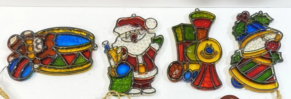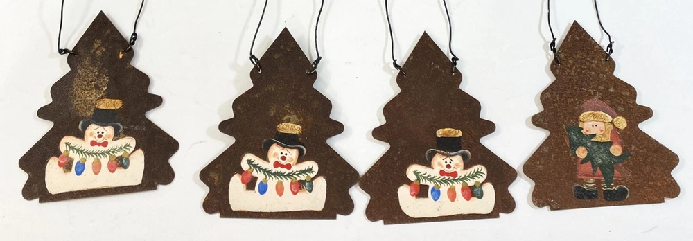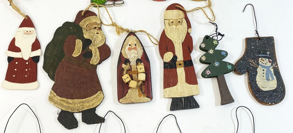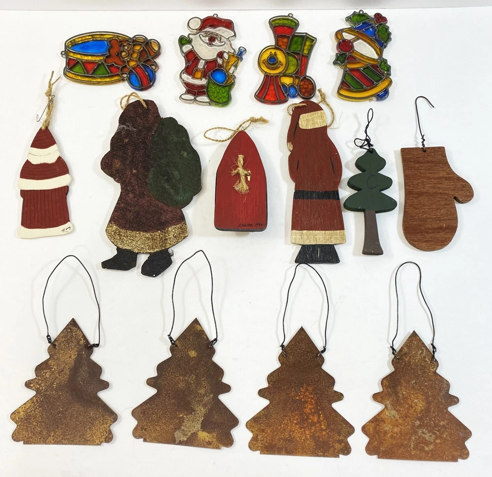 Lot of 14 Vintage Rustic Santa Snowmen Christmas Ornaments Wood Metal Stained Glass Great Pre-Owned Condition ~ Shows Some Scuffs From Age ~ See All Photos (6) Wood Ornaments Santa's, Tree, Stocking (4) Metal Ornaments Christmas Trees with Snowmen (4) Plastic Stained Glass Look Ornaments