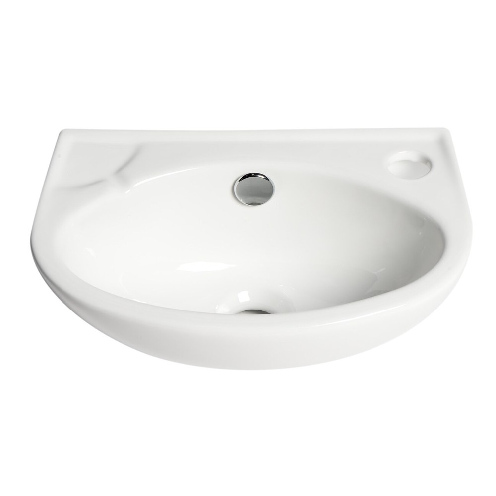 Comes in a white glossy finish with a super smooth glaze that is both durable and timeless.Made of high grade ceramic porcelain also known as vitreous china. The most common used bathroom sink material of all times.Includes wall-mounting hardware for a convenient installation. Or you can always choose to install this sink as an above mount on the counter since it's unique design allows it to go both ways.Includes a standard 1 3/8" faucet hole on the right side.Standard sized center drain hole of 1 3/4".Features an overflow hole, so be sure to purchase a drain that is for sinks with an overflow like the ALFI brand AB9056 (in polished or brushed) or the AB8056 (in white or black). Free Shipping Over $49.99* Details White 14" Small Wall Mounted Ceramic Sink with Faucet Hole Product Description: Comes in a white glossy finish with a super smooth glaze that is both durable and timeless.Made of high grade ceramic porcelain also known as vitreous china. The most common used bathroom sink material of all times.Includes wall-mounting hardware for a convenient installation. Or you can always choose to install this sink as an above mount on the counter since it's unique design allows it to go both ways.Includes a standard 1 3/8" faucet hole on the right side.Standard sized center drain hole of 1 3/4".Features an overflow hole, so be sure to purchase a drain that is for sinks with an overflow like the ALFI brand AB9056 (in polished or brushed) or the AB8056 (in white or black).