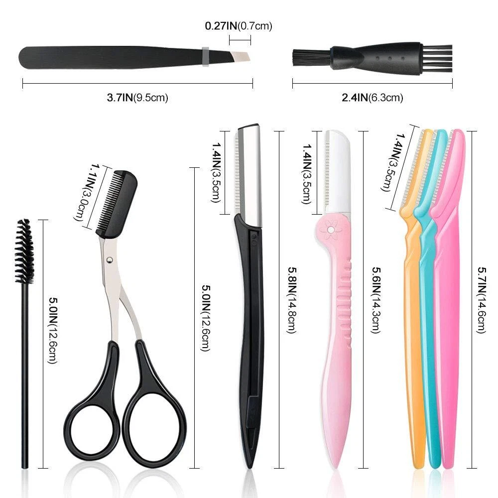 14 in 1 Eyebrow Razor Kit, Professional Dermaplane Face Razor for Women, Eyebrow Trimmer for Hair & Peach Fuzz Remover, Face Shavers for Women with Eyebrow Tweezers/Scissors/Clipper/Spoolie Brush π Description π: 6 Pcs Straight Eyebrow Razor Reusable for Women Hair Remover Straight Razor Color: Pink,yellow, blue (2 in each color) Material: Stainless steel grooming blade + ABS resin handle Brow Shaver Total Long: 5.7in(14.6cm) Razors Head: 1.4in(3.5cm) 2 Pcs Black Eyebrow Shaver with Stainless Steel Shell Material: Stainless steel grooming blade + ABS resin handle Total Long: 5.8in(14.8cm) Eyebrow Shaper Head: 1.4in(3.5cm) 2 Pcs Pink Folding Eyebrow Removers Brow Shaper Material: Stainless steel grooming blade + ABS resin handle Total Long: 5.6in(14.3cm) Blade: 1.4in(3.5cm) 1 Pc Black Slant Precision Eyebrows Tweezers Material: Stainless steel Total Long: 3.7in(9.5cm) x 0.39in(1cm) Slant Tip: 0.27in(0.7cm) 1 Pc Black Eyebrows Scissors with Comb Scissors Long: 5.0in(12.6cm) Comb: 1.1in(3.0cm) 1 Pc Black Mascara Eyelash Brush (3.8in) Great for eyebrows brows, eyelash extensions, mascara application. 1 Pc Double Sided Hair Brush(2.4in) Perfect for razor, shaver, clipper, trimmer etc. How to Use 1.Apply warm water or shaving cream make your eyebrow soften 2.Trim your eyebrows with eyebrow trimmer 3.Shave perfect shape with eyebrows razors in 45 degree angle 4.Using eyelash tweezers to clamp the extra eyebrows 5.Comb your eyebrows neatly with spoolie brush 6.Apply skin care product around eyebrows Easy to Clean 1.Take off the remaining hairs with blade brush 2.Spray alcohol on the blade 3. Wipe excess with towel or tissue 4. Cover eyebrow razor with a protective cover after each use Warm Note Please use it carefully to avoid scratching the skin and keep far away children's reach. Features β: 3 Types Eyebrow Razors: Totally 10pcs dermaplaning tools, including 6pcs straight face shavers with ABS resin cover head in 3 colors: yellow, blue, pink, 2pcs black straight razor shaving kit with stainless steel cover head, and 2pcs pink folding eyebrow trimmers, portable eyebrow trimmer for women. Eyebrow Trimmer Material: Shaver for women are made of stainless steel blade+ABS resin, stainless steel blade that is sharp but mild, convenient to operate, with lasting sharpness and rust-proof, and the anti-slip plastic handle easy to control. Eyebrow Shaper Accessories: The stainless steel eyebrow tweezers with slant tip, can firmly aligned to remove hairs from the root, eyebrow scissors with comb can neatly trim your eyebrows, and the eyebrow brush let your eyebrows looking more neat, doubled-head mini clipper brush suitable for eyebrow trimmer, razor, scraper, shaver. Hair Razor Multi-Application: Suitable for eyebrows, peach fuzz, dead skin, facial hair, labial ministry, neck back, hand, underarm, body or other area fine hairs, perfect choice for professional beauty salons or individual home use, ideal gift for Halloween, Thanksgiving, Christmas etc. Easy to Use: First care-soften your eyebrows with warm water or feminine shaving cream and comb it, also you can cut your eyebrows shorter with eyebrow scissors, then use eyebrow shaver to tilt 45 degrees, gently trim according to the direction of eyebrow growth to achieve a perfect eyebrow shape, and use eyebrow tweezers to grab the extra eyebrows. SHIPPING π: We are always working hard to ensure your package arrives as soon as possible. Please understand that some factors like weather, high postal traffic, and the performance of shipping companies are outside of our control. We offer free shipping to the lower 48 states and ship within 3 business days of payment, usually sooner. We do not accept P.O. Boxes. Please provide a physical address. For shipping outside of the continental USA, we only use eBay's Global Shipping Program. The item is shipped to KY and then sent to the rest of the world. International customers are responsible for all duties and taxes. Continue to check out in order to calculate costs for shipping the item to your country. Messages regarding eBay's Global Shipping Program MUST be directed at eBay EXCLUSIVELY. PAYMENT π³: We accept payment by PayPal only (Can accept all kind of credit cards). Please pay as soon as possible after winning an auction, as that will allow us to post your item to you sooner. Payment must be received within 3 business days of auction closing. Before buying, please make sure your PayPal and eBay address is correct. If not, please correct it before payment. We have confidence in our products, but if you are not fully satisfied please contact us within 30 days of purchase and you will get full refund of your money. Return the product in the same condition you received it. Please note - return shipping will be paid by the buyer.