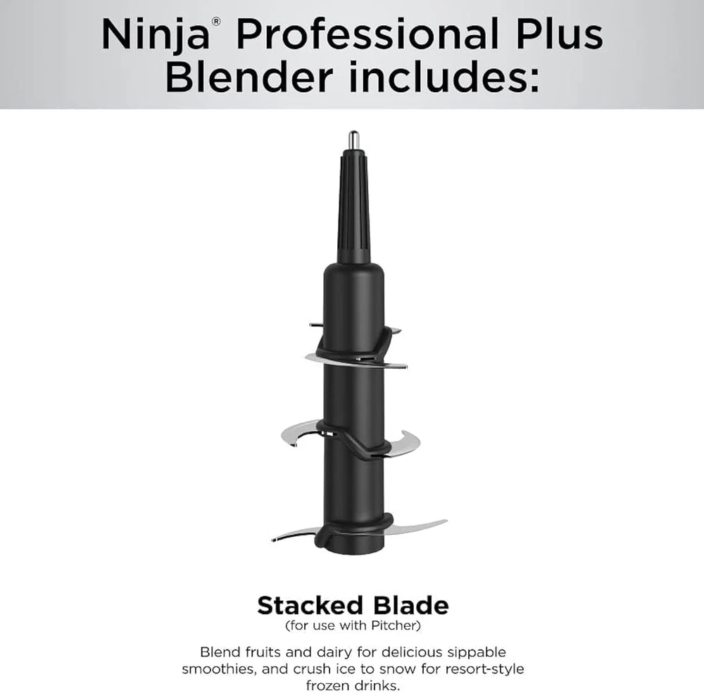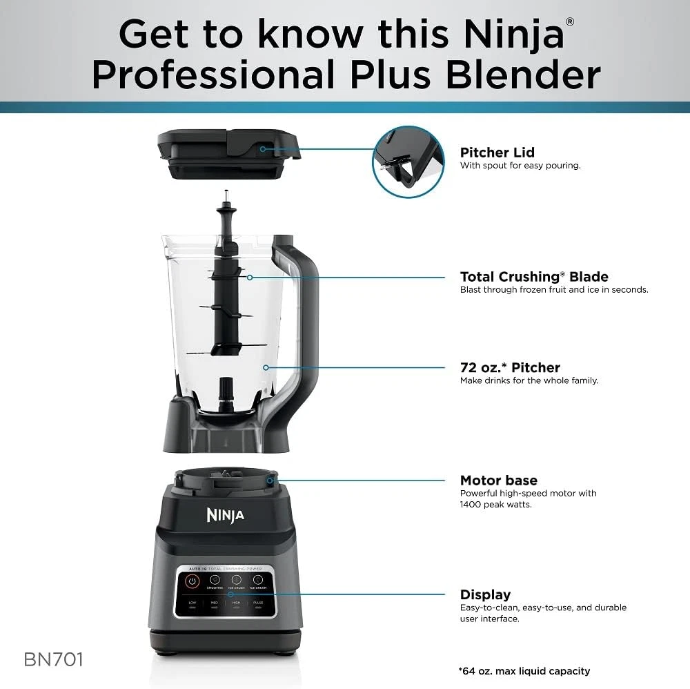 MORE POWERFUL MOTOR: The Ninja Professional Plus Blender with Auto-iQ features a new modern design and a more powerful motor than Ninja's original Professional Blender. (Versus BL610, based on operating wattage.) POWERFUL CRUSHING: Ninja Total Crushing Blades give you perfectly crushed ice for your smoothies and frozen drinks with 1400 peak watts of professional power. 3 VERSATILE FUNCTIONS: 3 preset Auto-iQ programs allow you to create smoothies, frozen drinks, and ice cream, all at the touch of a button. AUTO-IQ TECHNOLOGY: take the guesswork out of drink making with intelligent programs that combine unique timed pulsing, blending, and pausing patterns that do the work for you. XL BLENDING CAPACITY: The 72-oz. Total Crushing Pitcher is great for making large batches for the whole family. (64-oz. max liquid capacity.) RECIPE INSPIRATION: Includes 15-recipe Inspiration Guide to help create delicious smoothies, frozen drinks, and more. DISHWASHER SAFE: BPA-free pitcher and stacked assembly blade are easy to clean and dishwasher safe on the top rack. WHAT’S INCLUDED: 1400-Peak-Watt Motor Base, 72-oz.Total Crushing Pitcher, Stacked Blade Assembly, Lid, Recipe Inspiration Guide, Instruction Booklet & Quick Start Guide. The Ninja Professional Plus Blender with Auto-iQ features a new modern design and a more powerful motor than Ninja's original Professional Blender.* Ninja Total Crushing Blades give you perfectly crushed ice for your smoothies, frozen drinks, and ice cream. The 72 oz.** Total Crushing Pitcher is great for making large batches for the whole family with 1400 peak watts of professional power. Auto-iQ Technology provides preset programs that do the work for you, no guesswork required. *Versus BL610, based on operating wattage **64 oz. max liquid capacity.