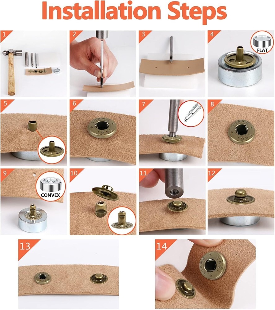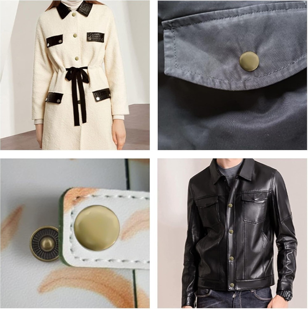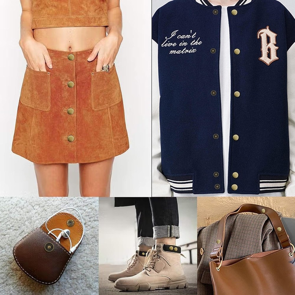 140 Sets Leather Snap Fasteners Kit, 12.5mm Metal Buttons with 4 Setter Tools for Clothes, Crafts, Jackets, Jeans, Bags, Bronze 【Package With High Cost Performance】 - Package includes totally 140 sets of snap buttons with 4 pieces of setter tools.Our sewing snaps will meet your needs in clothing/leather/bag/hat/pet clothes/craft making, jacket repairing and decoration. 【Matters Needing Attention】The diameter of the cap is about 12.5 mm/0.49 inch. The thickness is 6mm. Heavy duty leather snaps are suitable for 0.027-0.17 inch thickness fabric, please don't use too much force when strike the fasteners in case of deformation. 【Durable and High-Quality Material】Snaps fasteners kit made with high quality and stainless steel nickle-free plating craft, withstand daily wear, they can still remain like new even after long time use. 【Easy to Install】 The punch tool help poke holes on the target products, then hammer and push the snaps on both side.the reasonable tool kit is simple and useful to use, and enough for meeting your different needs