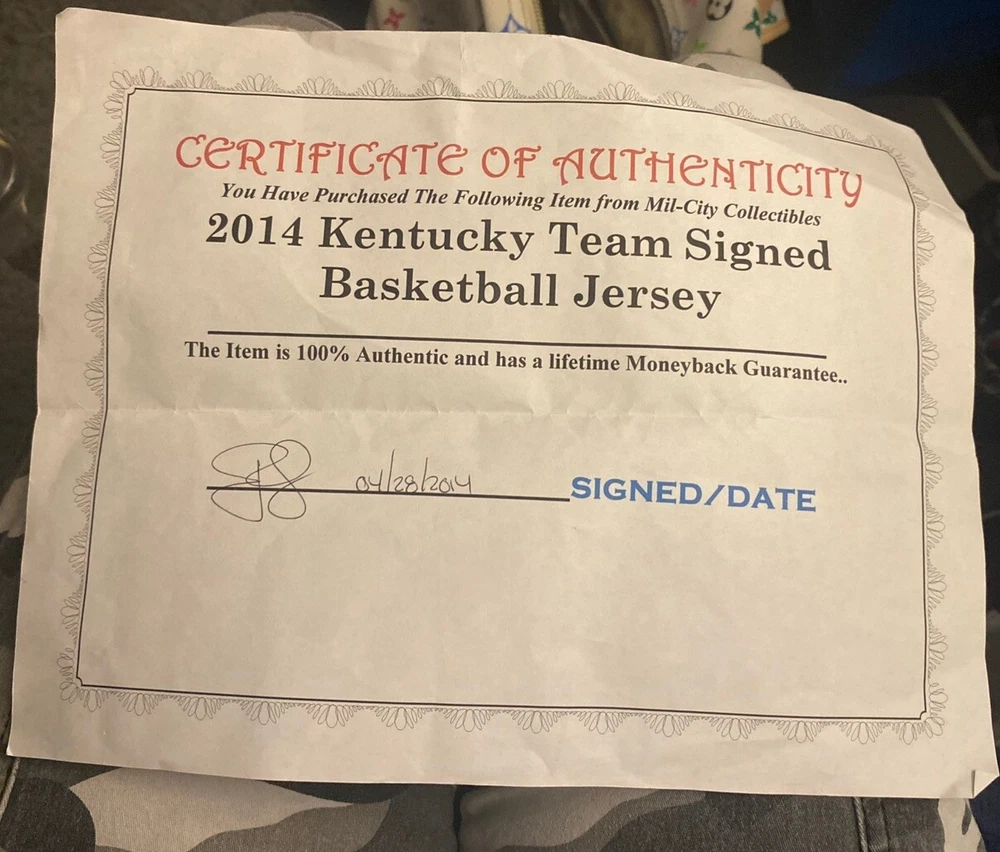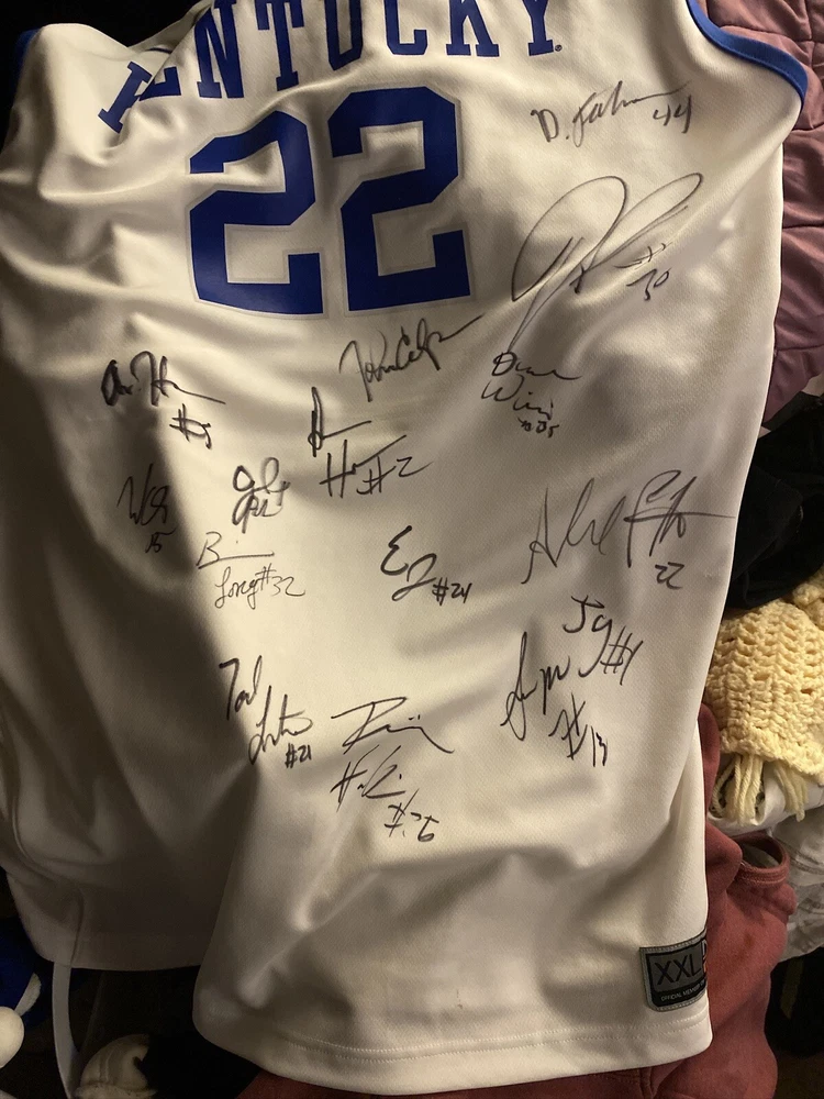 Nike elite Kentucky basketball jerseyXXL brand new with tags. 2014 team autographed jersey with a COA . Players like Willie Cayley-Steins #15, Aaron Harrison #2, Andrew Harrison #5, James Young #1,Sam Malone #13 , Tod Lanter #21, Alex Poythress #22, EJ Floreal #24 , B Long #32, Derek Willis #35, Dakari Johnson ##44 , head coach John Calipari and more .