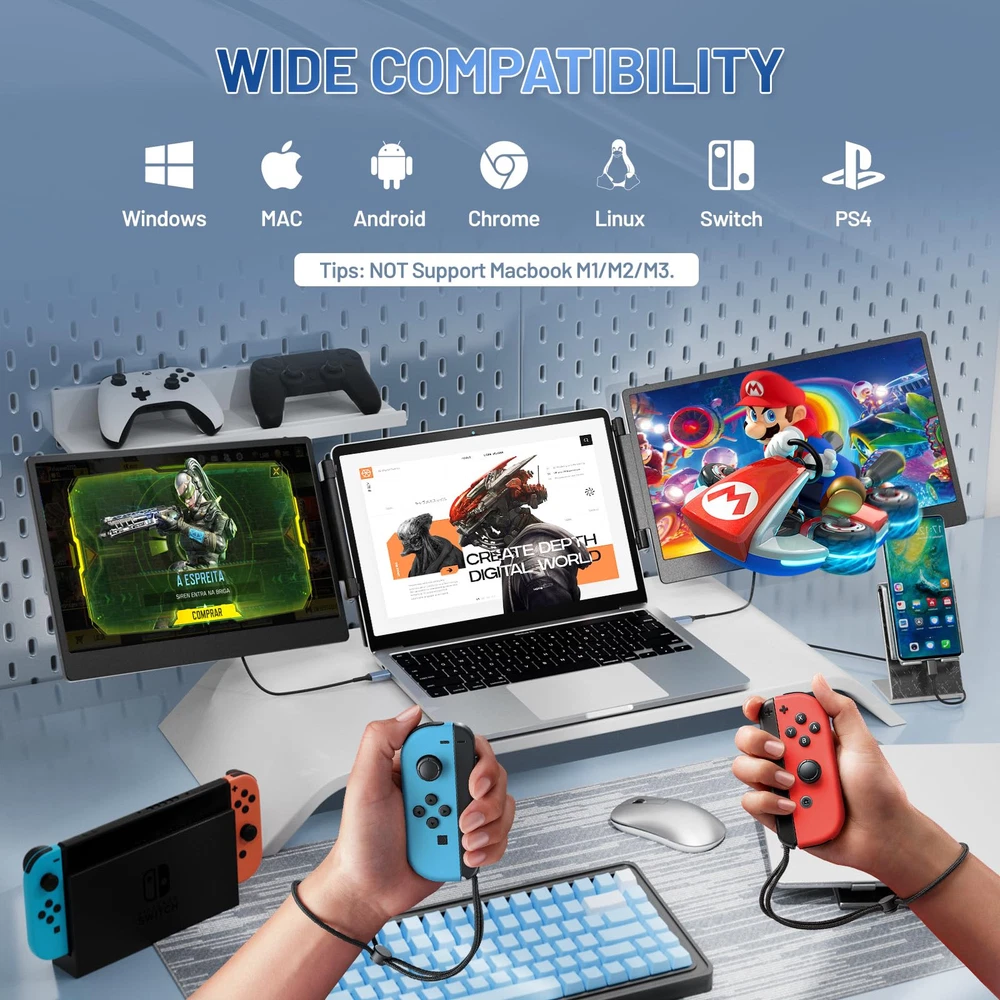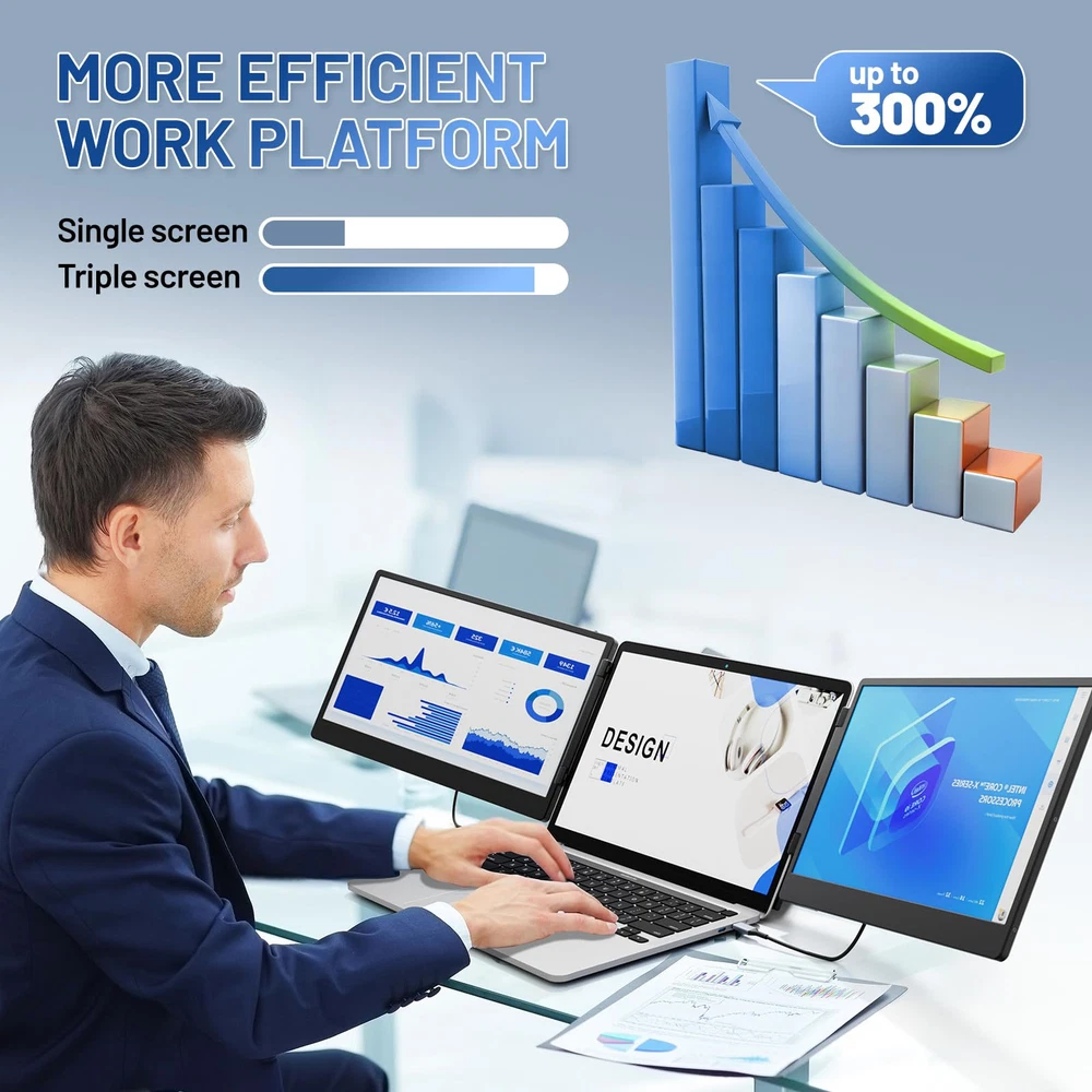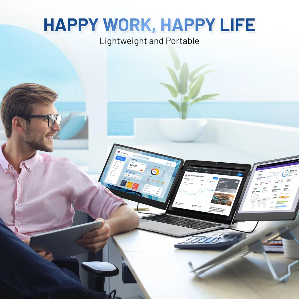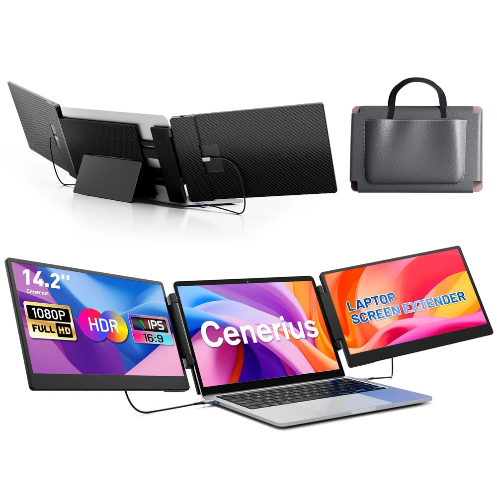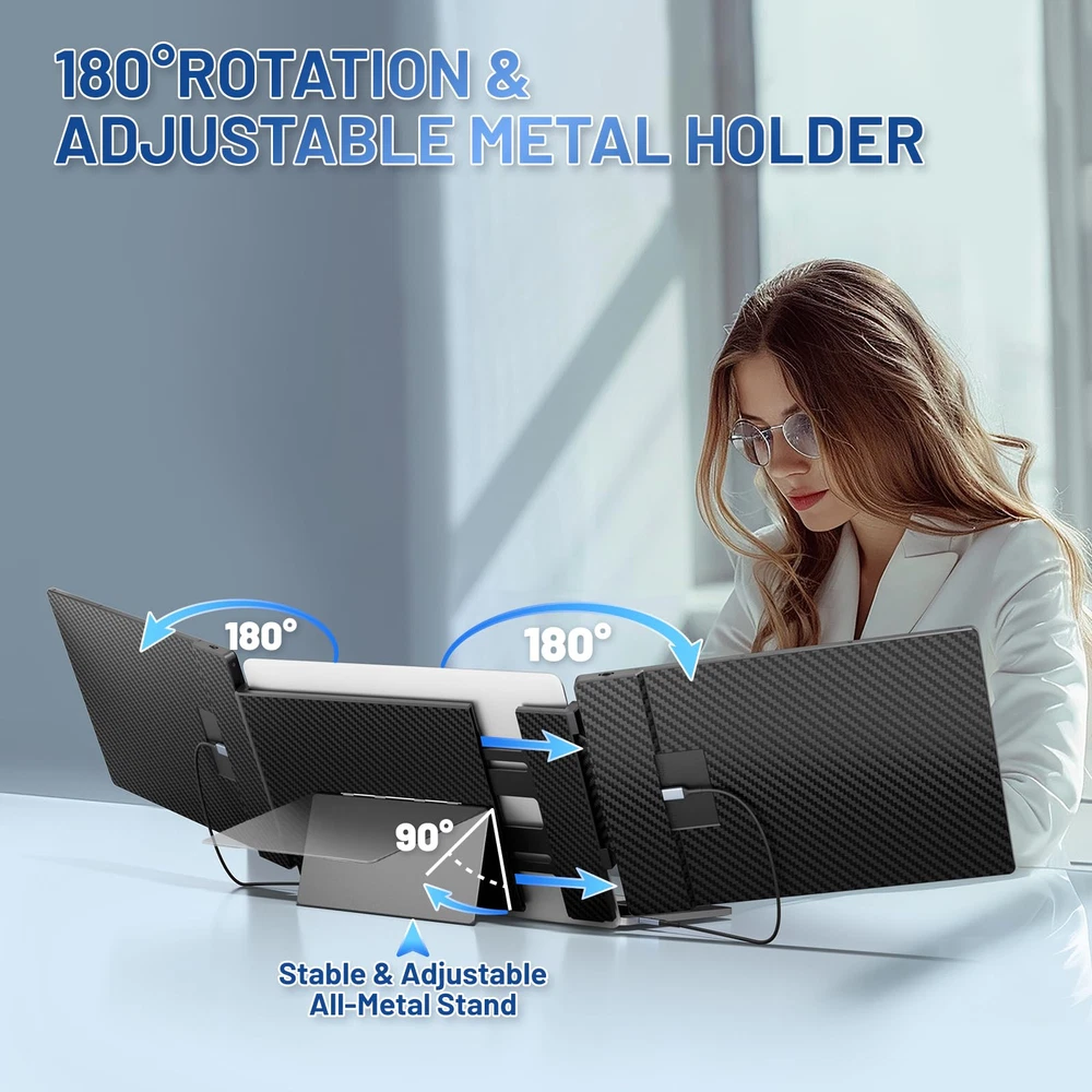 【Dual IPS Screens for an Enhanced Viewing Experience】The laptop screen extender boasts two 14.2-inch Full HD IPS screens, significantly elevating your screen experience. Delve into a vivid display that offers a 74% NTSC color gamut, 300 nits of brightness, and a 1000:1 contrast ratio, ensuring that every detail is crisply rendered. The inclusion of advanced low blue light technology, along with anti-glare and flicker-free features, ensures a comfortable viewing experience. 【Boost Your Productivity by 300%】The extender empowers you with extension, mirroring, and portrait modes, revolutionizing your workflow. This flexibility allows for efficient multitasking and can triple your productivity. The multi-function adjustment button offers precise control over display settings, enabling you to tailor the screen to your unique requirements, whether you're working, gaming, or streaming content. 【Versatile and Portable Design】The extender is designed for ultimate convenience, with a 90-degree folding kickstand that allows for easy storage and setup. Its crush-proof frame, equipped with rubber pads, safeguards your devices from scratches and damage. The flexible screen width adjustment caters to laptops of all sizes, making it a perfect companion for both home and on-the-go use. 【Plug-and-Play Compatibility】Enjoy effortless integration with the monitor extender, which is compatible with a diverse array of operating systems, including Windows, Mac OS, Chrome, Switch, Linux, and Android. This extender eliminates the need for drivers, streamlining the setup process to the utmost. Connect effortlessly using the included HDMI, USB-A, or Type-C cables and instantly supercharge your productivity. 【Exceptional customer support】Our commitment to quality goes beyond the product itself, so you can rest assured that you're choosing with a one-year warranty and a dedicated 24/7/365 after-sales support team. If you encounter any problems or have any questions about your setup, our team will be ready to help you within 24 hours to make sure you are worry-free.