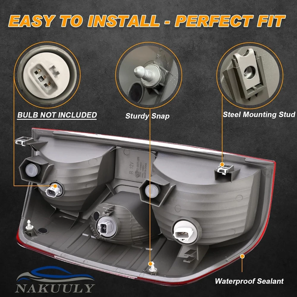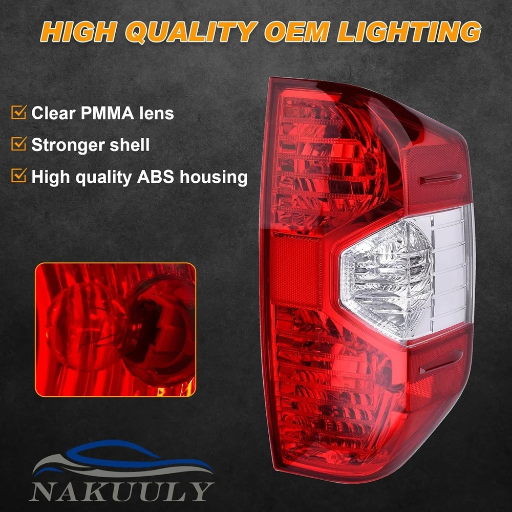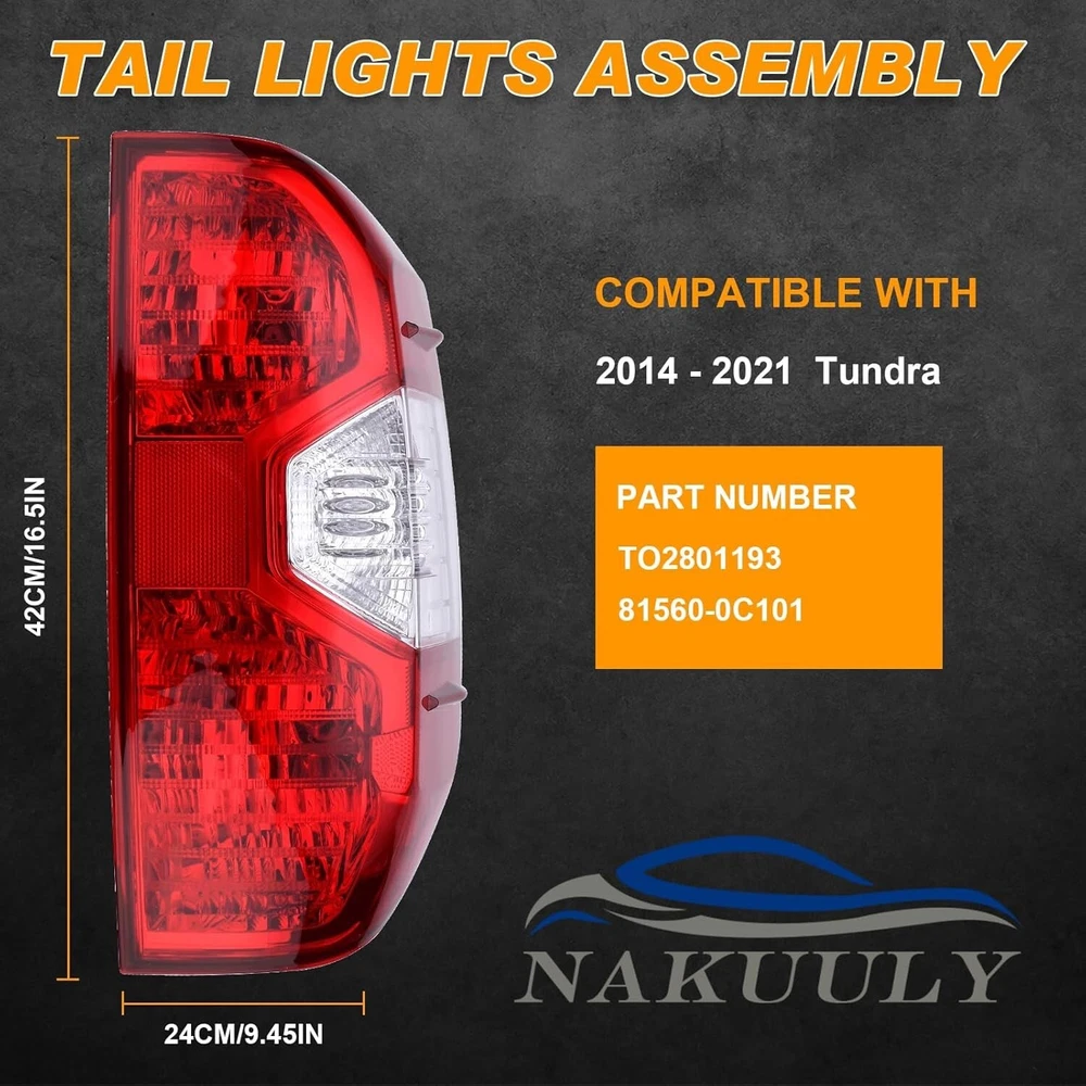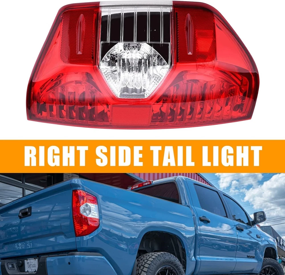 Tail Light Compatible With Toyota Tundra 2014-2021 Pickup Right Passenger Side Taillight Rear Brake Lamp Assembly without Bulb Replace# 81550-0C100 Brand Nakuuly Color Black Specific Uses For Product Rear Lights Vehicle Service Type Car Year 2021 Special Feature Waterproof Auto Part Position Rear Right Lens Color Red Lens Material Acrylic Manufacturer BaoSJ See less Light Source Type Halogen Voltage 12 Volts About this item Fitment: The tail light compatible with Toyota Tundra 2014 2015 2016 2017 2018 2019 2020 2021 Pickup. Replaces Part: TO2801193 81550-0C100 Quality: This structure of tail light is strong, with good shock resistance and impact resistance, and at the same time excellent waterproof effect, it can bring you a safer driving experience even in bad weather Easy to install: The taillights simple plug and play operations. No modifications required, direct replacement Package Included: 1 x Right Passenger Side tail light. Note: Bulbs and Harness are Not Included. Please use original bulbs