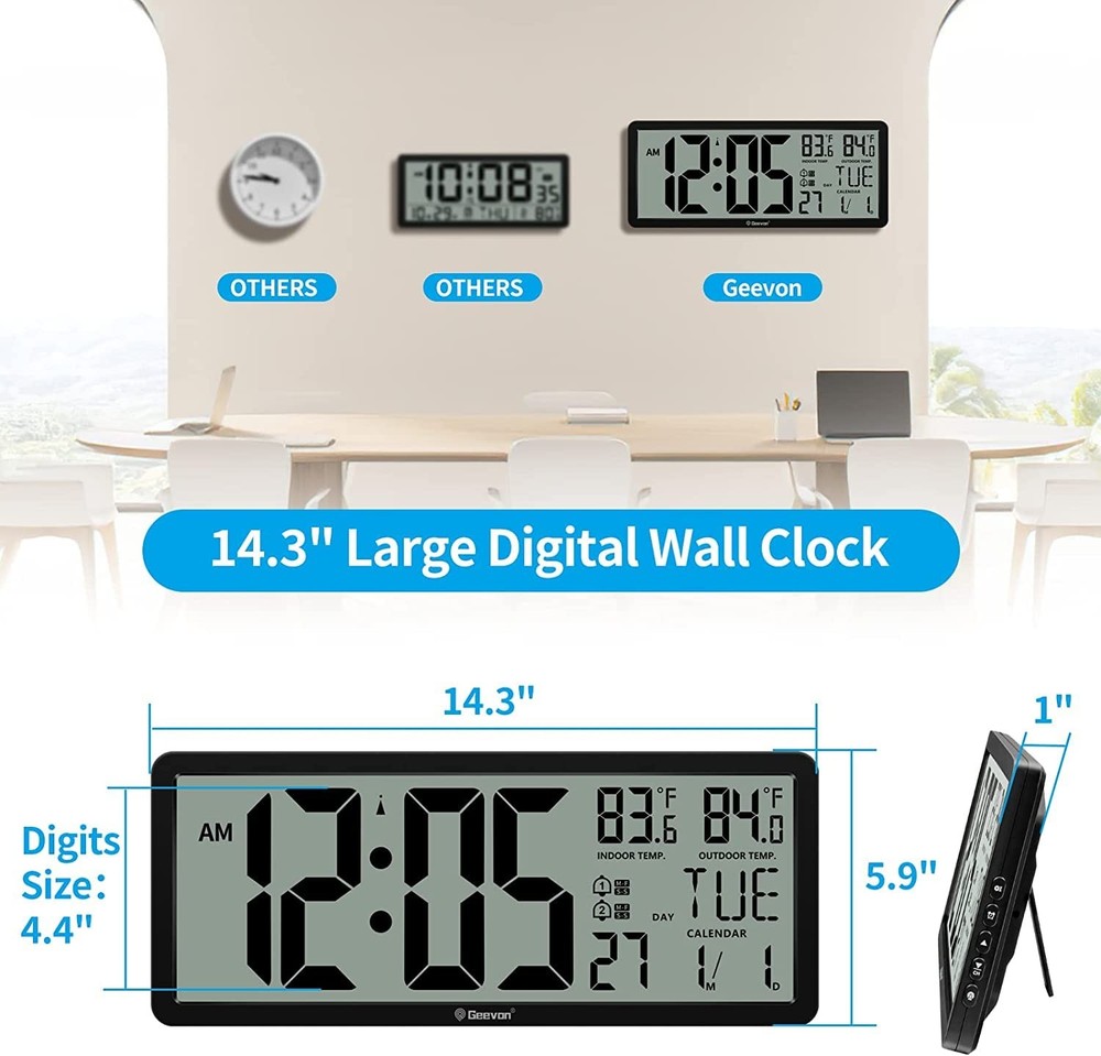 [14.3" Extra Large Digital Wall Clock for Elderly] Atomic Battery Operated Wall Clock(12/24H) is boasting 4.4-inch ultra-big digits, which is much much bigger than 16-inch Traditional Wall Clock, whose digit size is 1.8-inch.Make sure that our large display clock with temp can be seen clearly from a distance, even if you have some vision problems. [Enhanced Atomic Clock Technology] Atomic kitchen clocks wall battery powered will always be accurate to within one second as it receives daily WWVB updates, just select your time zone at the "SET"buttons of the large atomic wall clock for bedroom and turn on the DST if applicable. Automatically updates for daylight saving time,weekday,day,month,time,help you manage regular life. [Atomic Clock with Indoor Outdoor Temperature] Self setting alarm clock black with temperature monitor function,The Wireless outdoor sensor (Included) transmits the outdoor temperature ( ° F )to the large display digital clock for seniors. Which means you can put them inside your farmhouse, living room, kitchen, bedroom, patio, backyard, garden or courtyard,easily monitor outside conditions without going out. [14.3" Extra Large Digital Wall Clock for Elderly] Atomic Battery Operated Wall Clock(12/24H) is boasting 4.4-inch ultra-big digits, which is much much bigger than 16-inch Traditional Wall Clock, whose digit size is 1.8-inch.Make sure that our large display clock with temp can be seen clearly from a distance, even if you have some vision problems. [Enhanced Atomic Clock Technology] Atomic kitchen clocks wall battery powered will always be accurate to within one second as it receives daily WWVB updates, just select your time zone at the "SET"buttons of the large atomic wall clock for bedroom and turn on the DST if applicable. Automatically updates for daylight saving time,weekday,day,month,time,help you manage regular life. [Atomic Clock with Indoor Outdoor Temperature] Self setting alarm clock black with temperature monitor function,The Wireless outdoor sensor (Included) transmits the outdoor temperature ( ° F )to the large display digital clock for seniors. Which means you can put them inside your farmhouse, living room, kitchen, bedroom, patio, backyard, garden or courtyard,easily monitor outside conditions without going out. [Dual Alarms & Snooze Function] Not only a Calendar and Thermometer, but also can be used as a loud alarm clock for bedroom. Set 2 separate alarms repeating in M-F, S-S, or M-F and S-S for different purposes. The alarm of radio controlled clock will automatically turn off if left alone for 2 minutes. With a snooze function, this atomic rectangular wall clock allows you to set 5 ~ 60 minutes’ sleep time or turn the SNOOZE function off - A step towards practical use. [Digital Clock Large for Wall or Desk ] battery powered atomic clock is powered by 4AA batteries(not included), no redundant wires. The wall mounted digital clock can hang on the wall or the table for standing (bracket Included), which helps you place your digital desk clock large display anywhere to fit your home's needs!
