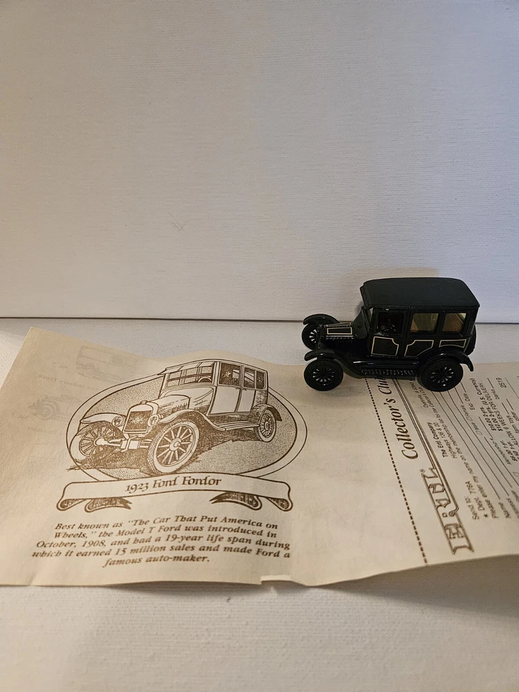 This model is a 1:43 scale diecast of a 1923 Ford Fordor produced in 1985 by Ertl as part of their Vintage Vehicles series. The car is black with gold color accents and represents a classic Ford vehicle from the early 20th century. It is detailed to capture the essence of the vintage Ford design, making it a desirable collectible for car enthusiasts and diecast collectors of all ages. *Original box is included. Item has been displayed in an enclosed case and is in like-new condition. The box has been stored in an attic and may show age and/ or wear. *