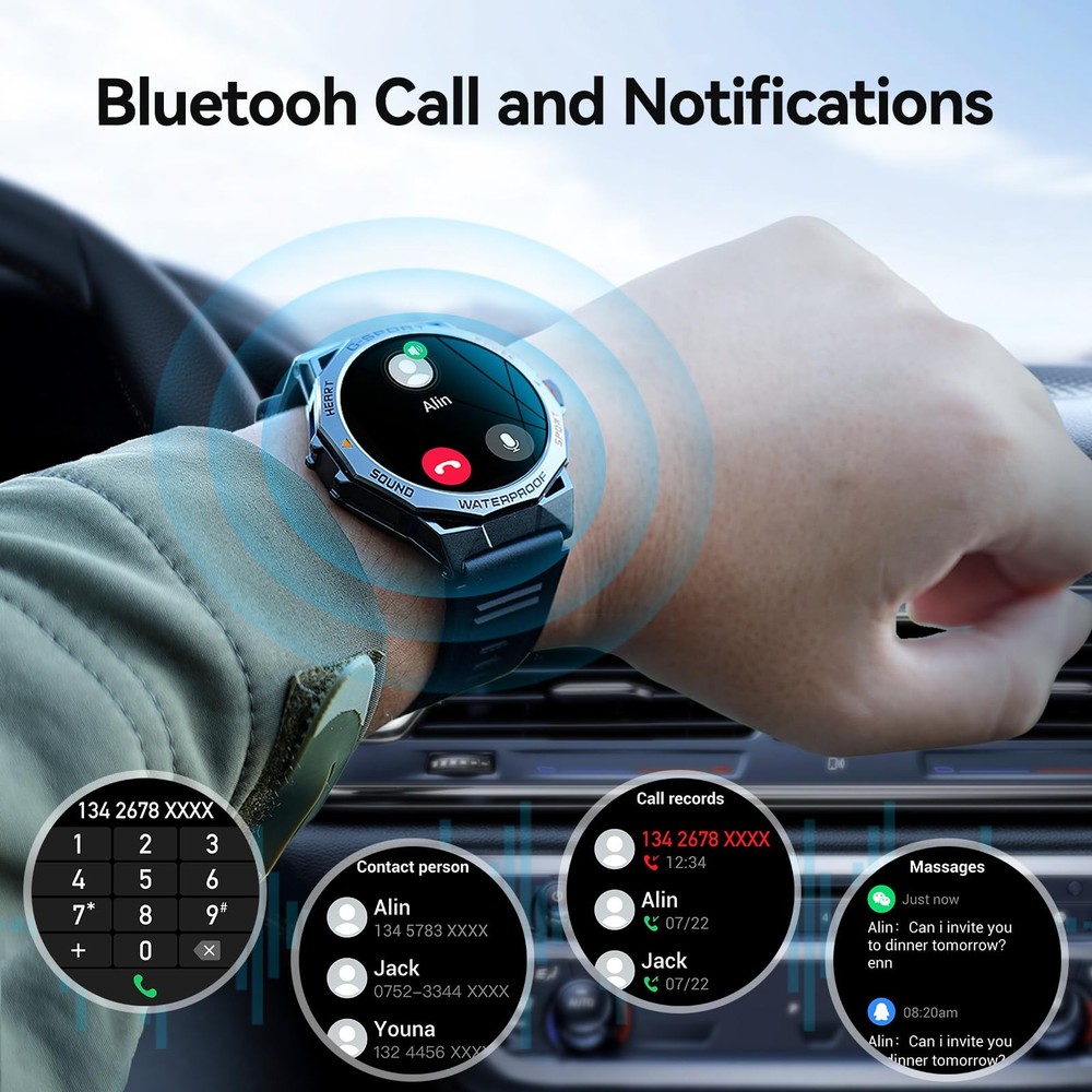 ,1.43" Amoled for Android Phones,10ATM Waterproof with Bluetooth (Answer/Dial Calls) Ultra Long Battery Life,100+ Sports Modes ⌚【1.43'' AMOLED Always-on Display】The durable for men features a high-resolution 1.43'' AMOLED touchscreen with a resolution of 466*466. This touhscreen not only provides clear content display, smooth operation, and visual experiences but also enables the use of an extremely energy-efficient Always-On Display function, where the screen remains constantly on. ⌚【Rugged Military 】- military for men is designed in outdoor tactical style with exquisite craftsmanship,the men's has been tested by dozens of standards such as extreme temperatures, low pressure, dustproof, and so on, and its unique combination of composite material and military-metal case ensures the 's durability and functionality. ⌚【Bluetooth Calling & Notifications】This men's is equipped with a high-quality speaker and microphone for clearer sound and smoother calls. The can receive calls, messages, and notifications from applications such as Facebook, WhatsApp, Twitter, , and more. Each time a notification is received, the vibrates to alert you, ensuring you don't miss any important calls or messages. ⌚【Multifunction and Broad Compatibility】- for men also offers many useful features such as a calculator function, weather forecast, music player, stopwatch, alarm clock, etc.Bluetooth is with cell phones with Android 4.4 and IOS 8.0 and above. ⌚【Fitness Tracker with 100+ Sports Modes】fitness supports 100+ sports modes, including walking, running, basketball, soccer, cycling, hiking, and more. There are 100+ exercise options in the FitCloudPro app that you can choose and replace on the . Men's sports will automatically and accurately record your exercise data such as steps, calories, distance, and activity time to help you exercise scientifically. Set an exercise goal for yourself and work hard to achieve it.