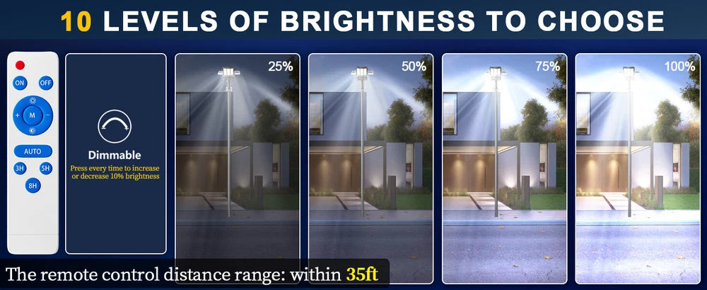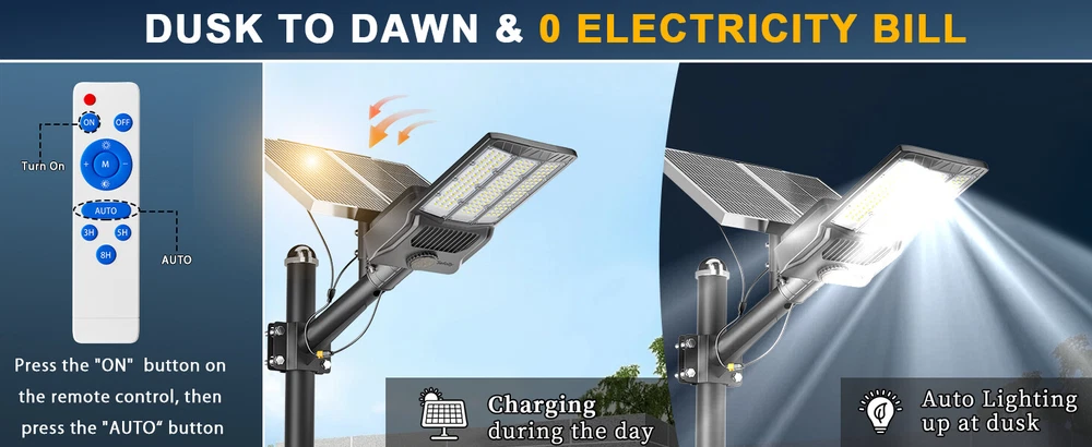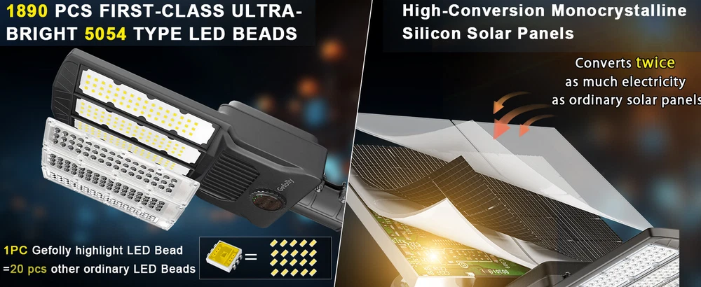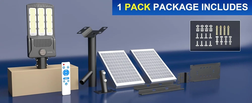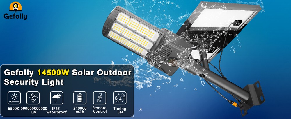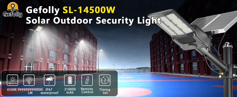 Gefolly SL-14500W solar security light is built-in 1890pcs 5050 ultra bright LED lamp beads and 210000mAh battery (lifetime up to 99,900 hours). Provides a 6500K, IP67 waterproof rating, and works normally even in bad weather all year round. Solar powered, no electricity bill, auto turns on at dusk and charging during the day, Continuous lighting up to 30 hours (when fully charged). Best for commercial and home lighting. Note: The remote controls that come with the light are available in white and black. The white and black remote controls are shipped randomly. 14500W Commercial Solar Street Lights Outdoor Dusk to Dawn parking lot lights 【20 times high lumen LED beads & using Fresnel lens technology】 LED lamp beads also use Fresnel lens technology, built-in large chip and large battery capacity, which can produce a high-brightness output of up to 9999999999000LM.Designed with 1890pcs first-class super bright 5054 type LED beads, 1 of our Gefolly beads is as bright as 20 ordinary beads. The lighting area is up to 4800 square feet, reducing lighting blind spots. Escort for the safety of you and your family. The first choice for night lighting. 【Solar Powered & 0 Electricity Bill】 Gefolly SL-14500W solar security light is built-in 1890pcs 5054 ultra bright LED lamp beads and 210000mAh battery (lifetime up to 99,900 hours). Provides a 6500K, IP67 waterproof rating, and works normally even in bad weather all year round. Solar powered, no electricity bill, auto turns on at dusk and charging during the day, Continuous lighting up to 36 hours (when fully charged). Rainy days can be work, and working about 50 hours in dim mode. Best for commercial and home lighting. Note: The remote controls that come with the light are available in white and black. The white and black remote controls are shipped randomly. 【 2xhigh-quality monocrystalline silicon solar panel + ABS high-end plastic with international certification +Heavy-duty all-welded aluminum mounting arm 】 The Gefolly lights can endure a wide temperature range from -20°C to 105°C, enabling them to function reliably even in the harshest weather conditions. They are highly resistant to lightning strikes, heavy rain, oxidation, and prolonged exposure, ensuring long-term durability and stable performance. The Gefolly IP67 waterproof solar street lights designed for commercial parking lots and Courtyard are crafted with top-notch ABS and die-cast aluminum frames, complemented by nano-scale waterproof coatings. Their robust engineering design endows them with IP67 waterproof capabilities and 6K high-voltage surge protection. 【2 control modes & Industrial street lamp level】 This solar street lights outdoor waterproof have 2 different control modes. 1. Dusk to Dawn Mode: street light automatically turn on at dusk and automatically turn off at dawn; 2.Always Lighting Mode: solar street lamp stay on 100% brightness, there are 10 levels of brightness that can be adjusted.The street lamp has reached the level of industrial street lamp, passed CE, FCC, ULC certification, and is widely used in commercial occasions and home courtyards. It has a 50% increase in durability and a 150% increase in brightness than ordinary street lamps to meet your various needs. 【210AH Large Capacity Battery & Power Capacity Indicator Light】 The solar street light has a built-in 210Ah lithium battery, which is more stable and durable. Equipped with 2 solar panels, compared with ordinary solar lights, our lights can absorb twice the solar energy during the day, convert it into double electricity and store it, and output it in the form of light energy at night. Photoelectric conversion rate as high as 32.5%.With 4 power capacity indicator light, more intuitively understand the remaining power of the lamp during use. 【3 Year Product Protection 】 We offer a replacement for broken item. For any questions about the parking lot lights commercial, please feel free to consult our customer service team.We carry different wattages for you to choose Wall Mounting Recommended Height: 10-26ft Lighting Area Range: Max 9800sq.ft Pole Mounting Recommended Height: 10-26ft Lighting Area Range: Max 9800sq.ft Recommended Pole Diameter: 1.77in-3.94in Ideal For: Residential & Commercial Areas: Illuminate driveways, gardens, pathways, parking lots, and streets. Eco-Conscious Users: Reduce carbon footprint with 100% solar-powered energy. Cost-Saving Solution: Zero electricity bills—sunlight is your power source! Brand ‎Gefolly Color ‎Black Material ‎Aluminum Style ‎Industrial Light fixture form ‎Wall Room Type ‎/ Product Dimensions ‎21.85"L x 13.88"W x 2.8"H Specific Uses For Product ‎Garden Indoor/Outdoor Usage ‎Outdoor Power Source ‎Solar Powered Installation Type ‎Surface Mount Special Feature ‎Waterproof Control Method ‎Remote Light Source Type ‎LED Finish Type ‎Powder Coated Shade Material ‎Plastic Number of Light Sources ‎1890pcs Light Color ‎cool white Shape ‎Rectangular Included Components ‎210000mAh battery, 2 solar panels, remote control, wall and pole mount accessories, set of accessories Warranty Type ‎Extended Lighting Method ‎LED Number of Items ‎1 Wattage ‎6.5E+3 Controller Type ‎Remote Control Switch Type ‎Remote Control Unit Count ‎1.0 Count Water Resistance Level ‎Waterproof Brightness 999999999999990000lumen Mounting Type ‎Wall Mount Shade Color ‎Black Fixture Type ‎Non Removable Assembly Required ‎Yes Manufacturer ‎Gefolly Recommended Uses For Product ‎outdoor lighting for commercial and residential areas, parking lots, sports facilities, garages, gardens, and pathways Model Name ‎Solar Light Part Number ‎SL-14500W-LED Item Weight ‎24 pounds Item model number ‎SL-14500W Batteries ‎8 Lithium Polymer batteries required. (included) Finish types ‎Powder Coated Special Features ‎Waterproof Package content 1 x Solar Street Light (Mounting Pole is INCLUDED) 1 x Remote Control 1×Nut