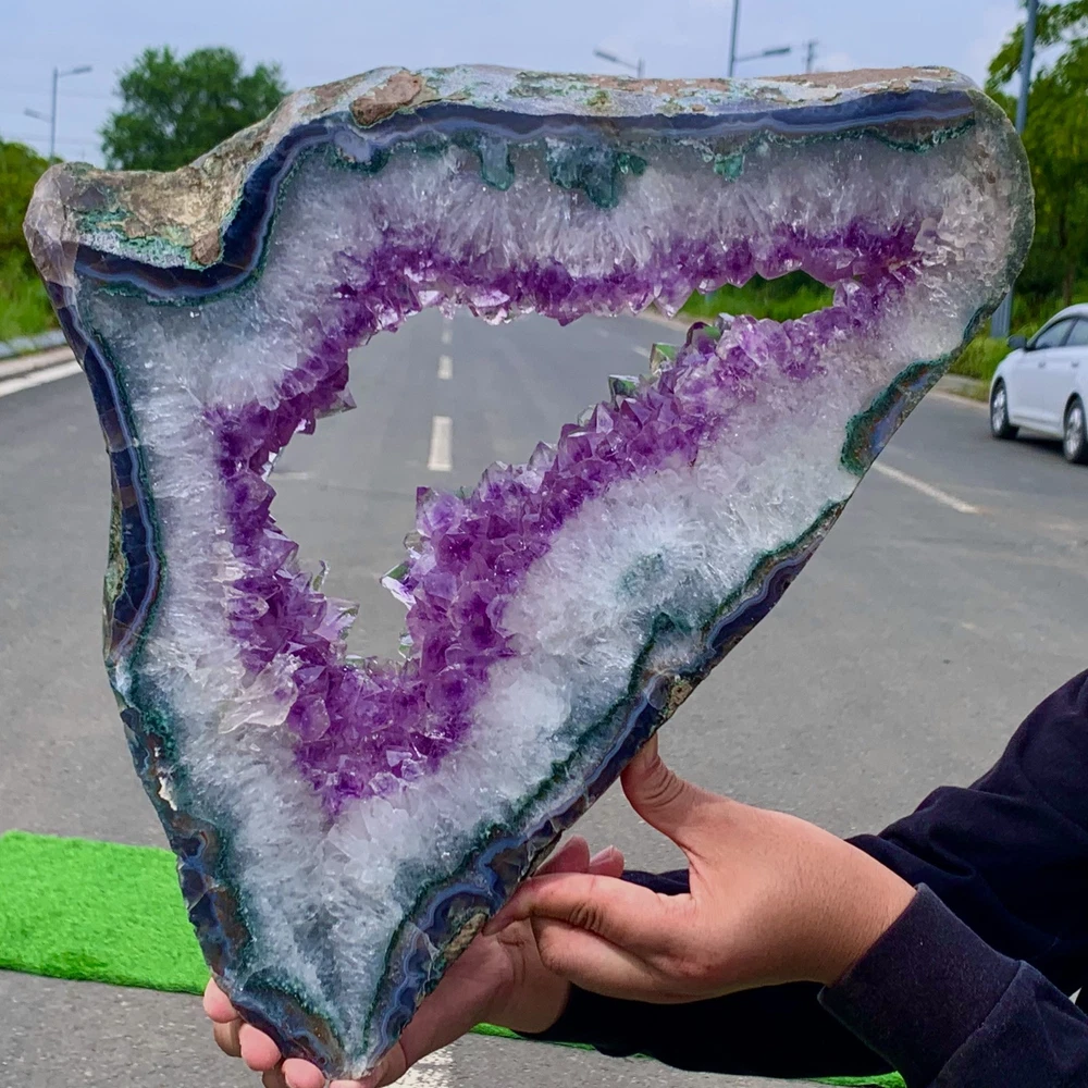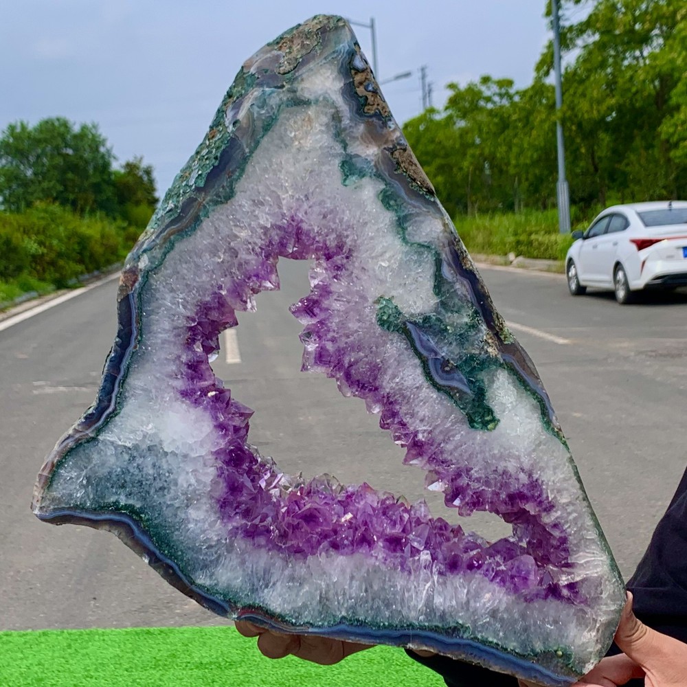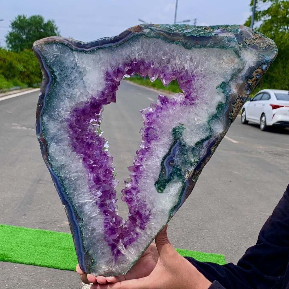 I received the specimen pictured in the listing however it was significantly less color saturated and greener than what was shown in the listing. What appears to be ice blue crystals on a dark purple base is in reality greenish blue crystals on a light purple base. The seller offered a partial refund in consideration of this, and I agreed.