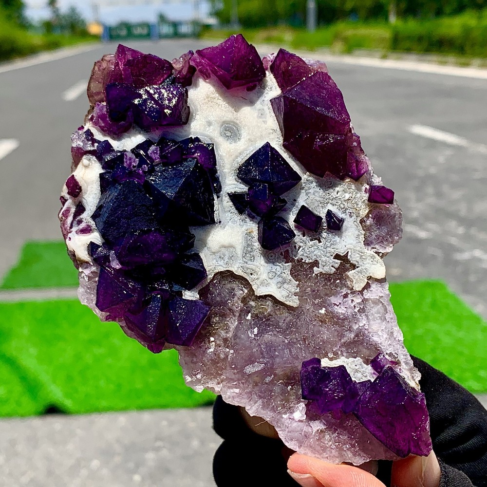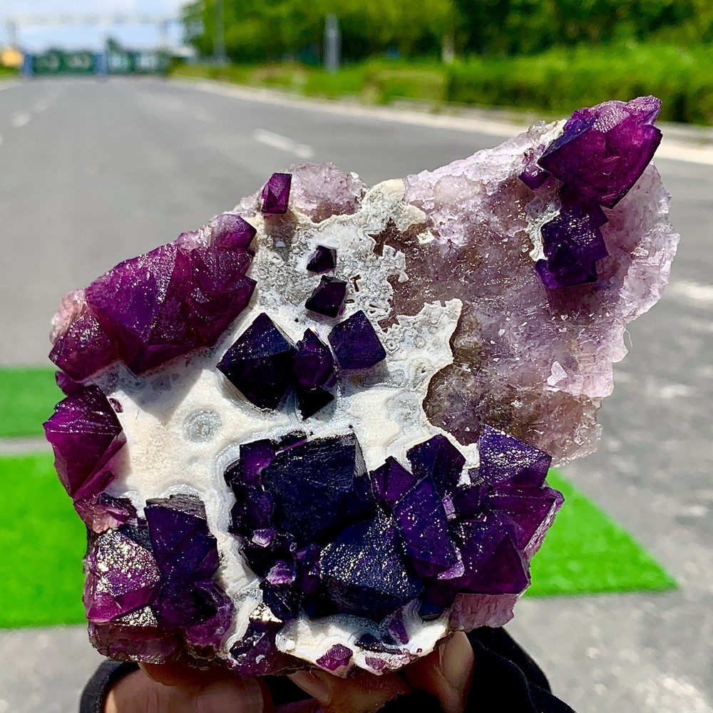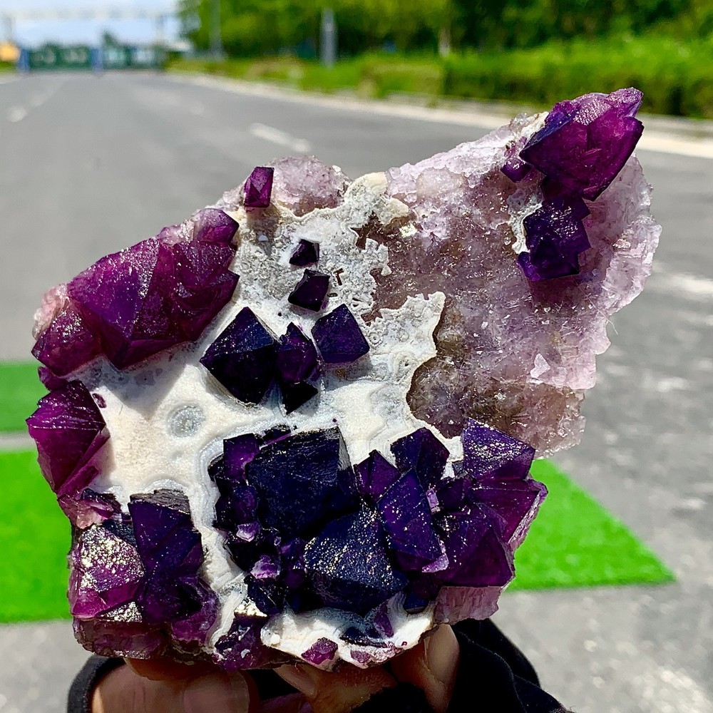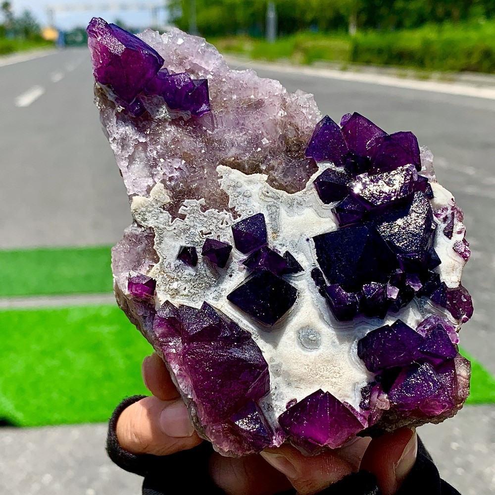 I received the specimen pictured in the listing however it was significantly less color saturated and greener than what was shown in the listing. What appears to be ice blue crystals on a dark purple base is in reality greenish blue crystals on a light purple base. The seller offered a partial refund in consideration of this, and I agreed.