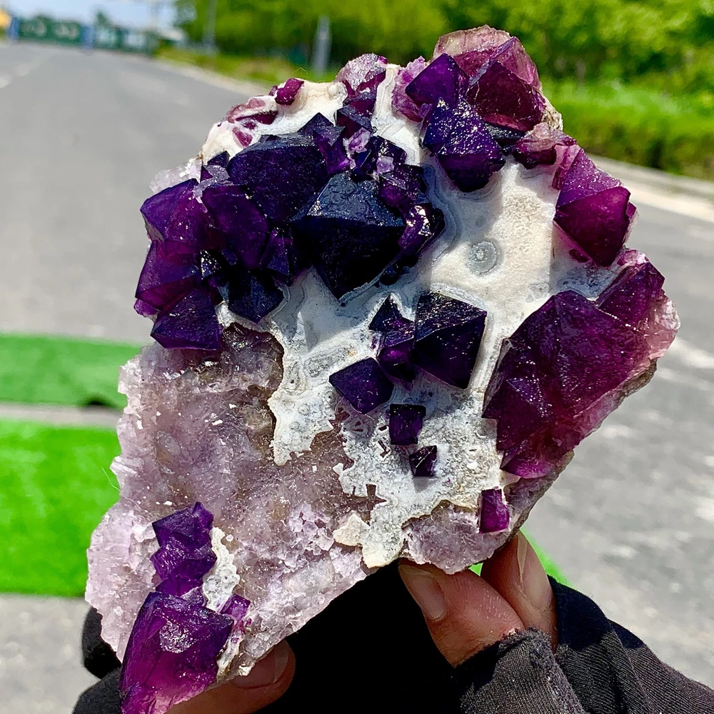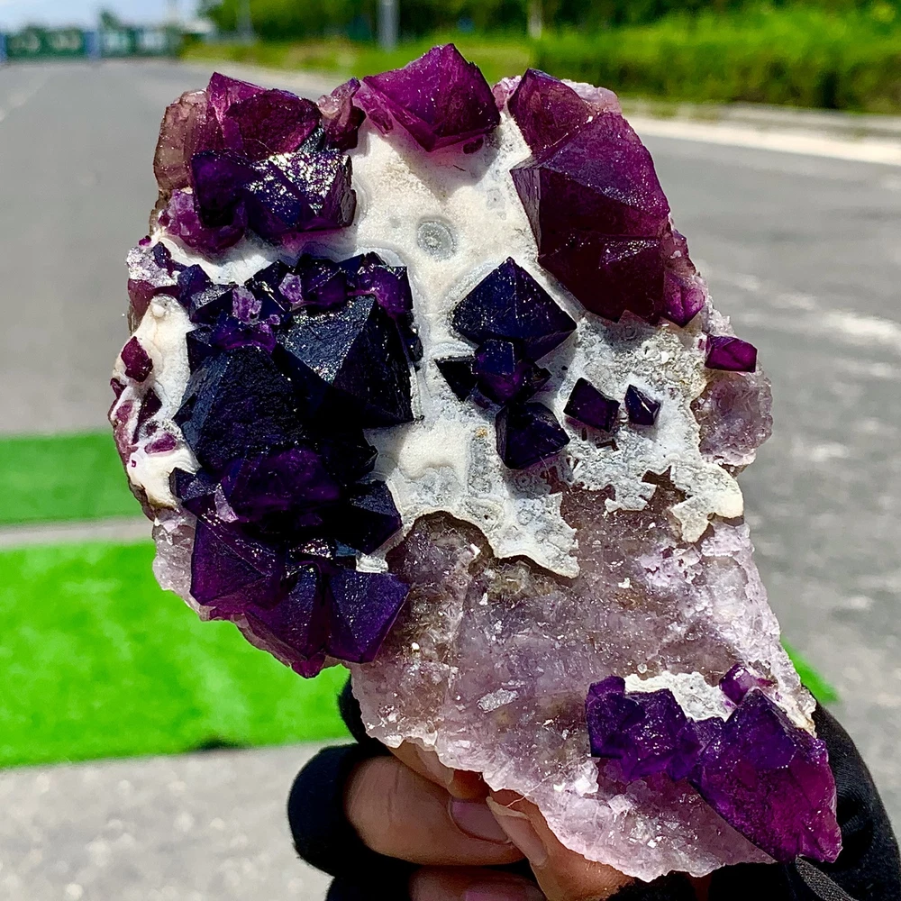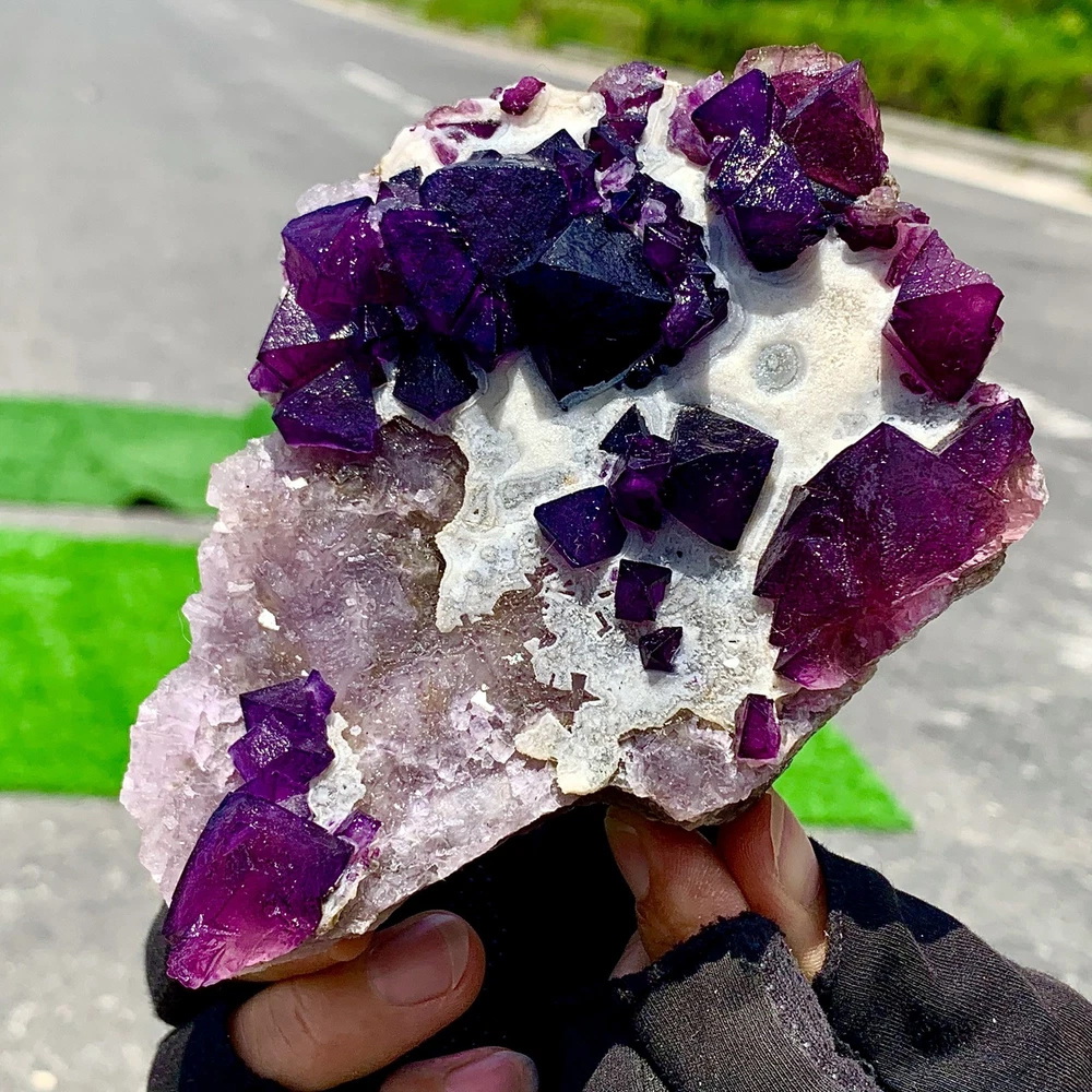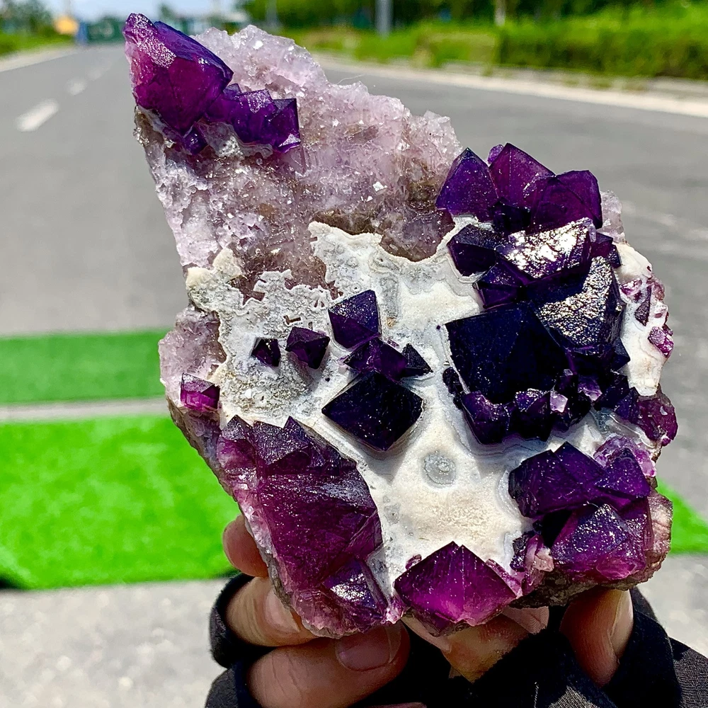 I received the specimen pictured in the listing however it was significantly less color saturated and greener than what was shown in the listing. What appears to be ice blue crystals on a dark purple base is in reality greenish blue crystals on a light purple base. The seller offered a partial refund in consideration of this, and I agreed.