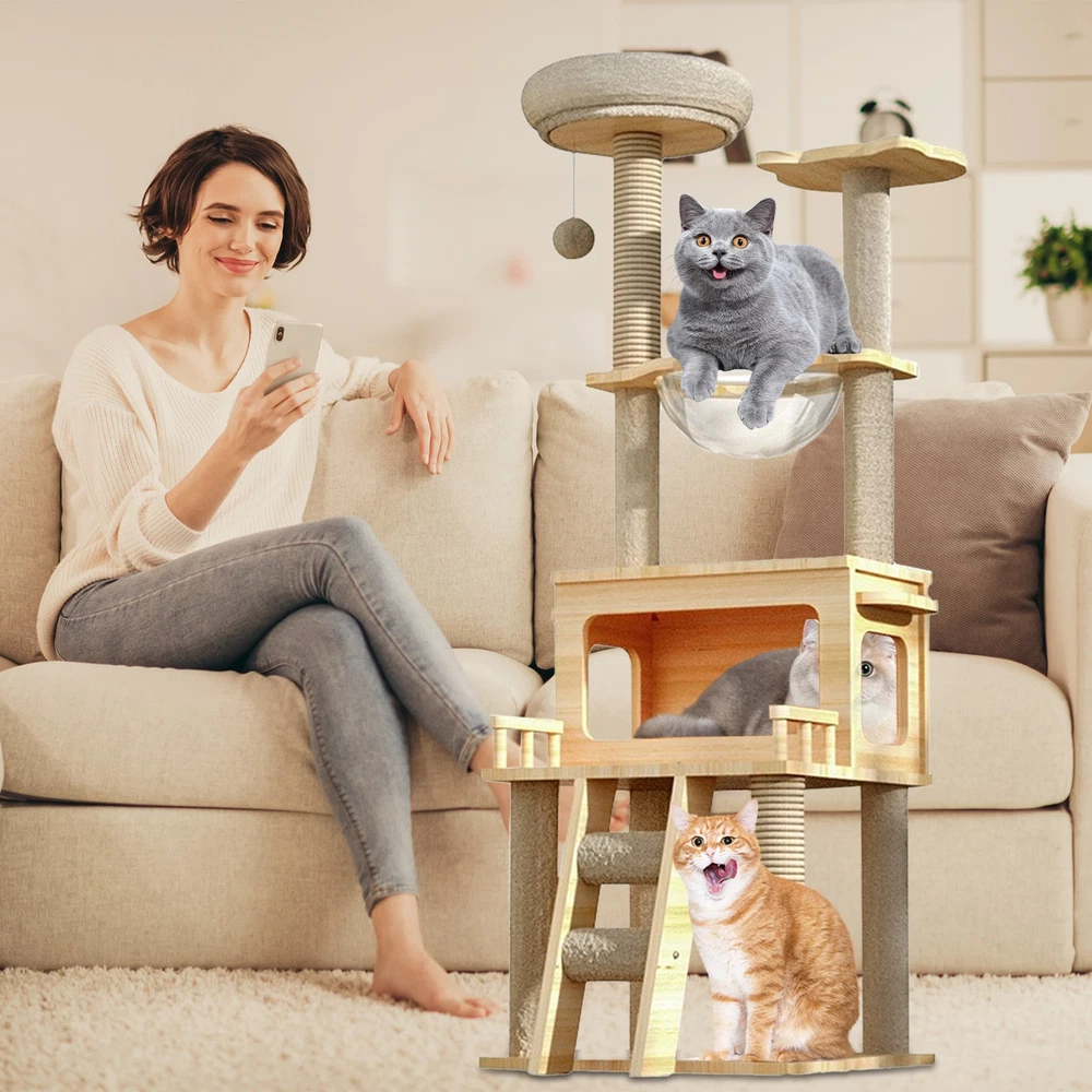 Store category Sign Up Now ! You may also like Product Description Sturdy Support: Crafted with robust MDF, this cat tree promises enduring stability and a sleek, modern design, ensuring a safe and stylish haven for your large feline friends.\nTop Perch: Designed with a top perch for panoramic views, multiple levels for exploration, and a cozy condo for restful retreats, this cat tree is a haven for large cats.\nCats Stay Active: With sisal rope scratching post wraps, this tree meets your cat's instincts and keeps them entertained, ensuring claws stay healthy.\nCozy Relaxation Station: Designed for large cats, this tree features a 360-degree clear spaceship hammock, providing a secure and elevated resting place where your cat can swing and stretch in comfort.\nClimbing Haven for Felines: Designed with multiple levels, this cat tree provides a variety of scratching posts at different heights, ensuring your large cat can stretch, scratch, and stay active.\n\nThis cat tree is perfect for large cats! With stability and durability, your pet will have a safe place to play and climb. The condo is great to snooze and hide, while the sisal rope scratching post keeps cat claws healthy and entertained. The scratching posts give your furry friend plenty of options to scratch, while the comfortable and relaxing resting place is perfect for your cat to rest after playtime.\n\nSpecification Product Name: Cat Tree Tower Material: Wood, Sisal Rope, Hardware, Etc. Product Size: about 147x50x50cm/57.87x19.69x19.69 inches Product Weight: about 13.5kg Suitable For: Cats Application Scene: Indoor, Outdoor\nPack List: 1 x Cat Tree Tower Note: Due to different lighting and screen settings, the item color may be slightly different from the picture. Due to different manual measurements, please allow a 1-2cm difference in size. Payment Delivery details Terms of sales About us Feedback & DSRs Payment Before you palce an order, please kindly make sure that you have a paypal account. We accept PAYPAL payment only. Payment should be completed within 2 days after auction closed, or unpaid dispute will be filed for an closing auction. An unpaid case will be filled after 4 days. Delivery details We ship to your eBay address. Each package will be shipped to US by UPS Regular Parcel with tracking number. Please check your shipping address carefully before checkout, it can't be changed if order completed. All items will be shipped within 1-2 business day upon receipt of payment.Orders placed on weekend will be shipped within 3 days. If you do not receive your item in 7-10 business days.please contact us immediately for further assistance. We will be responsible for any damages or losses incurred in the shipping process. About us We maintain high standards of excellence FIVE STAR and strive for 100% customer satisfaction! Positive Feedback is very important to us. We hope that you contact us immediately Before you give us neutral or negative feedback, so that we can satisfactorily address your concerns. We promise to offer the lowest price and high quality produce. Our working time: From Monday to Friday(9:30 am to 18:00pm), we don't working on holidays ,hope you can understand and know that , thank you. Please always talk to us via ebay Message. We appreciate your business and look forward to growing our e-Bay sales with satisfied customers. Feedback Contact us If you have any questions, please feel free to contact with us by ebay Message during our business hours ( 9:30a.m. to 5:30 p.m.), or email us through eBay, we will try our best to help you to resolve it. For any presale or after-sale questions,please do feel free to email us! Due to the time difference, each email will be replied within 1 working day,and weekend will be delayed a bit. Feedback