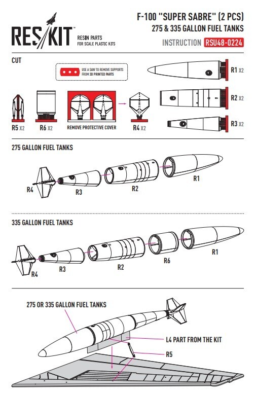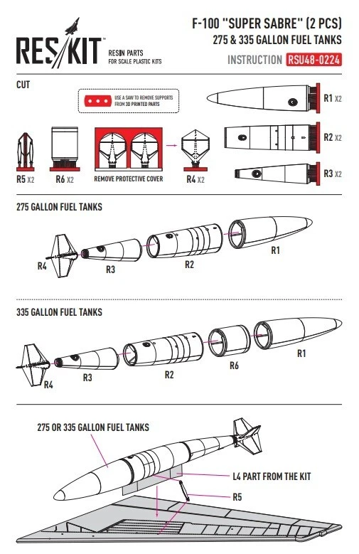 This ResKit fuel tank set is a fantastic upgrade for any 1:48 F-100 Super Sabre model! The details are crisp and clean, with excellent fit thanks to precise 3D printing. Even though it's unpainted and unassembled, the parts go together smoothly—great for both beginners and experienced builders. The 275 & 335-gallon tanks add realistic depth to your display. Highly recommended for scale accuracy and quality!