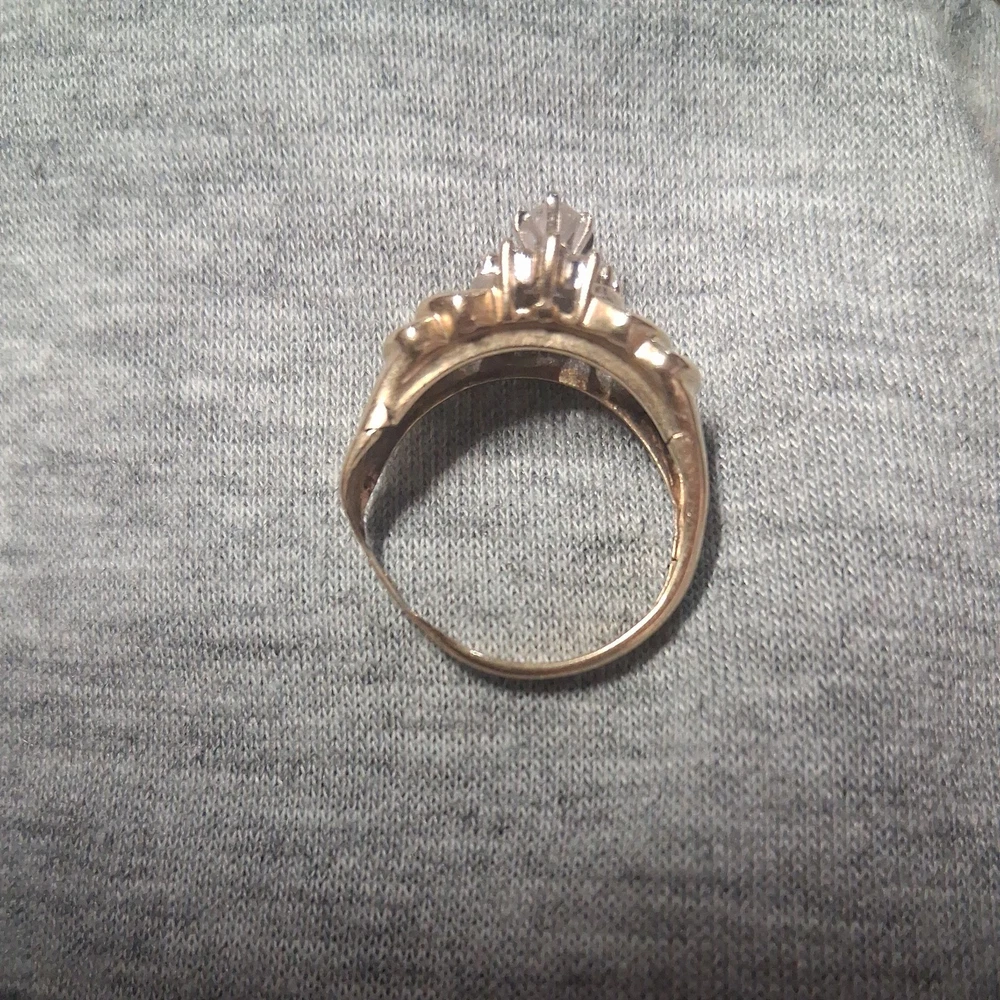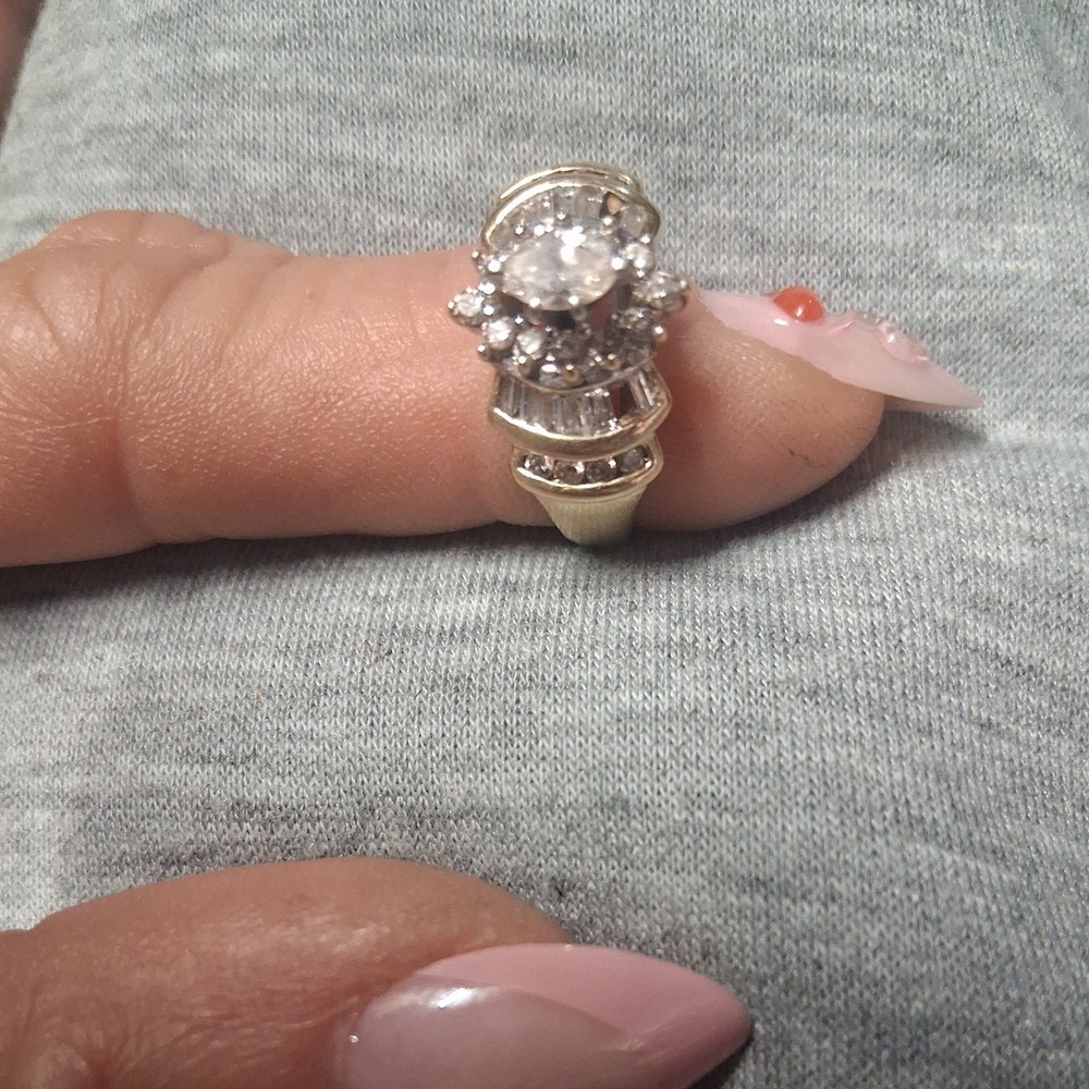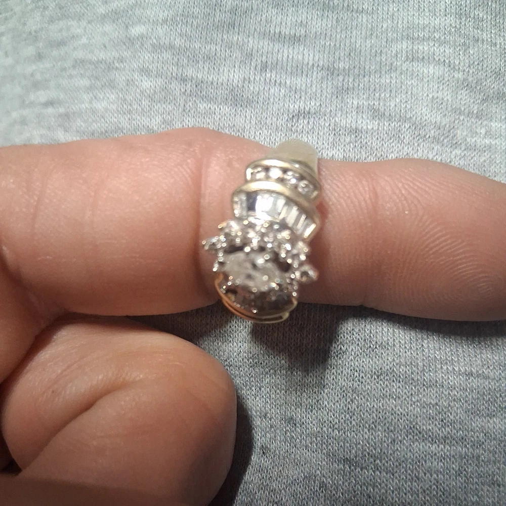 This product is a stunning 1.49ctw Marquise Cut Diamond with Halo Engagement Ring crafted in 14k Yellow Gold. The ring features a beautiful main diamond with an estimated carat weight of .53ct, secondary diamonds with an estimated carat weight of .60ctw, and a diamond clarity grade of Slightly Included (SI2). The ring has a halo setting style and a metal weight of 4.20dwt. With a ring size of 6 and a main stone length of 7.8mm, this elegant piece of jewelry is perfect for any woman looking for a breathtaking engagement ring. It has two diamonds missing one on each side in the same place. and it is bent just a little but it can be fixed, it can be worn with it bent. this is why the price is lower than it's appraisal is.