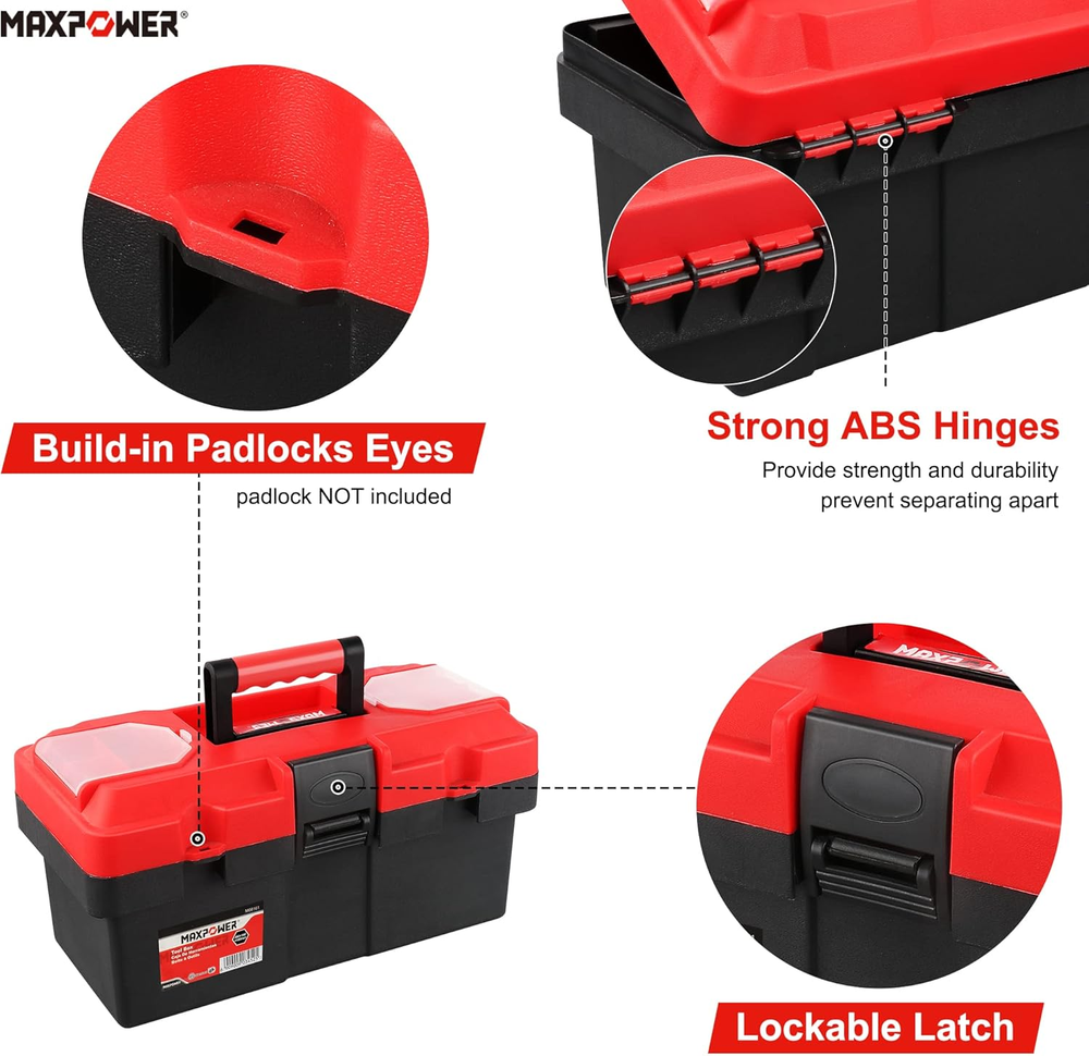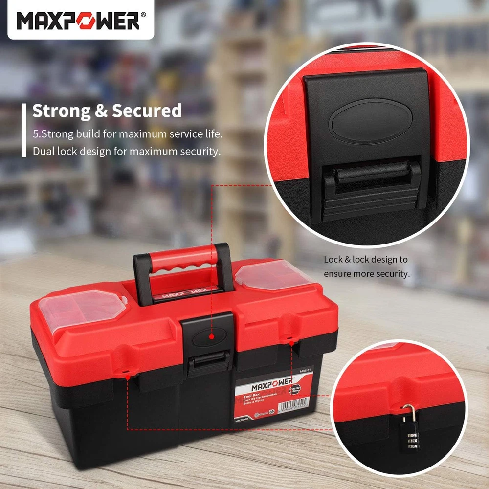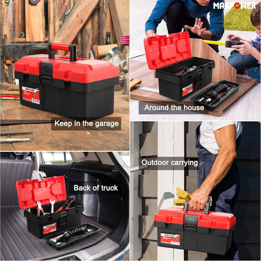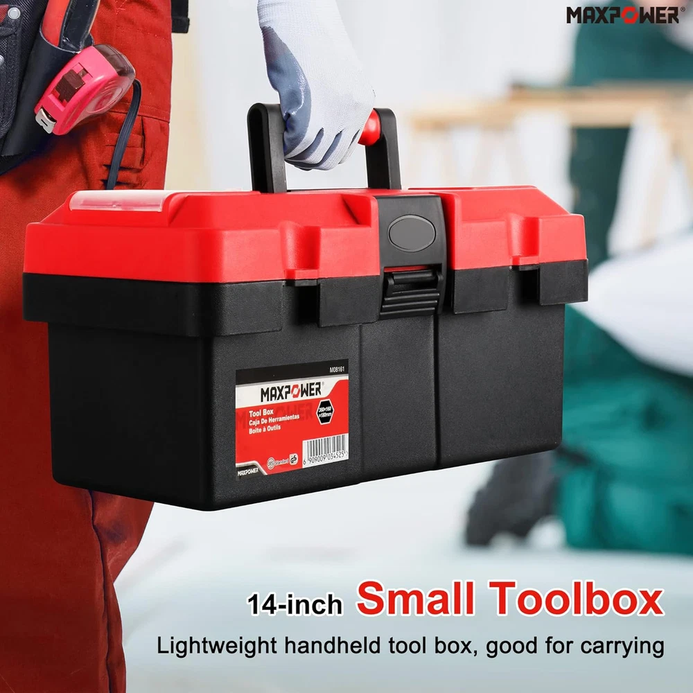 14-inch Toolbox, Internal size 12.99" x 5.51(Lx H), External size 14.17" x 6.3" x 7.09" (L x W x H), around 2 pound Small handheld tool box good for the car and household, lightweight for carrying Made of Rugged polypropylene resin construction, empty plastic tool box with removable trays, fit to storage small wrenches, sockets,screwdrivers Red tool box with lock hole, and transparent small-parts organizer on either side, to store small screw, nut etc (LOCK NOT INCLUDE) MAXPOWER tool box is great choice as gifts for women, men and kids, orangized the hand tools, compact size for easy storage Product Description Small tool box great for around the house and outdoor carrying Dual Lock Design for Maximum Security Portable and Lightweight Durable Plastic Construction and Removable Tray About Toolbox Dimensions ( Please allow 1-3 cm difference ) Overall Dimensions Length x Height : 14.17 x 7.09 inch / 36 x 18 cm Internal Dimensions Length x Height : 12.99 x 5.51 inch / 33 x 14 cm Tool-box Width Width : 6.3 inch / 16 cm Removable Tray Dimensions Length x Width : 13.58 x 5.11 inch / 34.5 x 13 cm