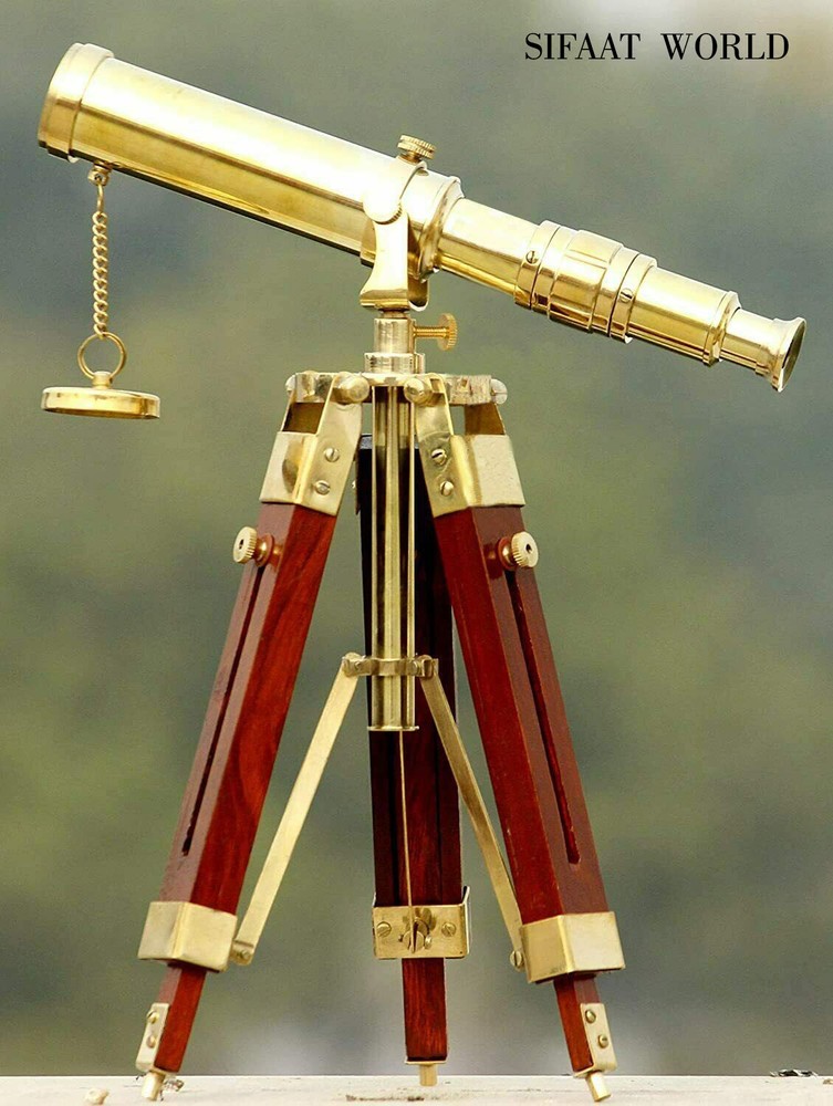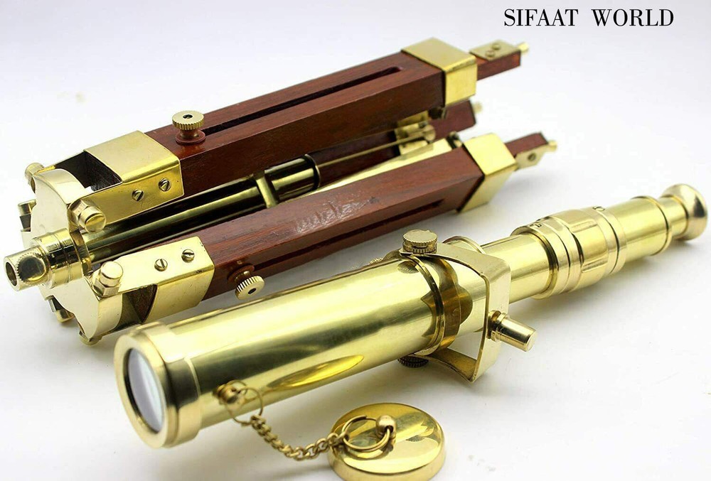 Sifaat World 14" Solid Pure Brass Fully Functional Telescope with Beautiful Tripod Stand (Replica), Nautical Decor Material Brass, Glass & Wood Water resistance level Not Water Resistant Focus type Color Center Focus Brown & Golden About this item Handmade Retro Style Functional Shiny Brass TELESCOPE With Tripod Stand (Total Height With Tripod Stand i.e. TELESCOPE Mounted on Stand= 14 Inches approx.) Solid Brass Made Fully Functional TELESCOPE - Sturdy Wooden Height Adjustable Tripod. Protects The Objective Lens with Brass Cap. Telescope Tube Length : 10 Inches approx . TELESCOPE Suitable For Home & Office, Balcony Decor, Decorative Prop, Hallway, Living Room and Many More. Shiny Brass Finish - Classic Interior Designed. Focusing Is Accomplished by Adjusting the Eye Piece Ring On the TELESCOPE Tube With Upto 15x Magnification. Product description This Wonderful TELESCOPE is the Sifaat World 14" Solid Pure Brass Brown Leather Fully Functional Telescope With Tripod Stand . Some Special features of this Beautiful TELESCOPE are given below : 1. 15x Magnification Large Image Size. 2.Fully Functional Zoom-Able TELESCOPE For Distance Sight-Seeing. 3.Adjustable Height Of The Tripod Legs With Ease as your comfortability. 4.Beautiful Wooden Tripod Supports And Steadies made of best quality wood. 5.Perfect For Collectible Gifts Ideas. 6.Best Part of this Telescope is-Best Quality,made of PURE BRASS. 7. Focusing Is Accomplished by Adjusting the Eye Piece Ring On the TELESCOPE Tube. 8.Long Lasting. 9.Best for gift purpose to your loved ones !!! 10. Best Suitable for Travelling Purpose, Easy To Carry, Tripod Stand Height Can Be Adjustable . Sold & Manufactured By SIFAAT WORLD From India.