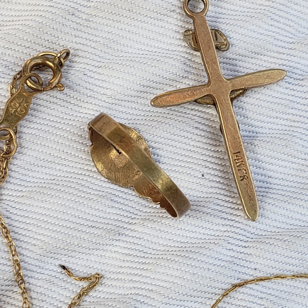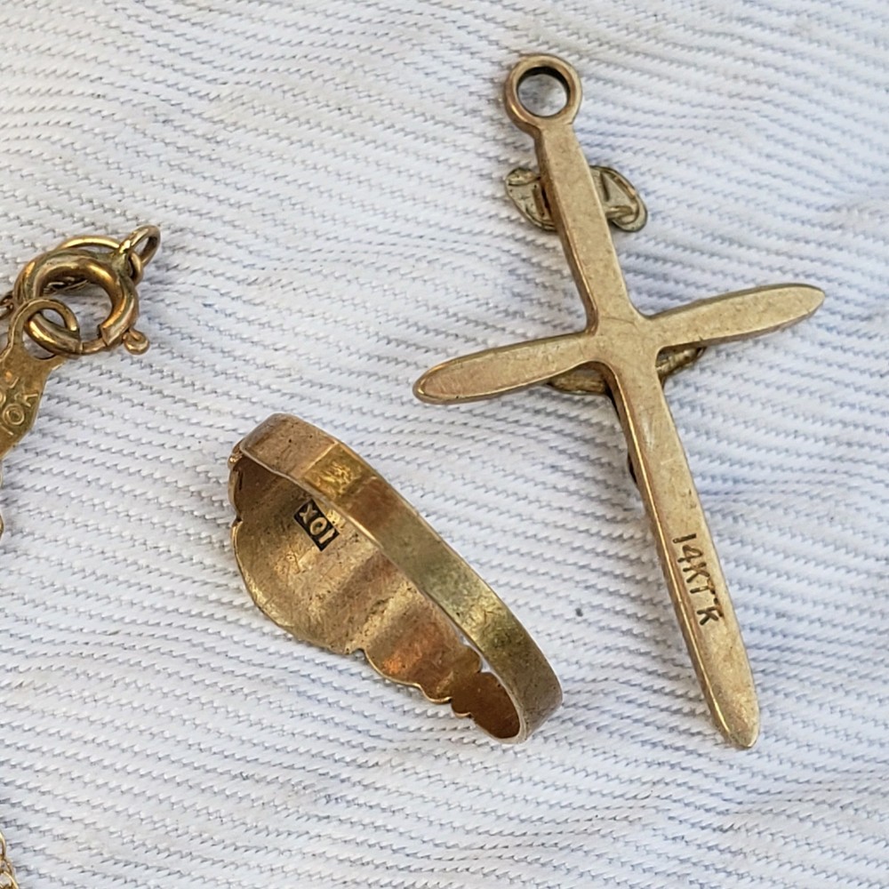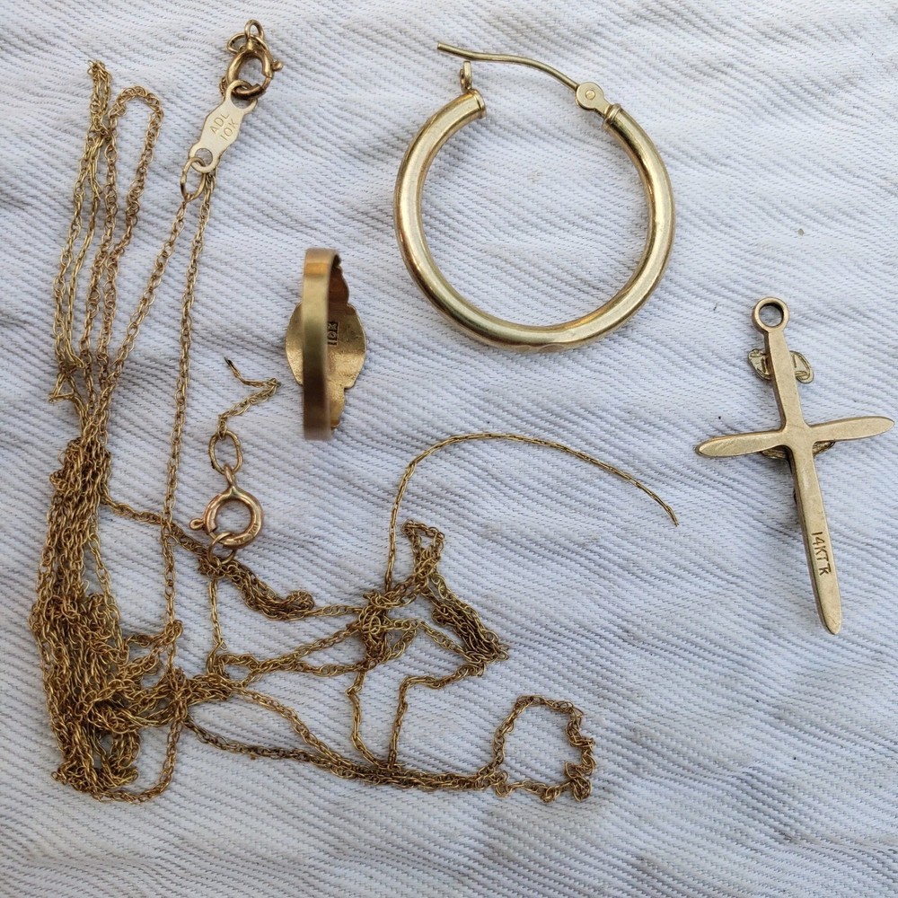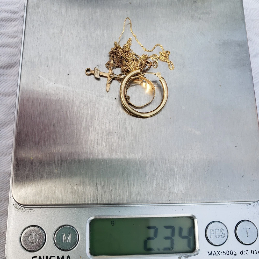The product is a mixed lot of 14K and 10K yellow gold jewelry, including necklaces, earrings, a gold cross, and a baby gold ring. The lot consists of 5 pieces, with one 10K necklace being broken. the Lot weighing 2.34 grams. The pieces are all made of yellow gold and have a high level of purity. The lot does not include any antique pieces. Being sold AS-IS for repair or scrap. thank you.
