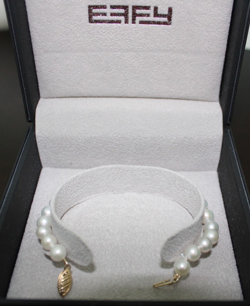 14-karat yellow gold Lustrous round white freshwater pearls 6-6.5mm Bracelet is 7.5 in long Filigree clasp