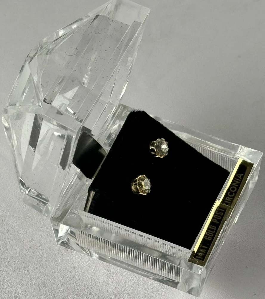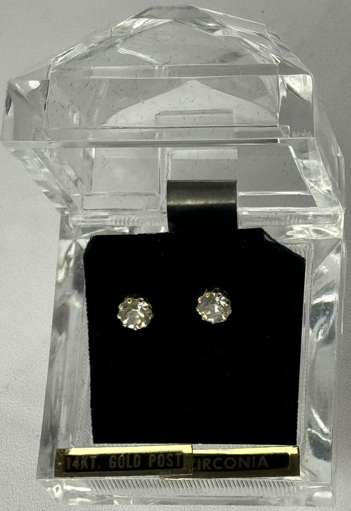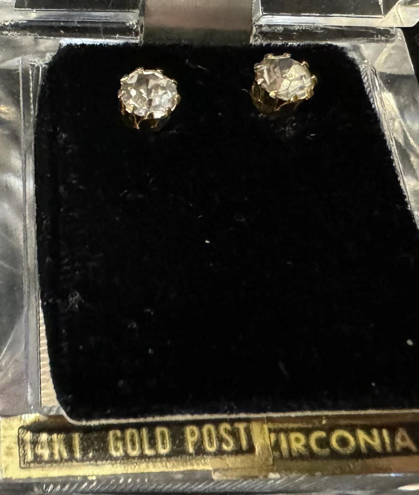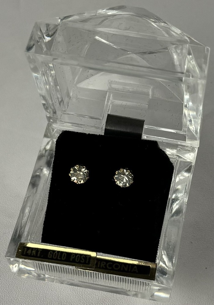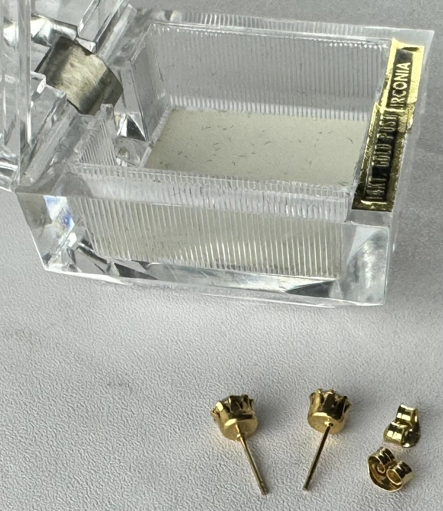 Approximately (not exact) 1/4” wide cubic zirconia stud earrings. 14k gold plated with jewelry box.