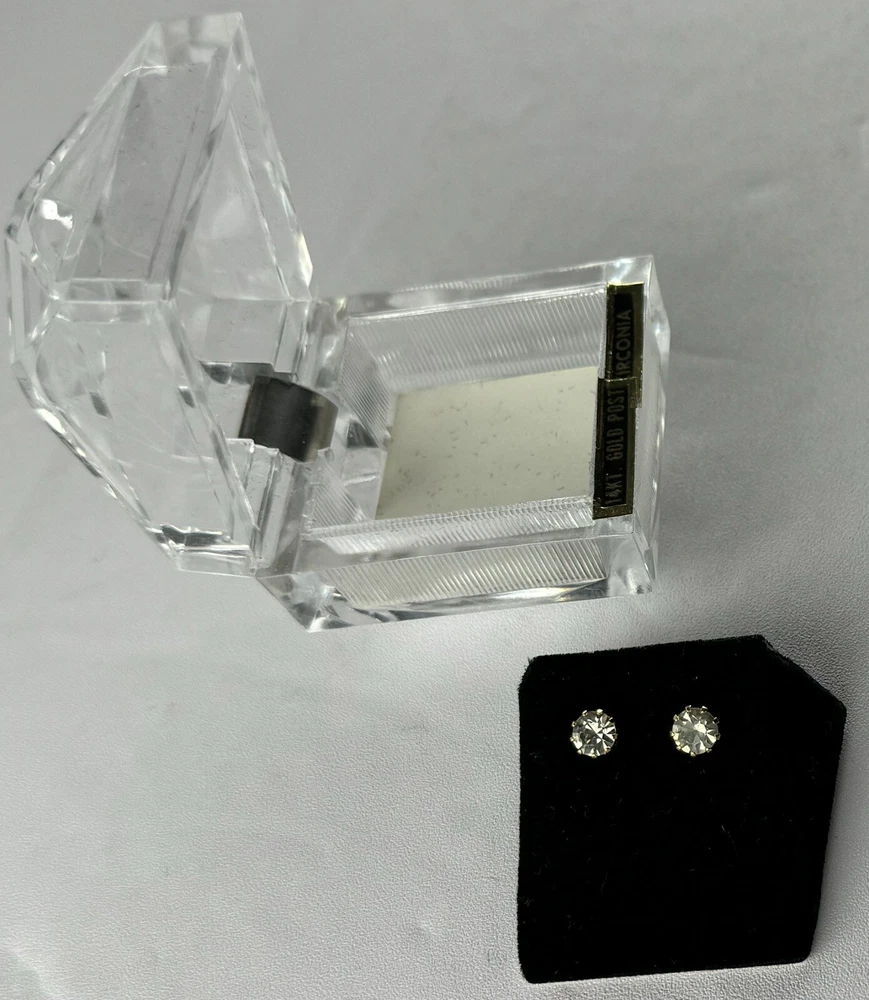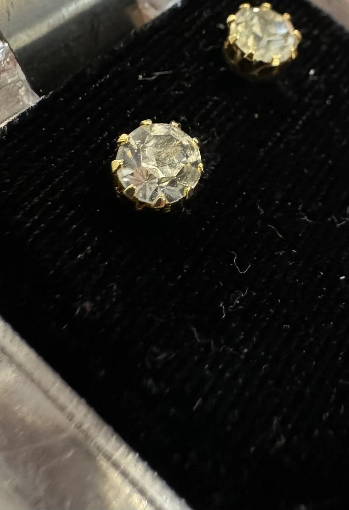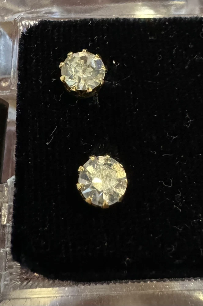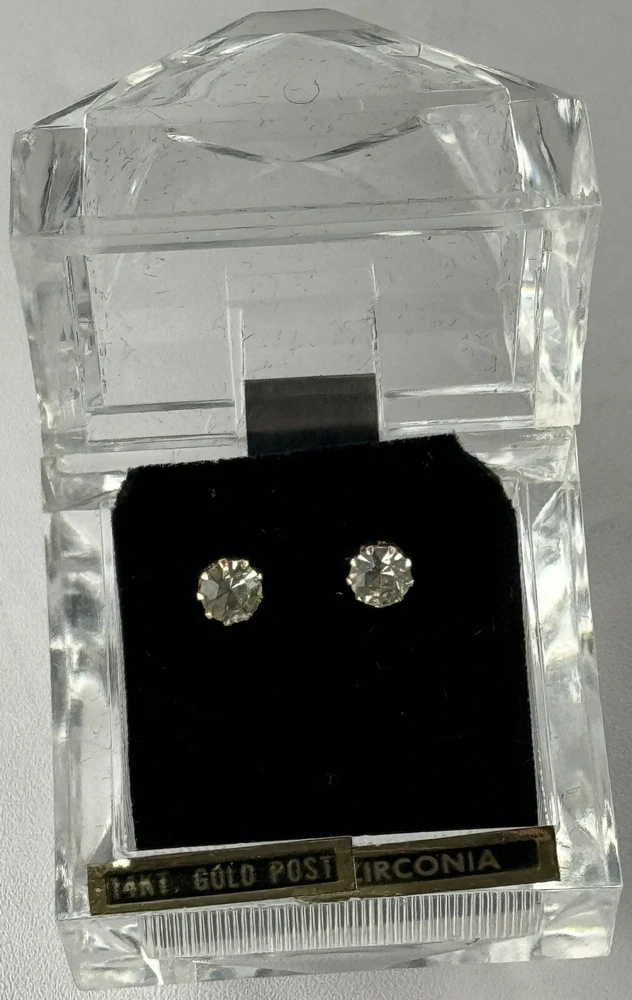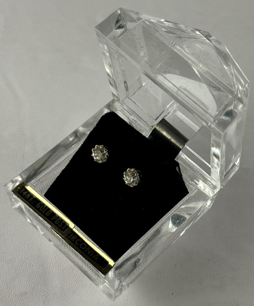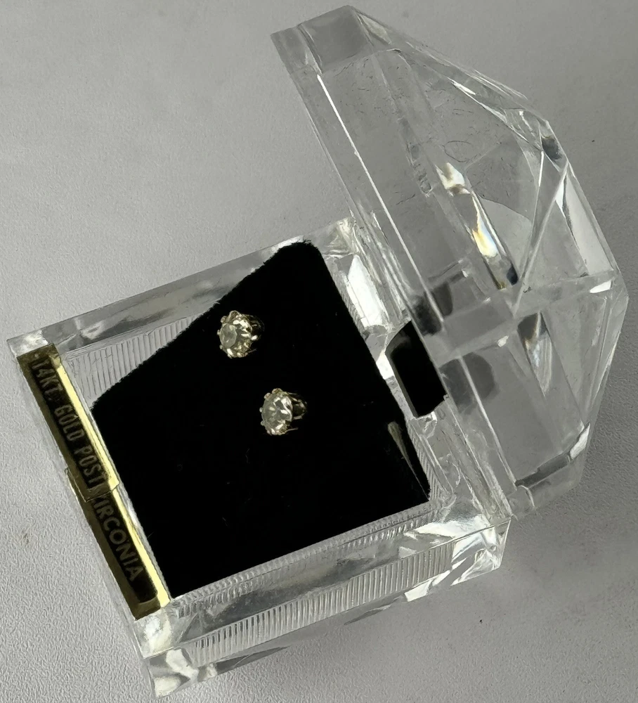 Approximately (not exact) 1/4” wide cubic zirconia stud earrings. 14k gold plated with jewelry box.
