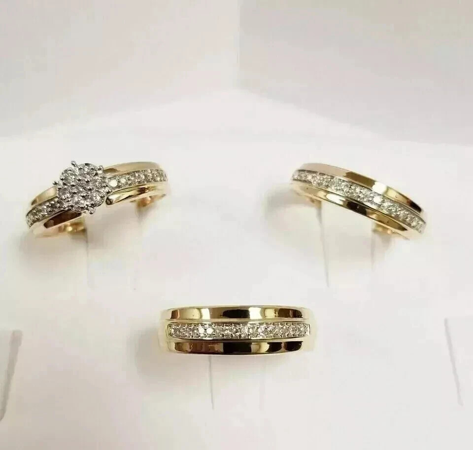 Elevate your special moments with the exquisite 14K Yellow Gold Plated Wedding His & Her Trio Ring Set. The ensemble features a trio of rings, each boasting a round, lab-created diamond with a D color grade and VVS1 clarity, ensuring a flawless and sparkling display. The prong setting style securely holds the diamonds in place, reflecting the couple's enduring love and commitment. Designed for both beauty and durability, the rings are crafted from high-quality 14k yellow gold-plated sterling silver, with the option for personalization to make this set uniquely yours. Whether celebrating an anniversary, birthday, or any significant occasion, this ring set will serve as a timeless symbol of your journey together.
