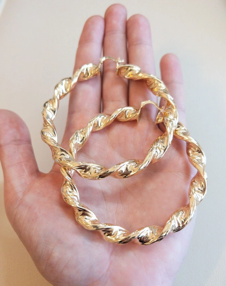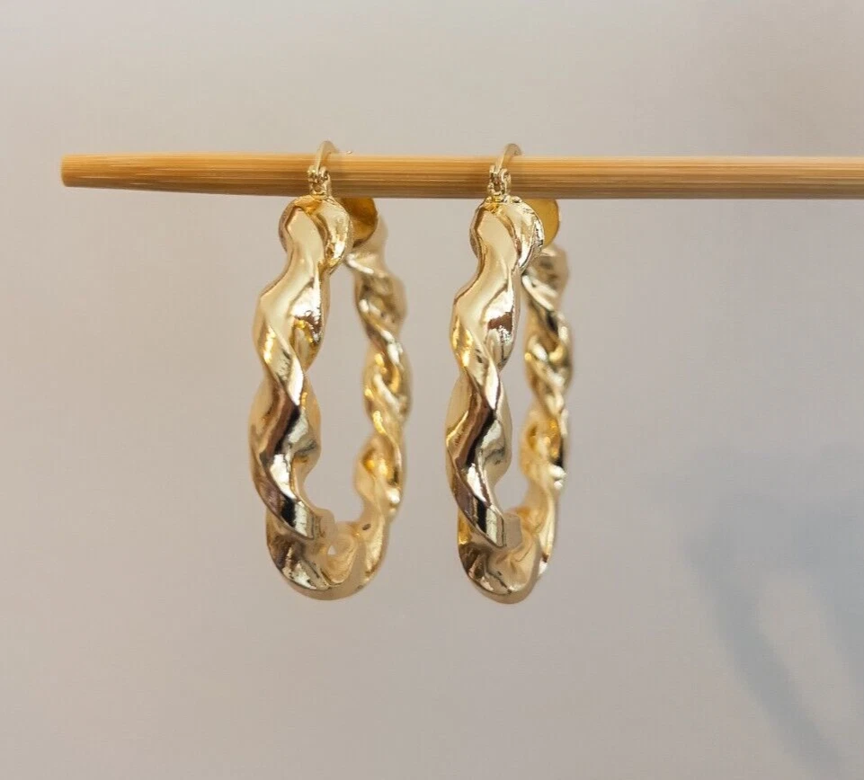 Elevate your style with these stunning gold-filled hoop earrings. Crafted with meticulous attention to detail, these earrings feature an intricate twisted design that adds texture and dimension to any outfit. The hoops are medium-sized, making them perfect for both everyday wear and special occasions. The gold-filled material ensures durability and a long-lasting shine, giving you the luxurious look of gold without the hefty price tag. These earrings are lightweight and comfortable to wear, with a secure clasp that keeps them in place all day. Add a touch of elegance and sophistication to your jewelry collection with these exquisite gold-filled hoop earrings. Features : Material: Gold-filled Design: Twisted texture Size: Medium Closure: Secure clasp Lightweight and comfortable Perfect for everyday wear or special occasions Dimensions: Diameter: Approximately 2.75 inches Why Choose Gold-Filled? Unlike gold-plated jewelry, gold-filled pieces are created with a thicker layer of gold, ensuring a longer-lasting finish that resists tarnish, flaking, and wear. With proper care, these earrings will maintain their beauty for years to come.