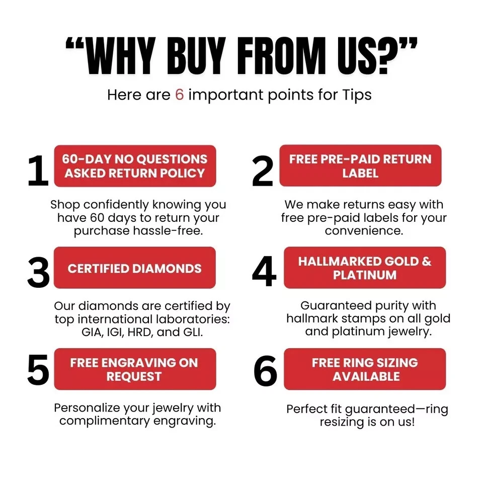 Diamond43 VISIT THE Diamond43 EBAY STORE TO VIEW ALL ITEMS ABOUT US CUSTOMER FEEDBACK CONTACT US Diamond43 14K White Gold Wedding Eternity Band Round 3 Carat Lab Grown Diamond Sizes 6 7 8 check_circle 60-Day No Questions Asked Return Policy check_circle Free Pre-Paid Return Label check_circle Certified Diamonds check_circle Hallmarked Gold & Platinum check_circle Free Engraving on Request check_circle Free Ring Sizing Available Specifications Number of Diamonds NA Occasion Anniversary,Engagement,Wedding Main Stone Color NA Metal White Gold Secondary Stone Diamond Main Stone Diamond Personalize Yes Ring Size 8.5 Main Stone Treatment Not Enhanced Main Stone Shape Round Base Metal Gold Style Eternity Gemstone Clarity Grade Eye Clean Features Nickel-Free Handmade Yes Main Stone Creation Lab-Created Seller Warranty Yes Signed Yes Cut Grade Excellent Color NA Sizable Yes Material NA Total Carat Weight 3 Certification GEM Lab Diamond Clarity Grade Very Slightly Included (VVS2) Brand Diamond43 Setting Style Band Type Ring Metal Purity 14k Customized Yes Diamond Color Grade F Theme Beauty Country/Region of Manufacture India Country of Origin India Wholesale Yes Personalization Instructions 14/18K Yellow/Rose/White Gold and 950 Platinum options are available. All common ring sizes are available. Please contact us for any further customization request. Total Carat Weight 3.00 Carat Metal Type White Gold Metal Purity 14K Metal Authenticity BIS Hallmarked Stamp Diamond Type Lab Grown / Lab Created Diamond Color F Diamond Clarity VVS2 Diamond Cut Excellent SKU Code ENB-016 About Diamond43 Crafting a Legacy of Artisanal Jewelry We specialize in any type of jewelry that you can imagine. You imagine it and we will make it exactly the same. When you work with our company the only limit there is, is your imagination. We have over 6 decades of experience in Jewelry Manufacturing. We also deal in wholesale and export of 14K,18K and Platinum Jewelry handmade and machine made Gold and Platinum Diamond Jewelry. Best Quality, Certified and Guaranteed Low Prices. Shipping Policy Description Payment Policy Description Return Policy Description Shipping: "Experience swift and secure shipping worldwide! Choose from shipping options like FedEx, USPS, or Registered Post. Enjoy Free Standard Shipping on eligible products, making global delivery convenient." Customs Note: "International shoppers, take note! Some countries may impose additional customs fees, especially in Europe. Buyers are responsible for these charges. For more details, please check with local customs authorities. If returning an item, buyers are responsible for return shipping duties levied in the seller's country." Payments: "Seamless and secure payment options await you! We accept PayPal, MasterCard, Visa, Google pay on ebay check out page and more. Shop with confidence and convenience." Returns & Refunds: "Your satisfaction is guaranteed with our 30-day money-back return(or exchange) policy. WE PROVIDE PRE PAID LABEL IN USA AND UK.