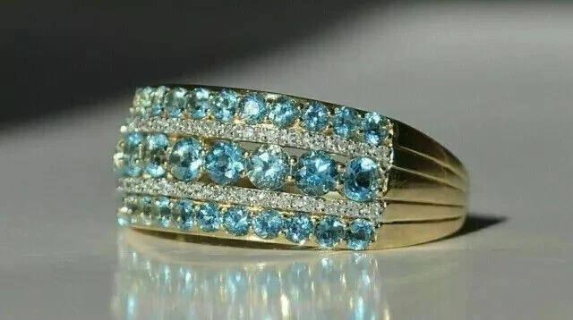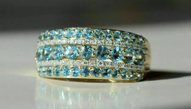 14K Yellow Gold Plated 4Ct Round Cut Simulated Blue Topaz Engagement Band Ring