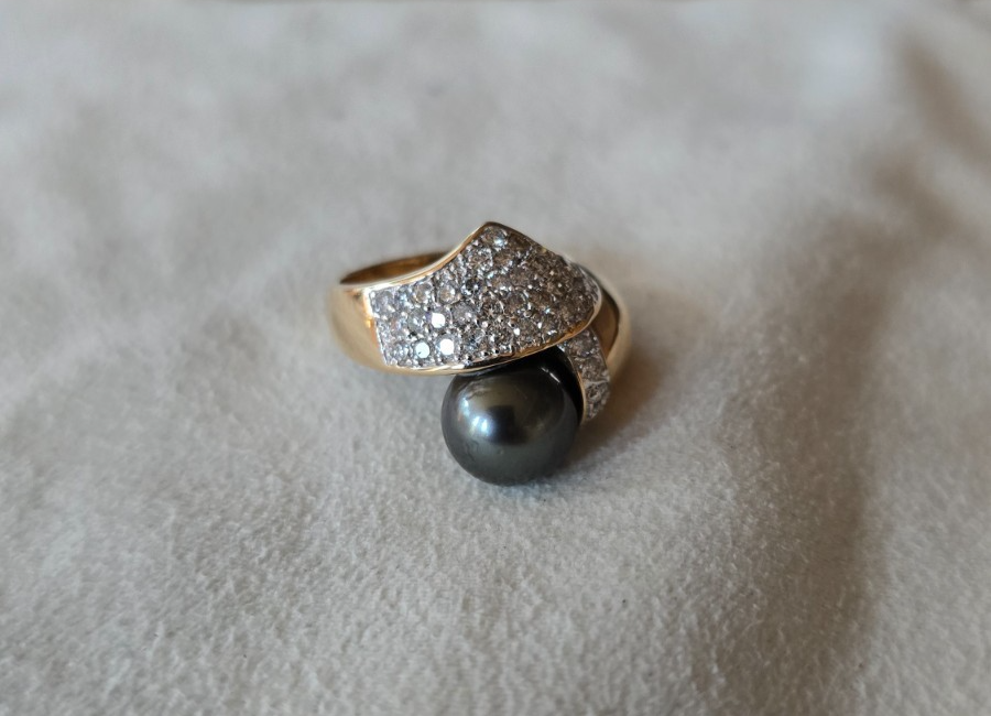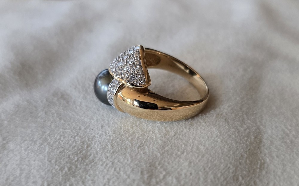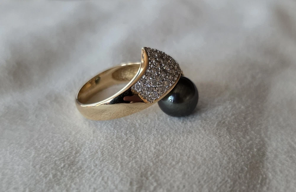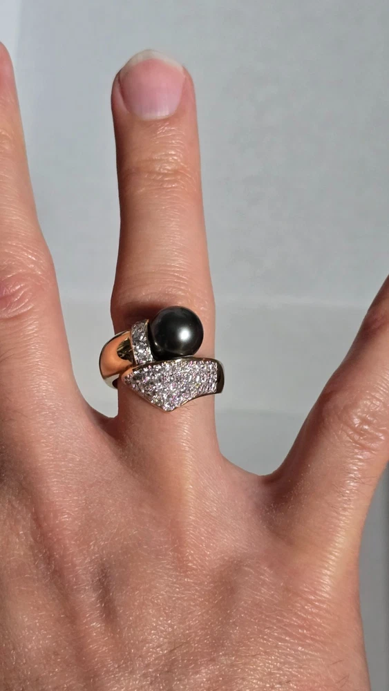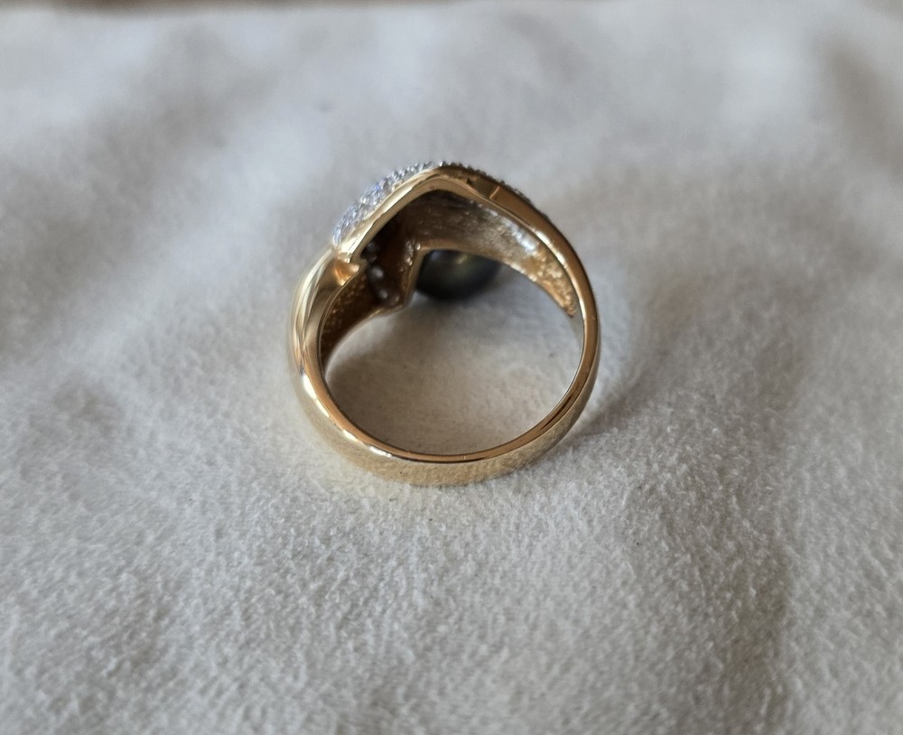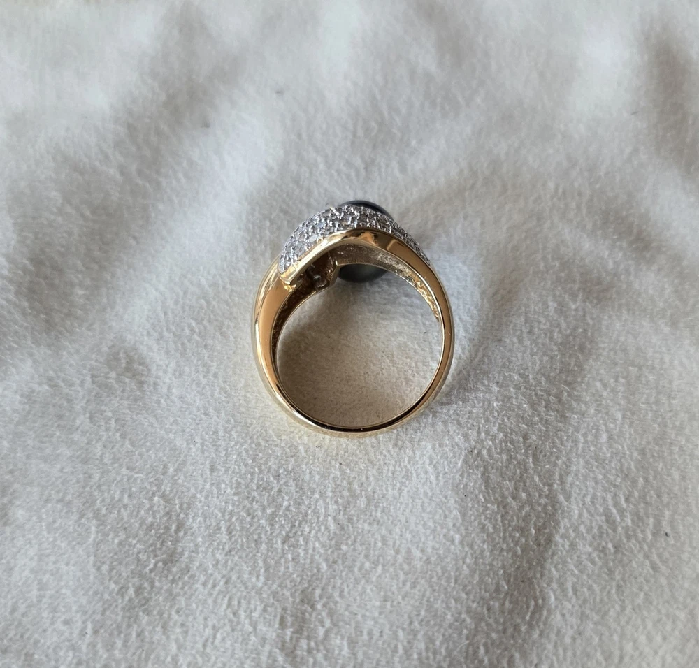 This beautiful cocktail ring is crafted in solid 14K yellow gold and has a bright and shining Tahitian pearl as its centerpiece, valued for its rich natural color and elegant shine. Accented with many sparkling diamonds, this design offers an eye-catching contrast between its rich gold, luminous pearl, and shining diamond highlights. Bold and refined, this sophisticated ring is perfect for elegant evenings and formal occasions. Weight: 9.5 Grams Stone: Tahitian Pearl (9.8 mm) & Approx 0.86 TCW (0.02-0.03 ct) H/I VS-SI Diamonds Face of Ring: 23.5 x 18.8 x 9.8 mm Ring Size: 8.5 Hallmark: 14K